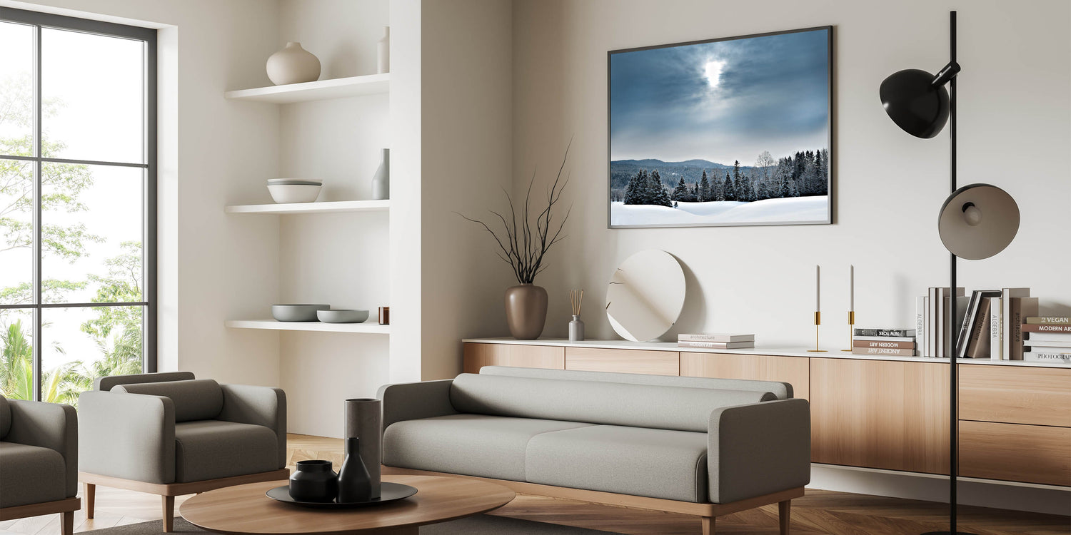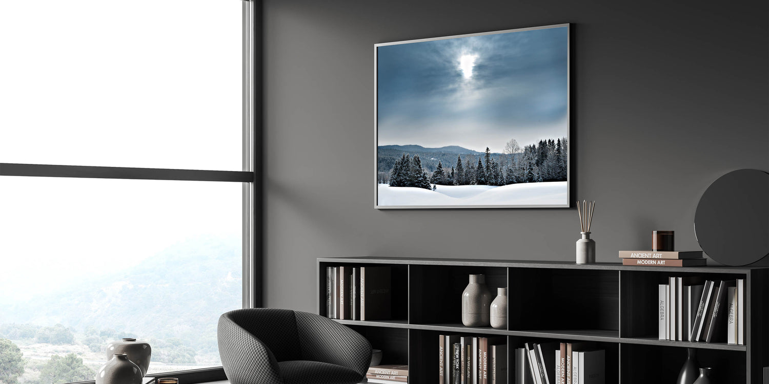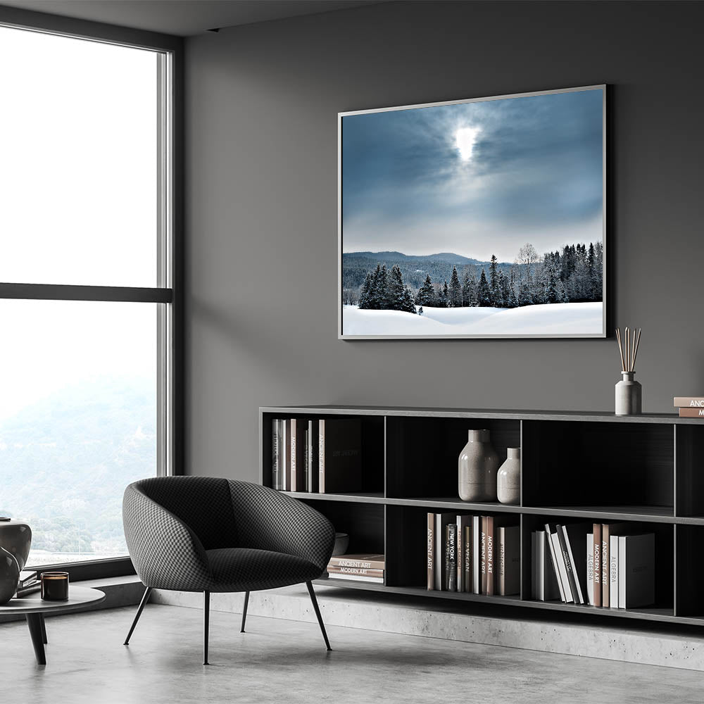 Embrace the peaceful beauty of a Vermont winter with this stunning wall art showcasing snow-covered pine trees against a backdrop of rolling mountains. This Vermont scenic art captures the calm and tranquility of a snowy landscape, with soft light filtering through the clouds and gently illuminating the forest. Perfect for those who appreciate the quiet elegance of winter, this Vermont winter art will bring a sense of calm to any space.