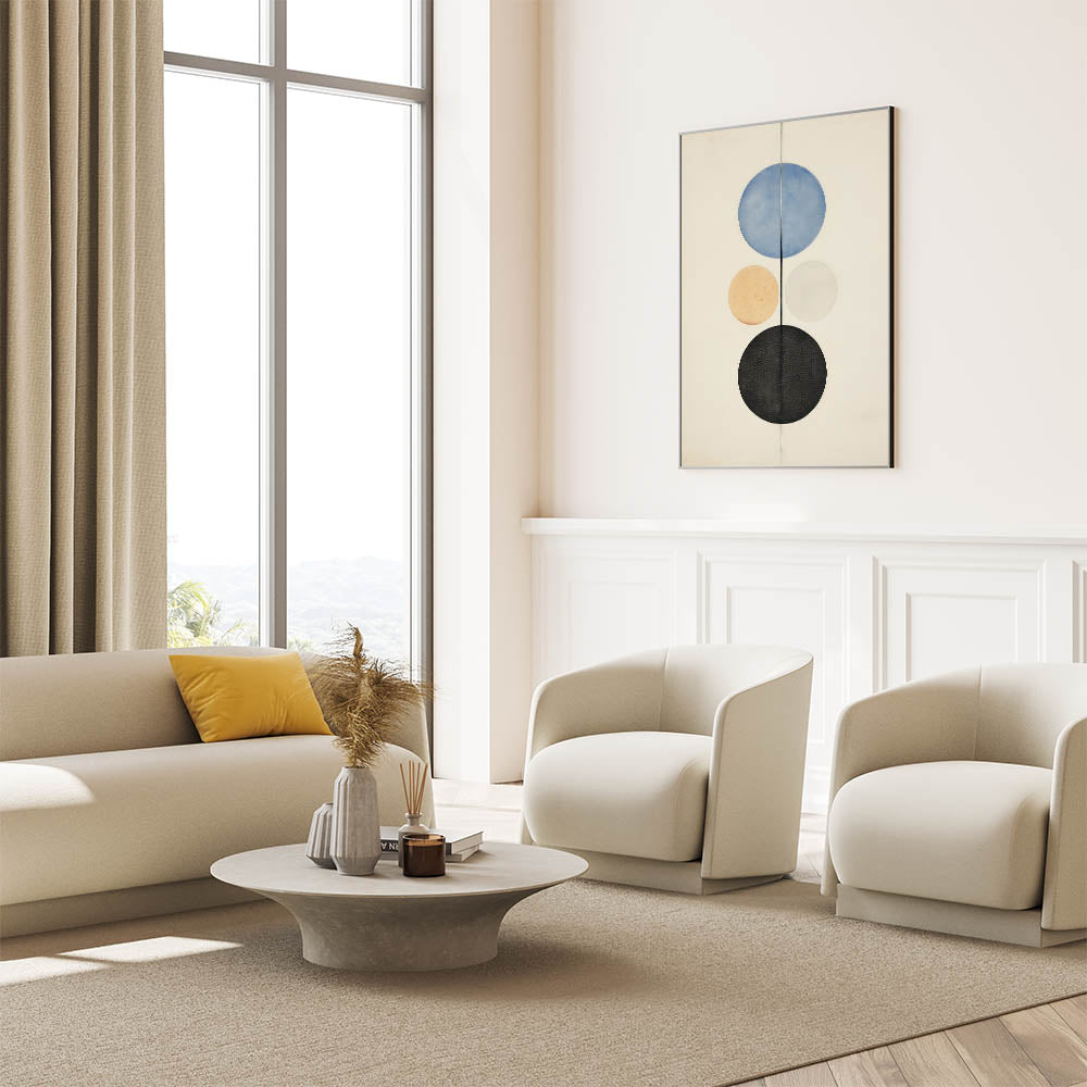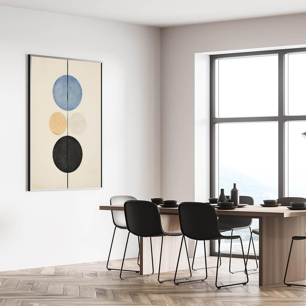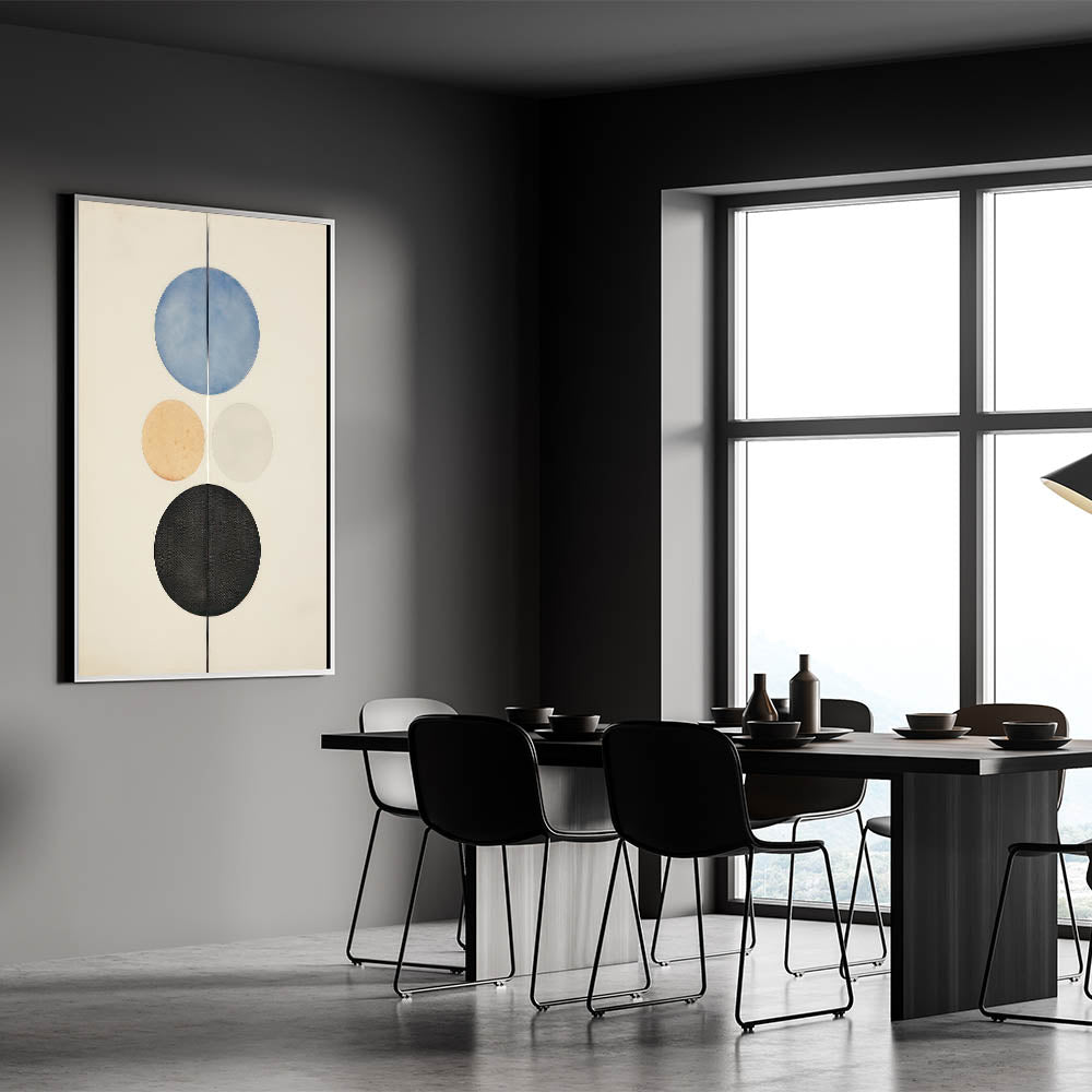 Transform your space with this minimalist geometric electric wall art, showcasing a vertical arrangement of circles in various sizes and colors, including shades of blue, black, beige, and gray. The composition, with its clean lines and balanced symmetry, adds a touch of modern elegance to any room. Ideal for those who appreciate contemporary and minimalist aesthetics, this piece works well in living rooms, offices, or creative spaces.