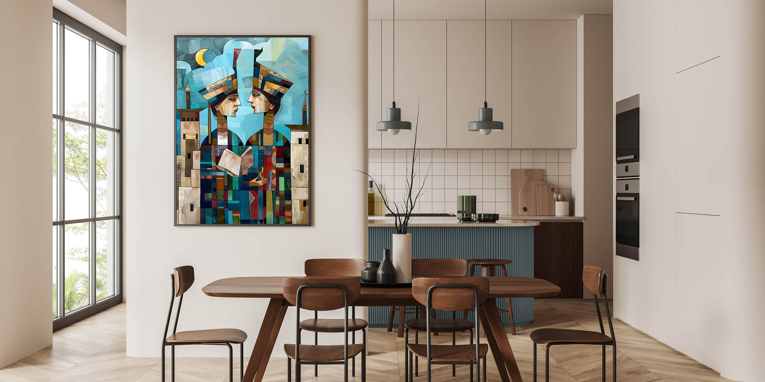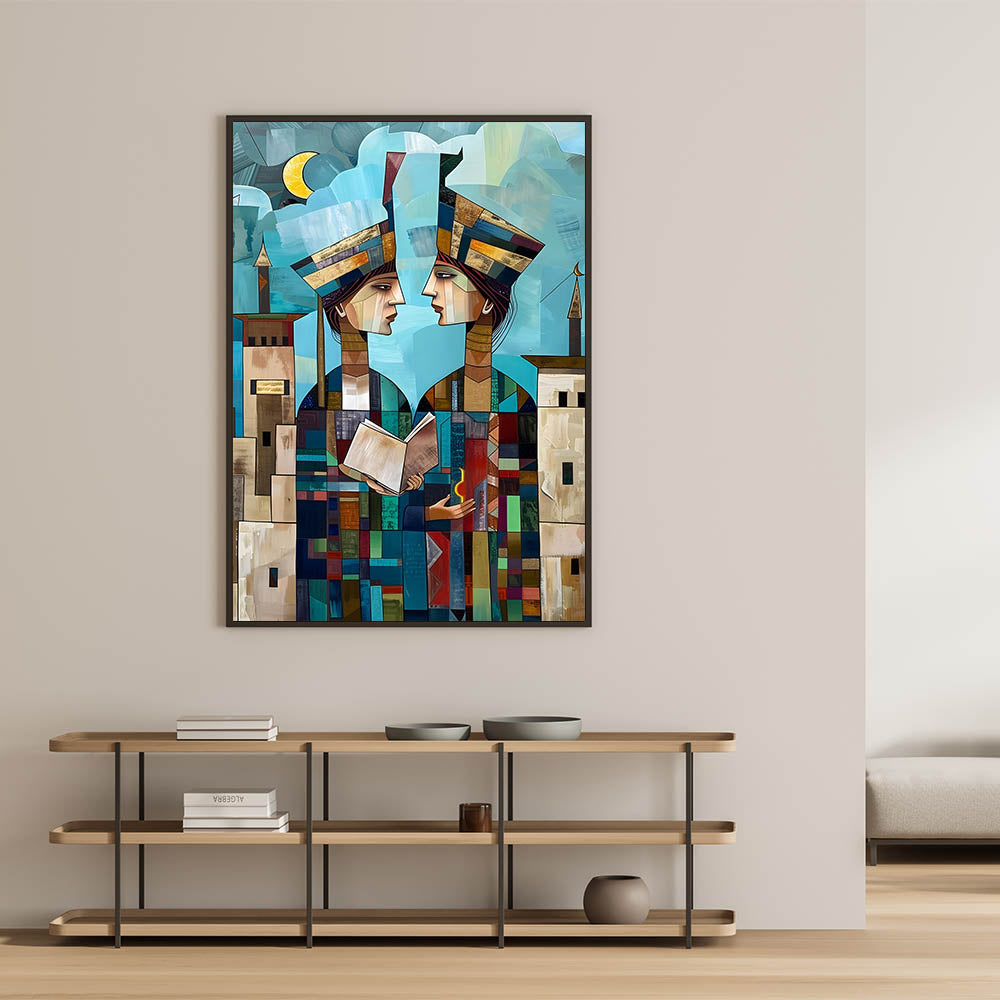 Explore the rich cultural history of Mesopotamia through this captivating Abstract Mesopotamian Scholars wall art. The two figures, depicted in a modern, geometric style, are shown holding a book and a symbol of light, symbolizing knowledge and wisdom. The layered shapes and vibrant colors add depth to the artwork, while the background features soft blue skies and architectural elements that reflect the ancient Middle Eastern landscape. This piece beautifully merges history and contemporary design, offering a unique blend of cultural significance and artistic expression.