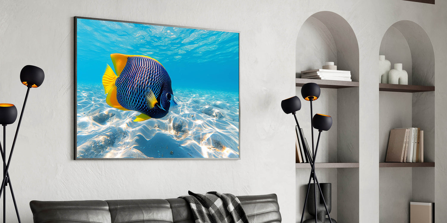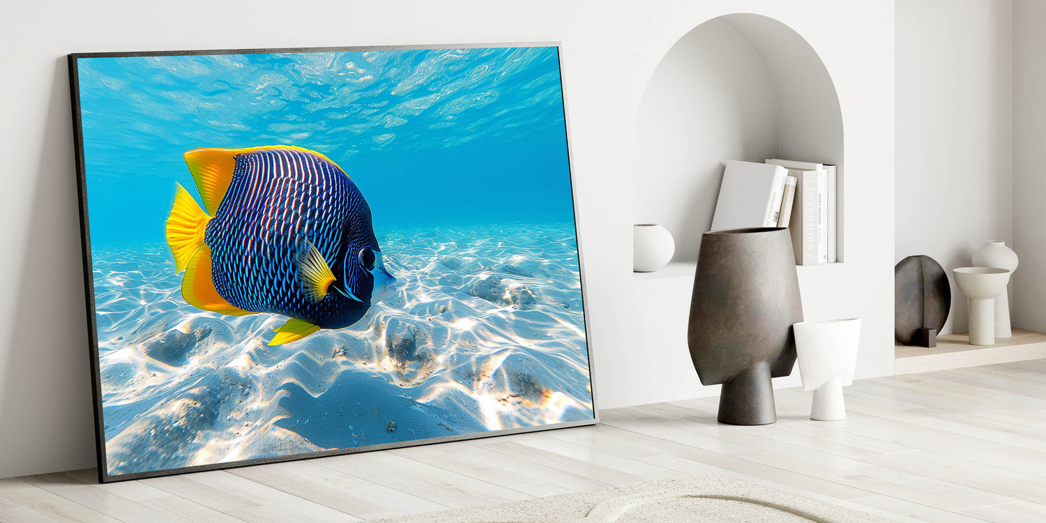 - High-quality angelfish canvas print, available in Stretched Canvas, Framed Canvas, Acrylic Glass, and more.