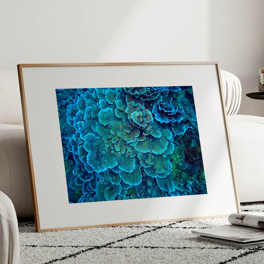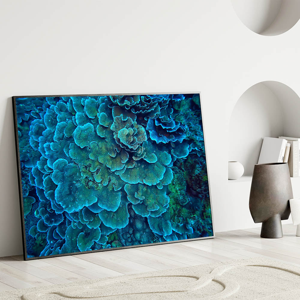 Immerse your space in the rich colors of the ocean with this Vibrant Blue-Green Coral Wall Art. This artwork captures the stunning details of coral formations, blending shades of blue and green to create a captivating and serene underwater scene. Perfect for marine life enthusiasts and those who love to bring the beauty of the sea into their homes, this piece offers a striking focal point that enhances any room.