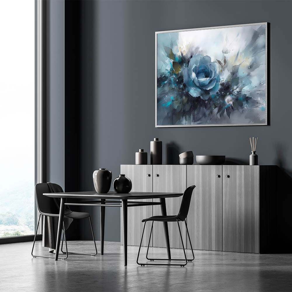 This stunning blue rose wall art captures the essence of movement and color, with swirling hues of blue, white, and teal creating a dynamic and energetic atmosphere. The bold blue rose stands out against the misty, ethereal background, making it a perfect piece for adding a modern and artistic touch to your space. This vibrant floral canvas print is ideal for living rooms, bedrooms, or creative spaces where you want to evoke a sense of fluidity and artistic expression.