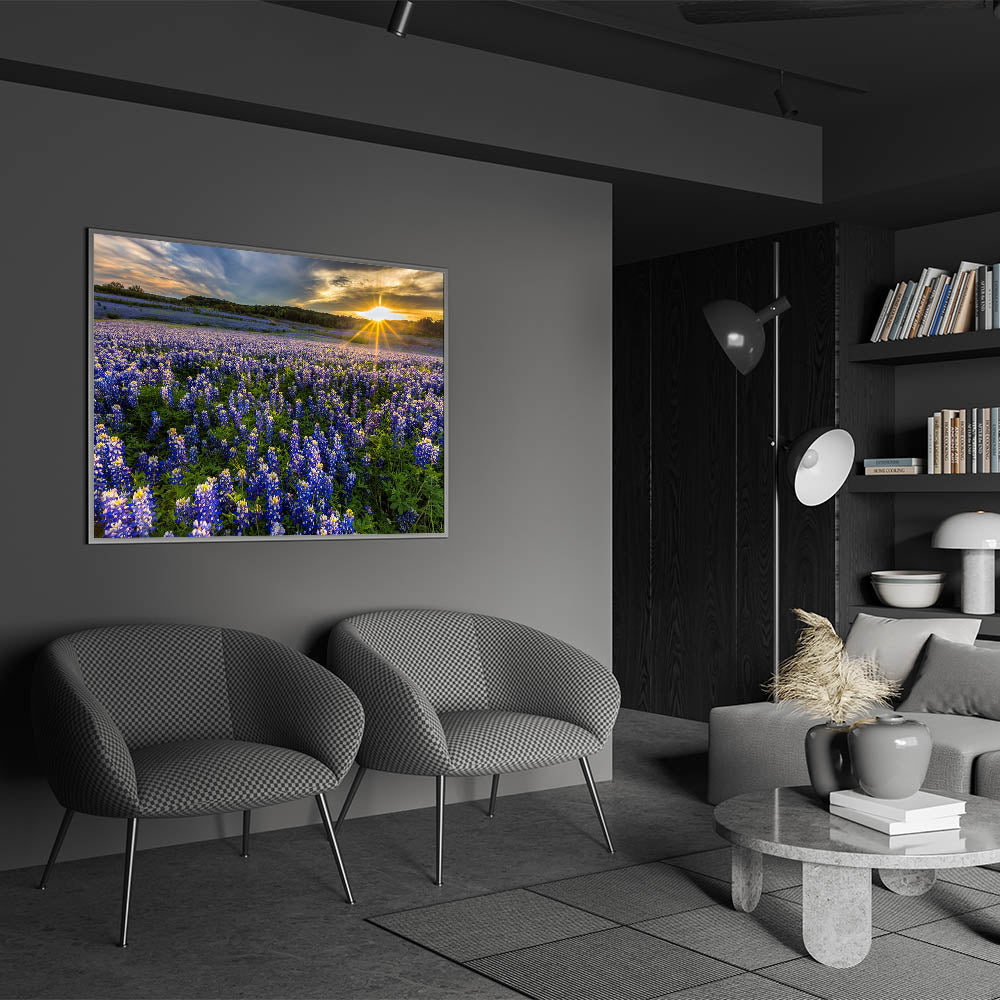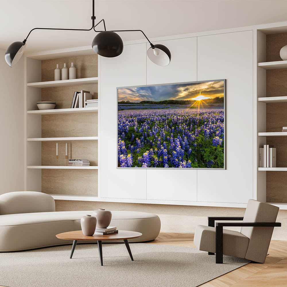 Capture the breathtaking beauty of a Texas sunrise over a vibrant field of Bluebonnets with this stunning wall art. The glowing sunlight filters over endless rows of blooming Bluebonnets, creating a serene and awe-inspiring landscape that will brighten any room. This nature-inspired wall decor brings the spirit of Texas wildflowers into your space, perfect for adding a peaceful, yet striking, touch to your home.