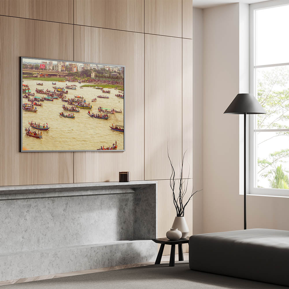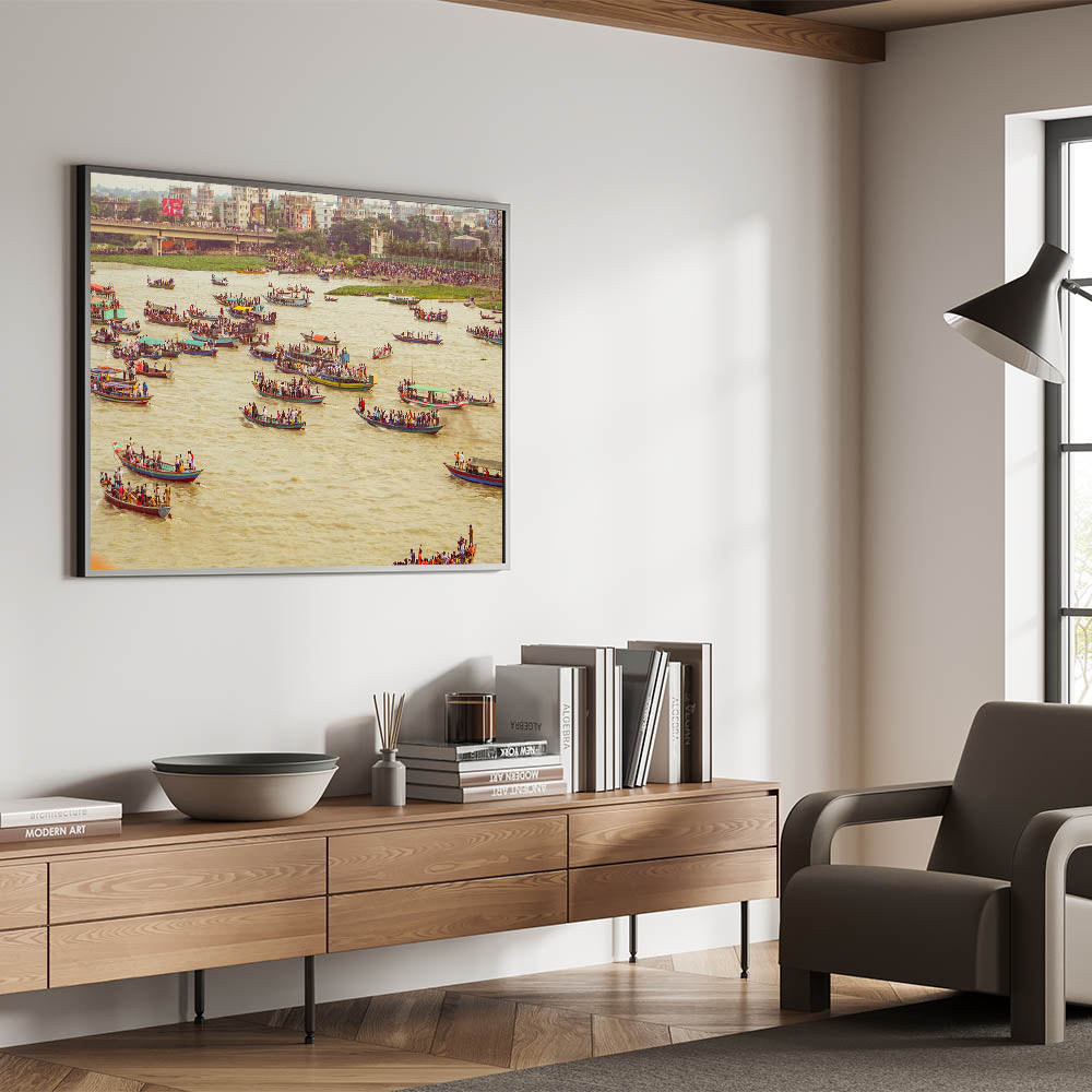 Immerse yourself in the lively spirit of Bangladesh with this dynamic wall art, featuring a vibrant boat festival on the river. The artwork captures the bustling energy of the event, where boats packed with people create a colorful tapestry across the water. The scene is rich with cultural significance, showcasing the joy and unity of the community as they celebrate together on the river. This piece is perfect for adding a touch of cultural vibrancy and movement to any space.