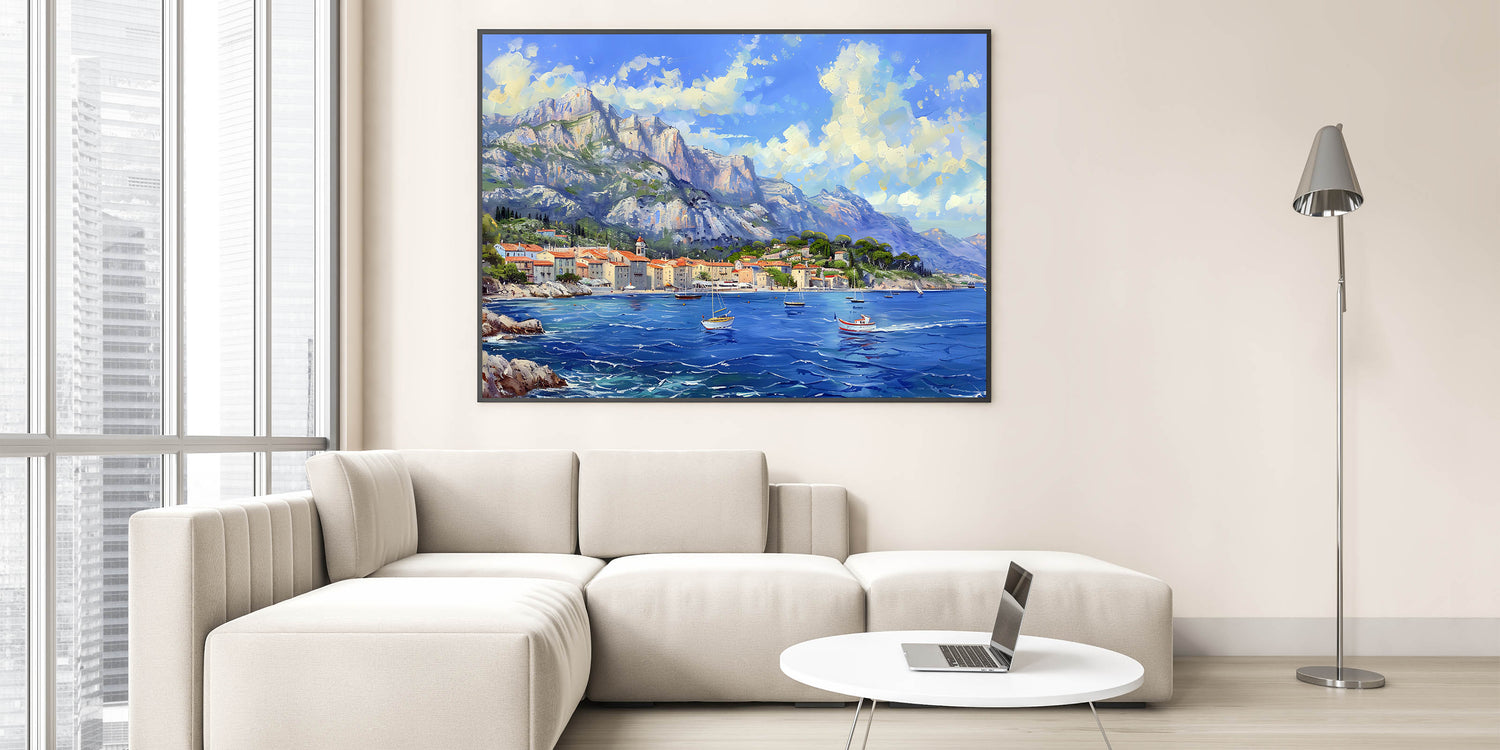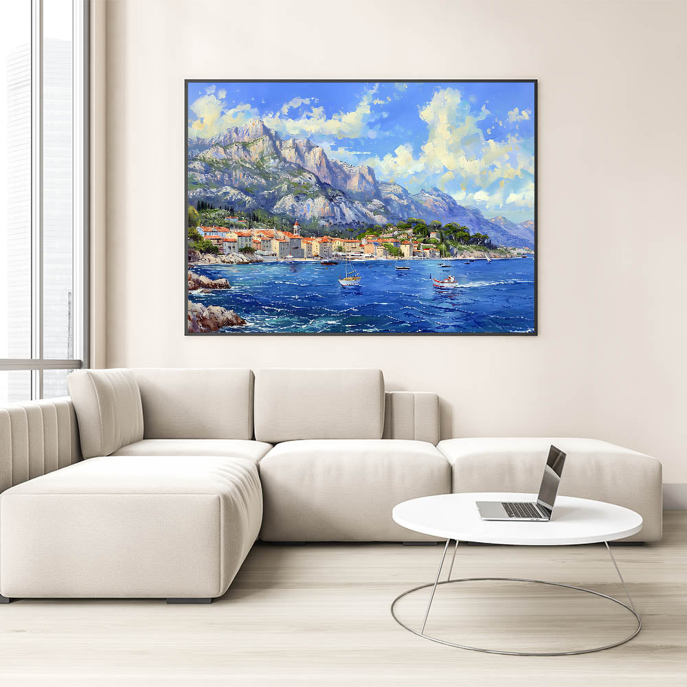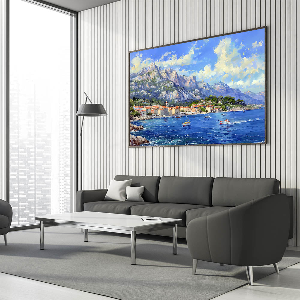 Step into the vibrant life of a Mediterranean coastal town with this stunning harbor wall art. The artwork is a vivid portrayal of a bustling seaside village nestled beneath majestic mountains, with colorful boats gently bobbing on the azure waters. The vibrant colors and dynamic brushstrokes capture the warmth and charm of the Mediterranean, making this piece a perfect addition to any room that needs a splash of color and energy.