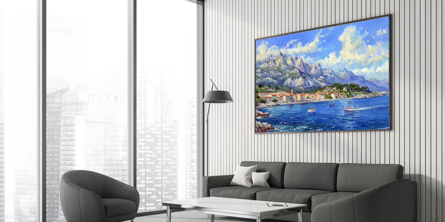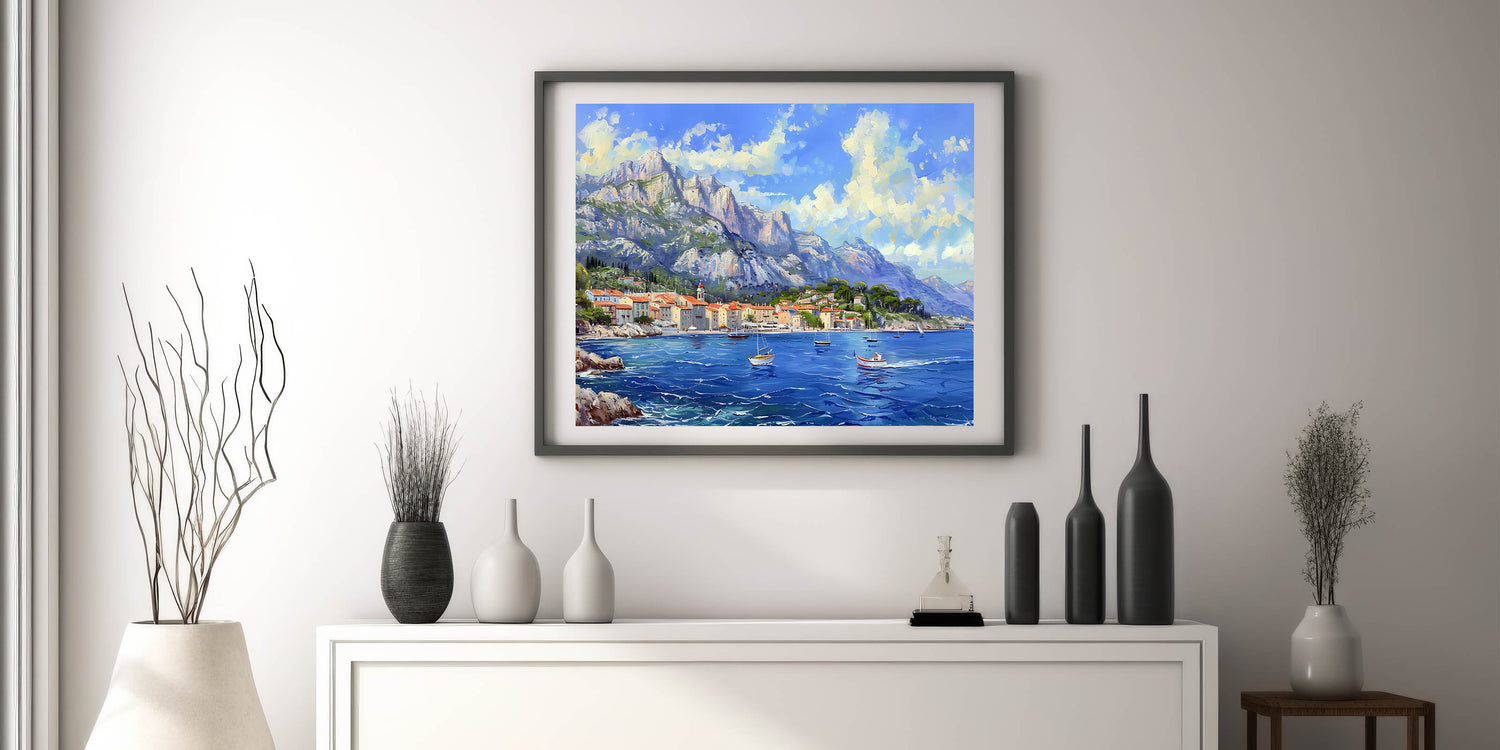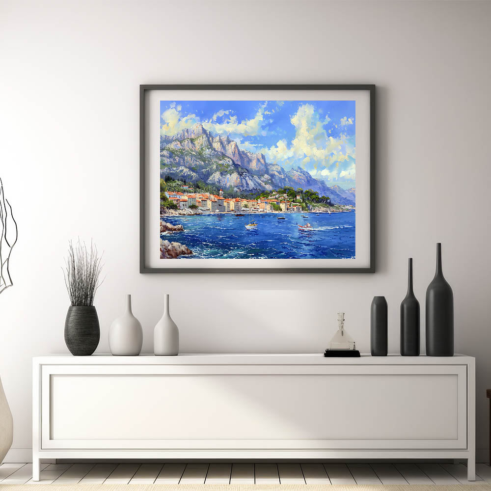 Step into the vibrant life of a Mediterranean coastal town with this stunning harbor wall art. The artwork is a vivid portrayal of a bustling seaside village nestled beneath majestic mountains, with colorful boats gently bobbing on the azure waters. The vibrant colors and dynamic brushstrokes capture the warmth and charm of the Mediterranean, making this piece a perfect addition to any room that needs a splash of color and energy.