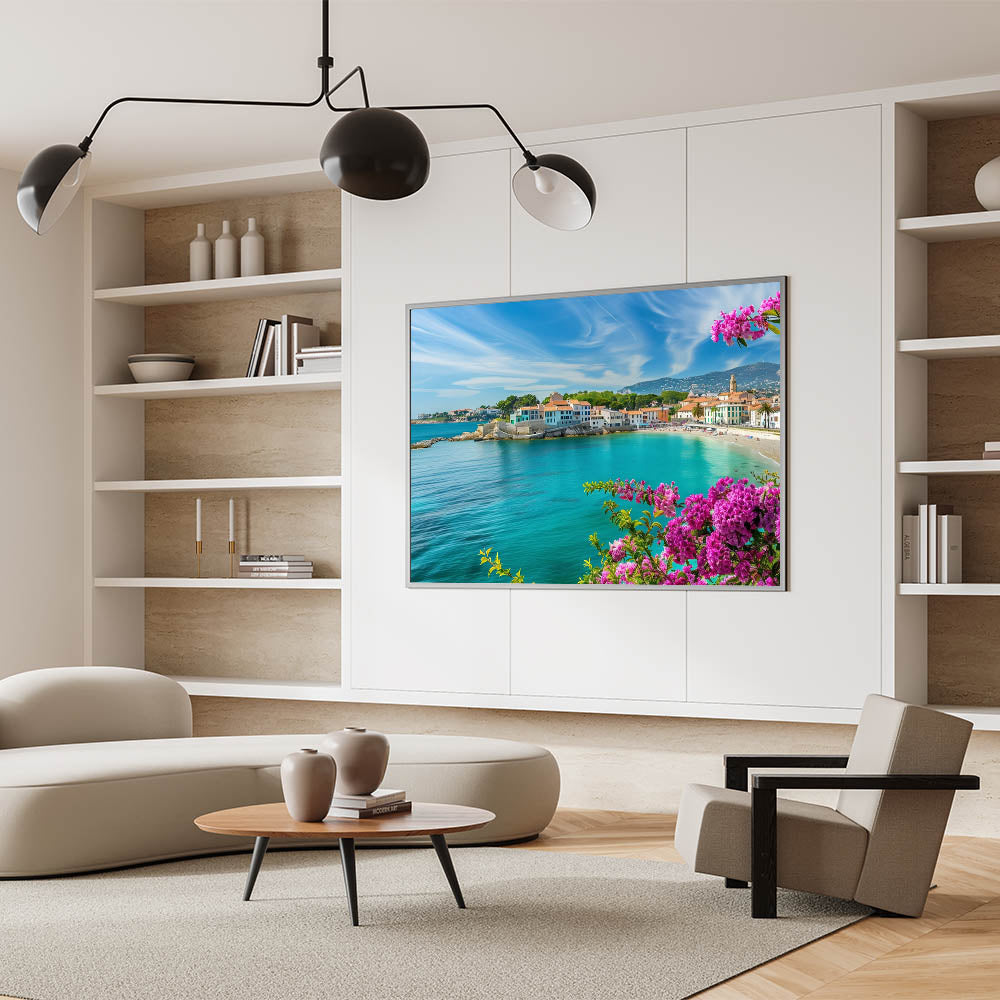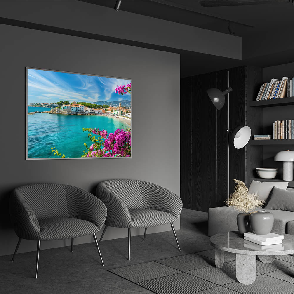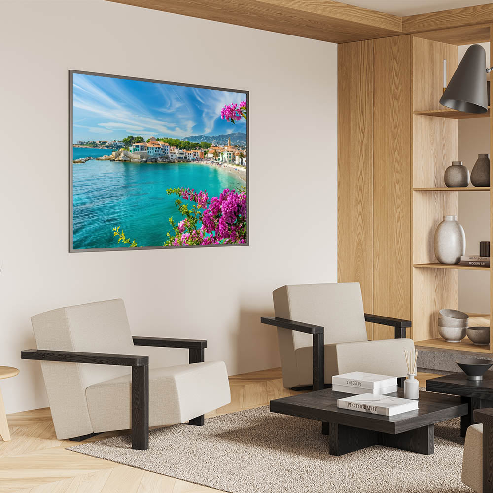 Bring the vibrant beauty of the Mediterranean coast into your home with this stunning village landscape painting. The artwork showcases a picturesque coastal village bathed in sunlight, with turquoise waters gently lapping against the shore. Framed by bright pink flowers, this scene captures the essence of Mediterranean charm and relaxation. The clear skies and vivid colors of the buildings create a lively, cheerful atmosphere that will brighten any room.