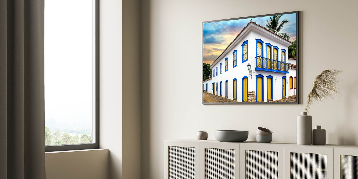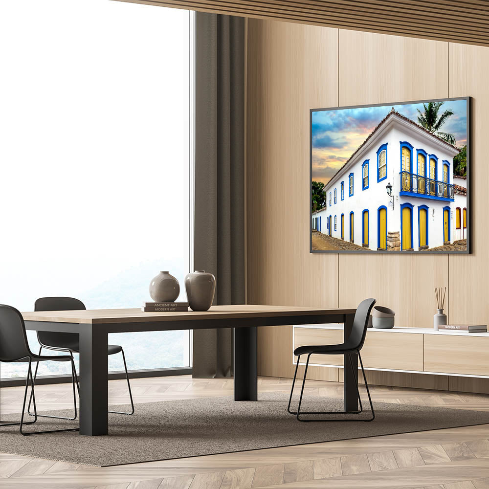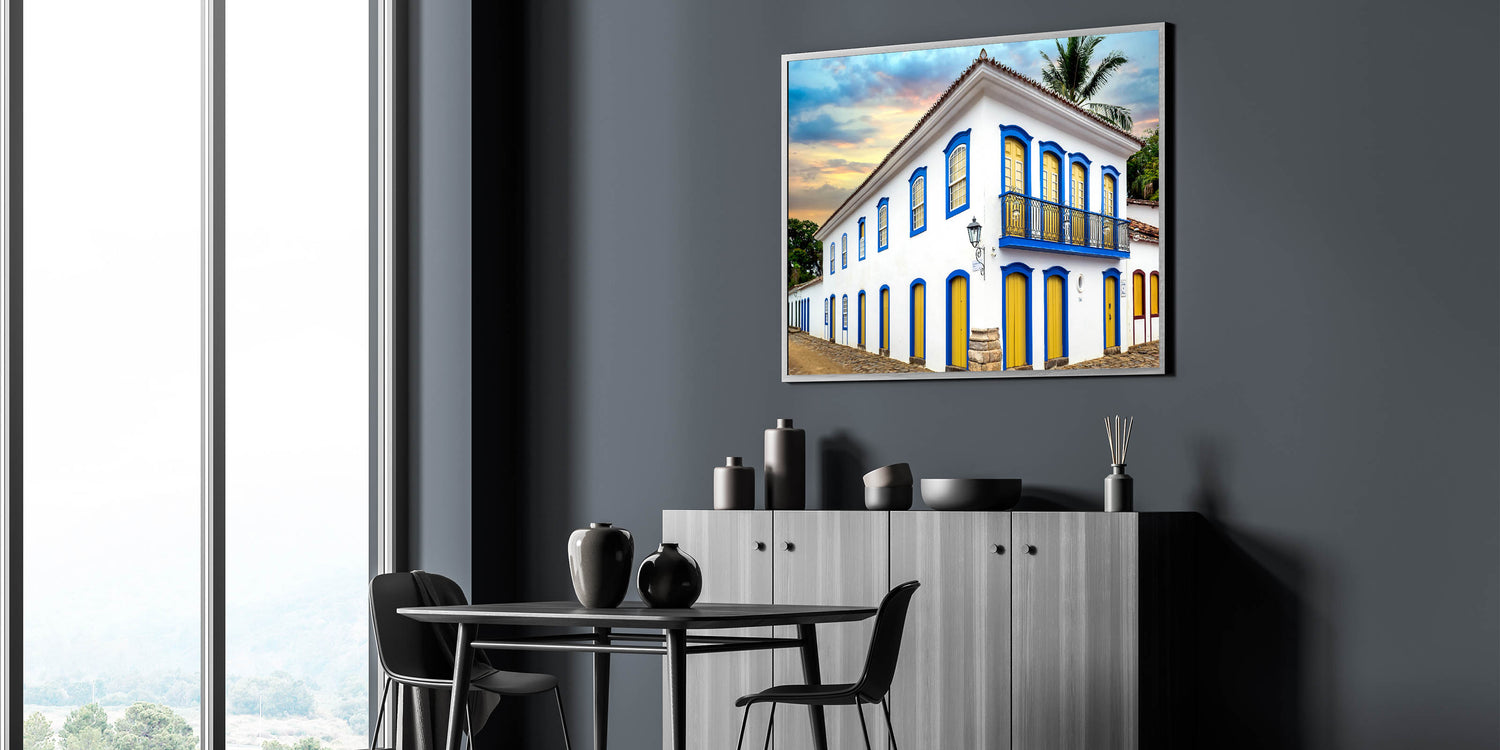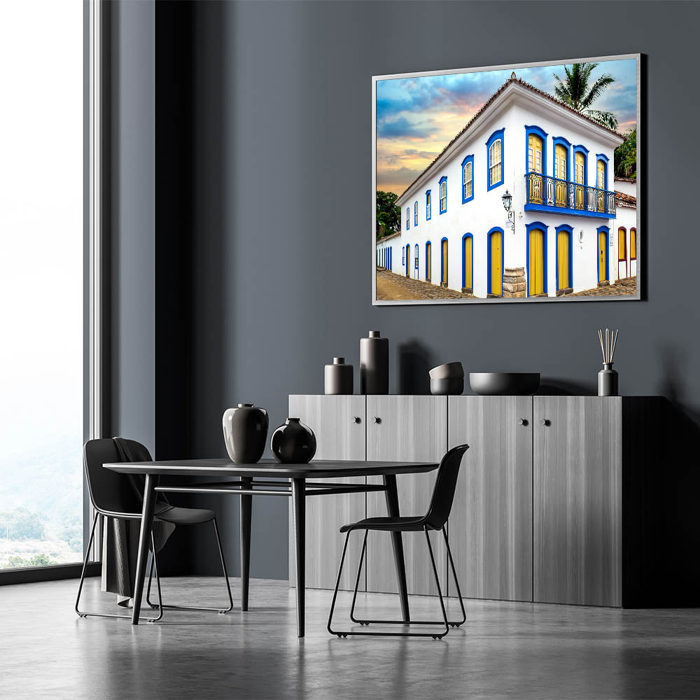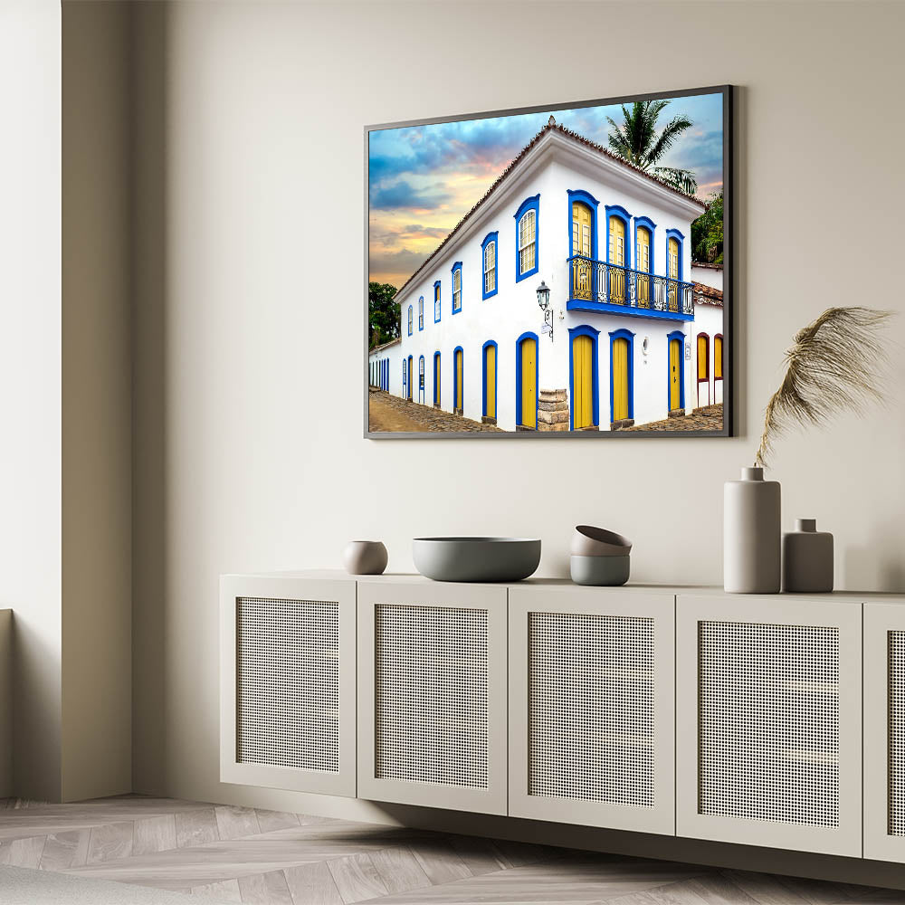 Add a touch of Brazilian heritage to your space with this vibrant colonial architecture wall art. The bold blue and yellow colors of the historic building capture the charm of Brazil’s colonial past, while the cobblestone street and elegant design offer a window into the country’s cultural richness. Perfect for those who appreciate Brazilian landscape prints, this piece will bring a bright and lively atmosphere to any room.