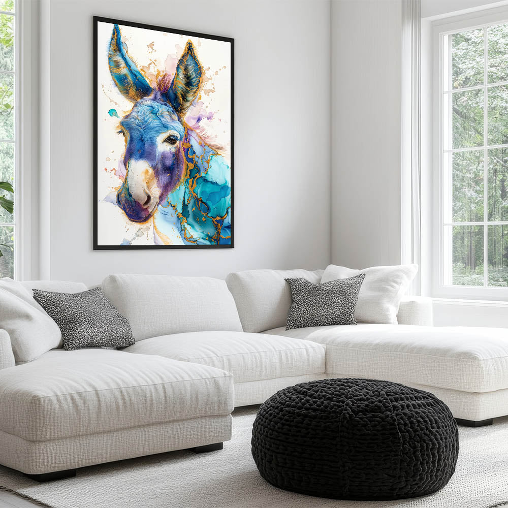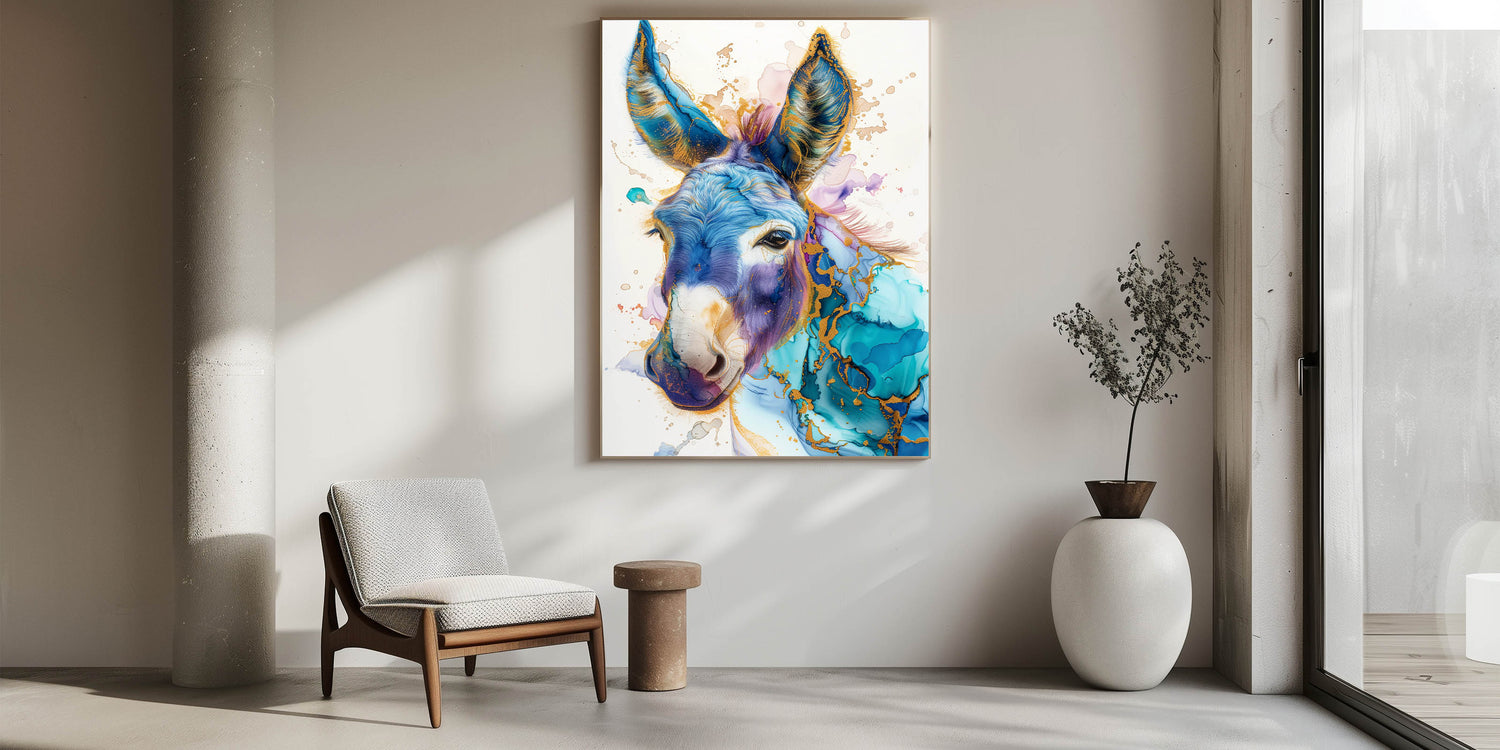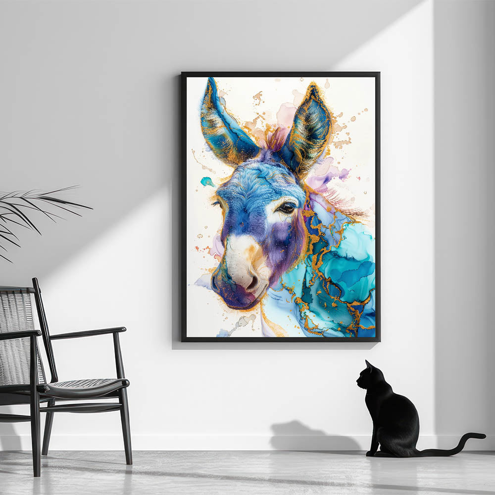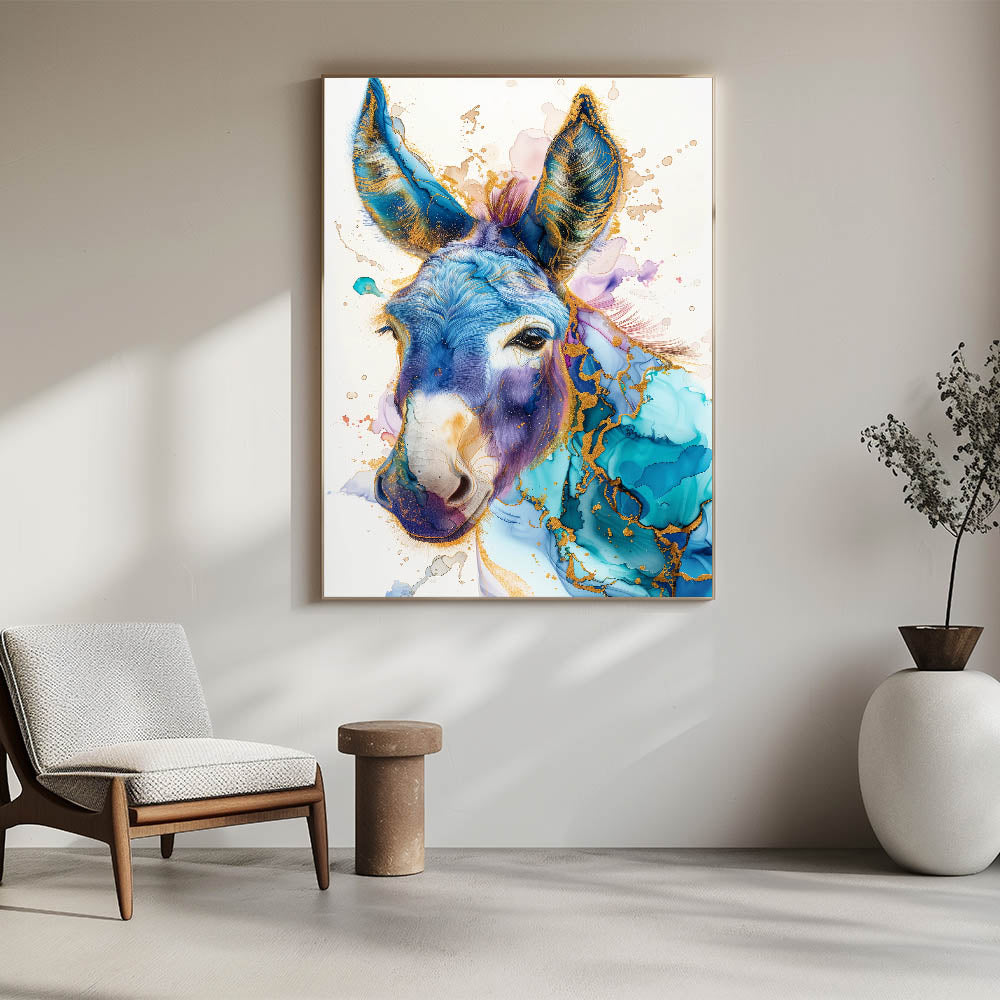 Transform your space with this stunning, abstract Donkey Wall Art. Featuring a mesmerizing blend of vibrant blue, gold, and purple hues, this artwork brings a bold and modern twist to traditional animal decor, making it a perfect statement piece for any room.