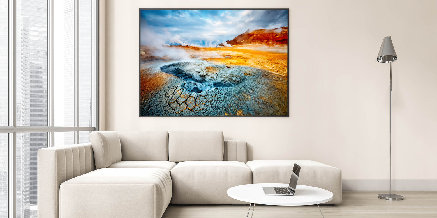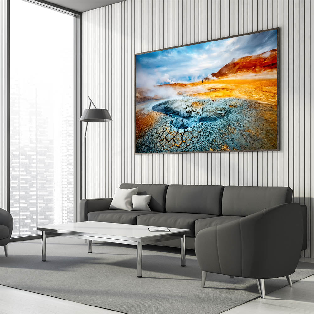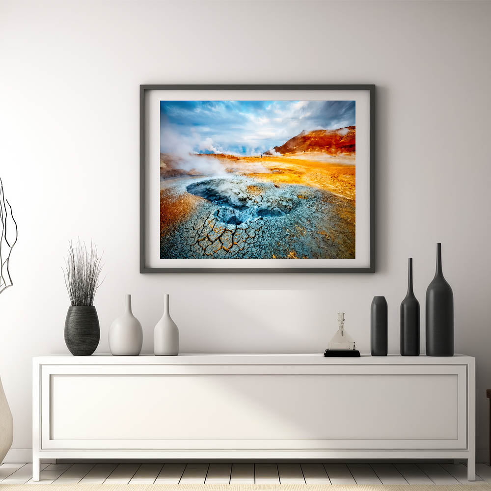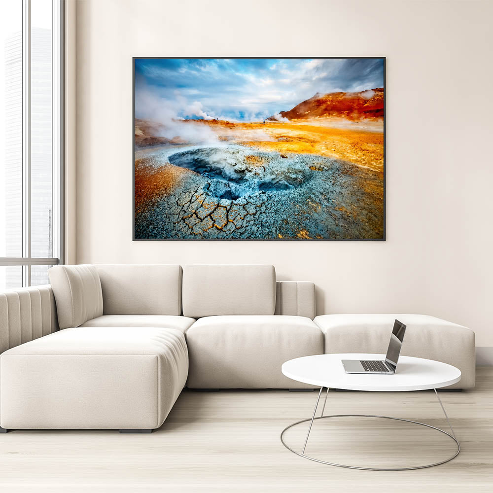 Immerse yourself in the captivating beauty of our Vibrant Hot Spring Canvas Print. This dynamic artwork showcases a stunning hot spring landscape with rich, dramatic colors that blend fiery oranges, cool blues, and earthy grays. The vibrant hues and striking contrasts make this piece a bold statement for any room, perfect for those who appreciate the power and majesty of nature.