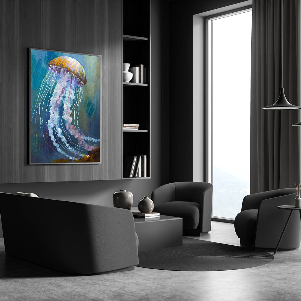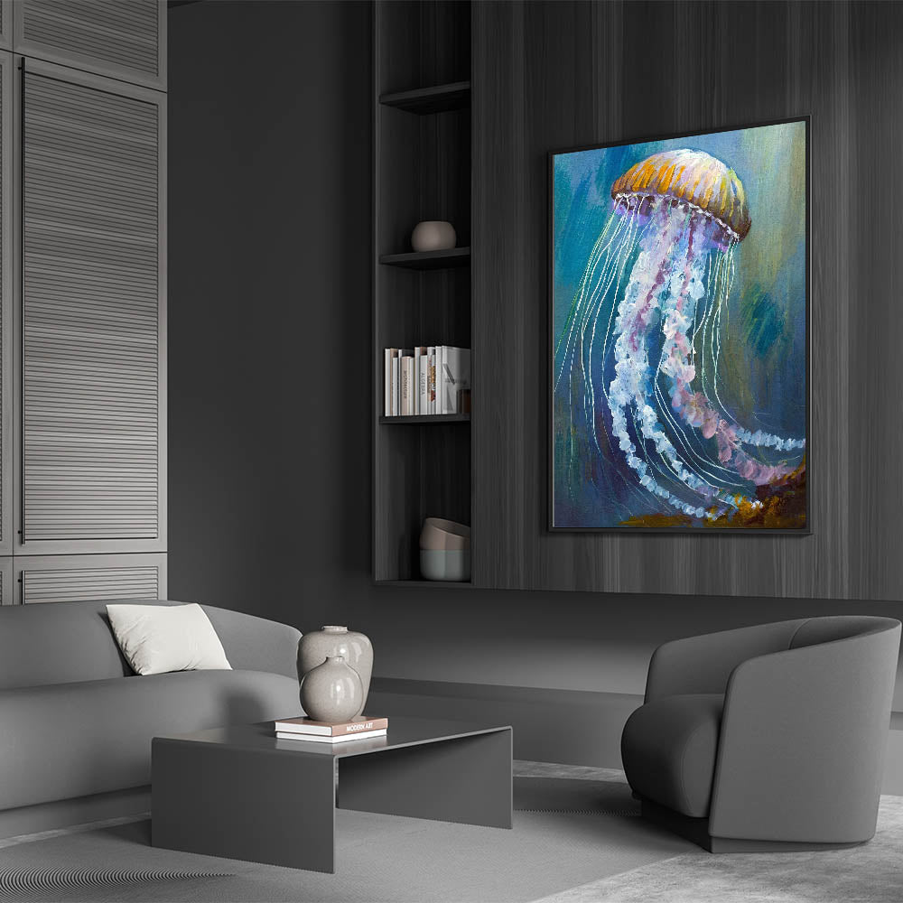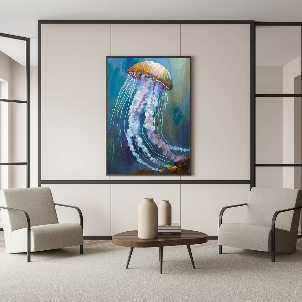 Transform your walls with this vibrant jellyfish art print, perfect for creating a dynamic and captivating atmosphere. This artwork also makes a thoughtful gift for anyone who loves the ocean and bold, nature-inspired decor.