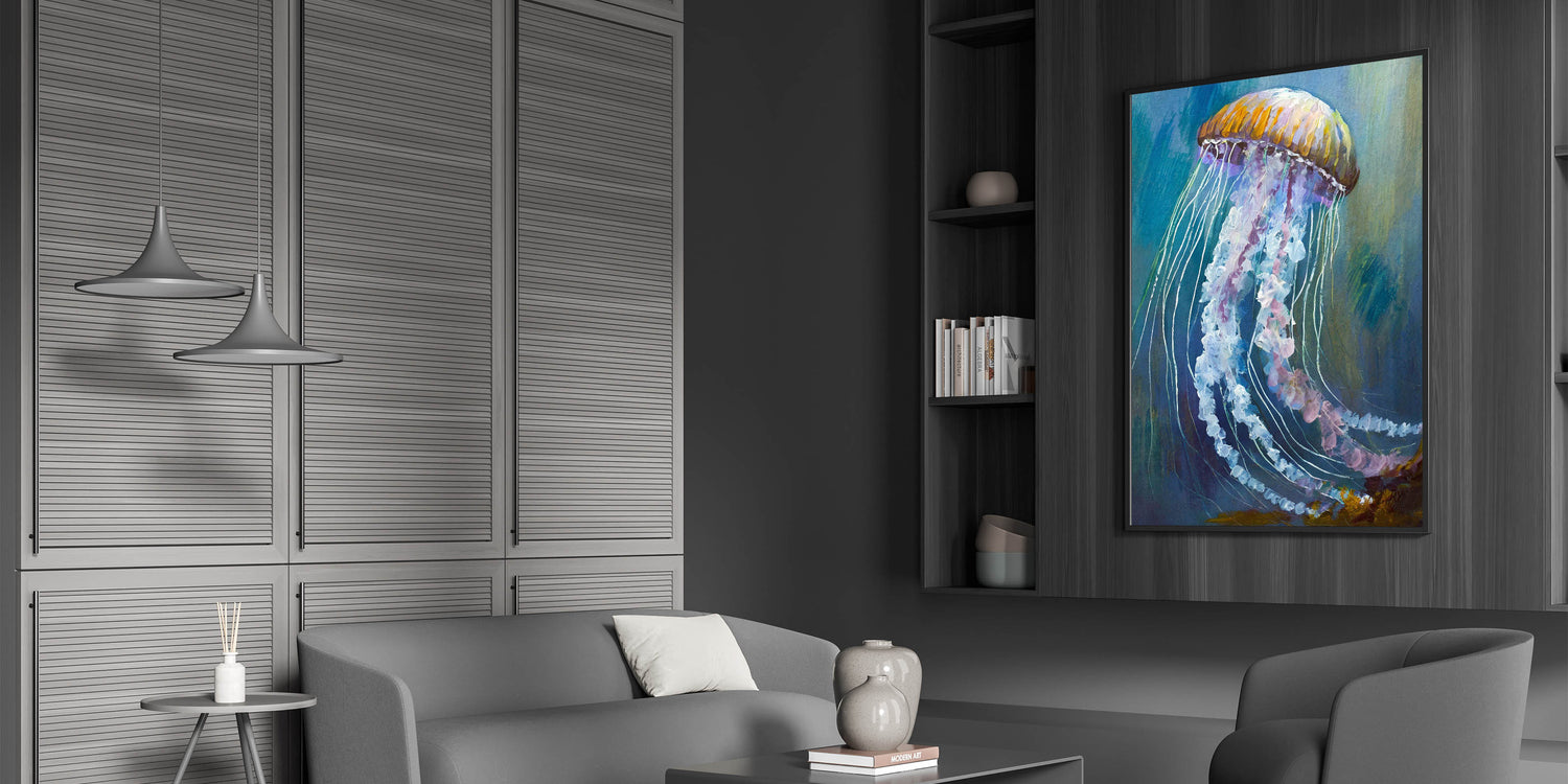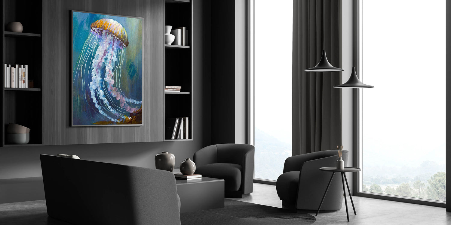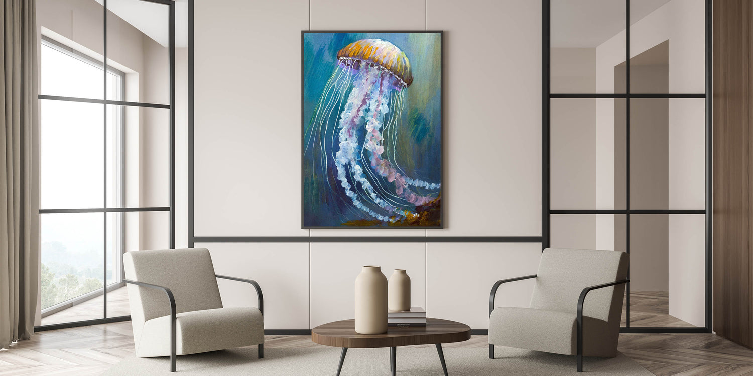 Transform your walls with this vibrant jellyfish art print, perfect for creating a dynamic and captivating atmosphere. This artwork also makes a thoughtful gift for anyone who loves the ocean and bold, nature-inspired decor.