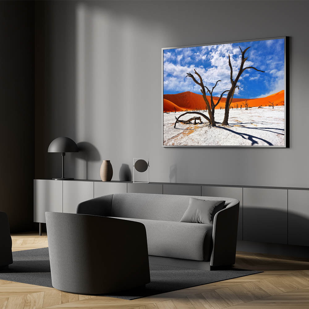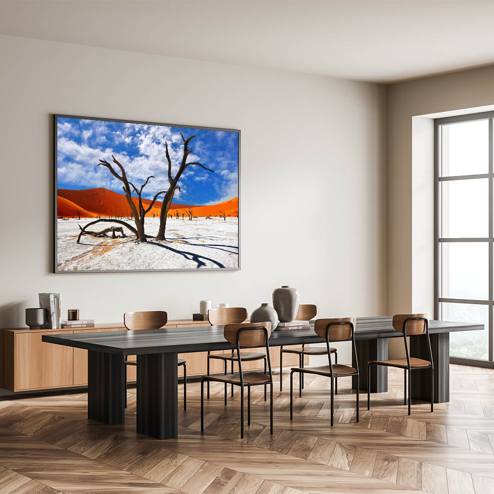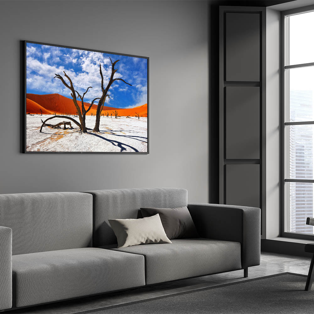 Experience the vibrant and surreal beauty of Namibia’s desert landscapes with this captivating wall art. Featuring the striking contrast of ancient, gnarled trees against the vivid orange dunes and a bright blue sky, this piece captures the raw and timeless beauty of Namibia’s most iconic scenery. Perfect for bringing a touch of Africa’s dramatic landscapes into your home or office, this artwork is a must-have for nature and art enthusiasts alike.