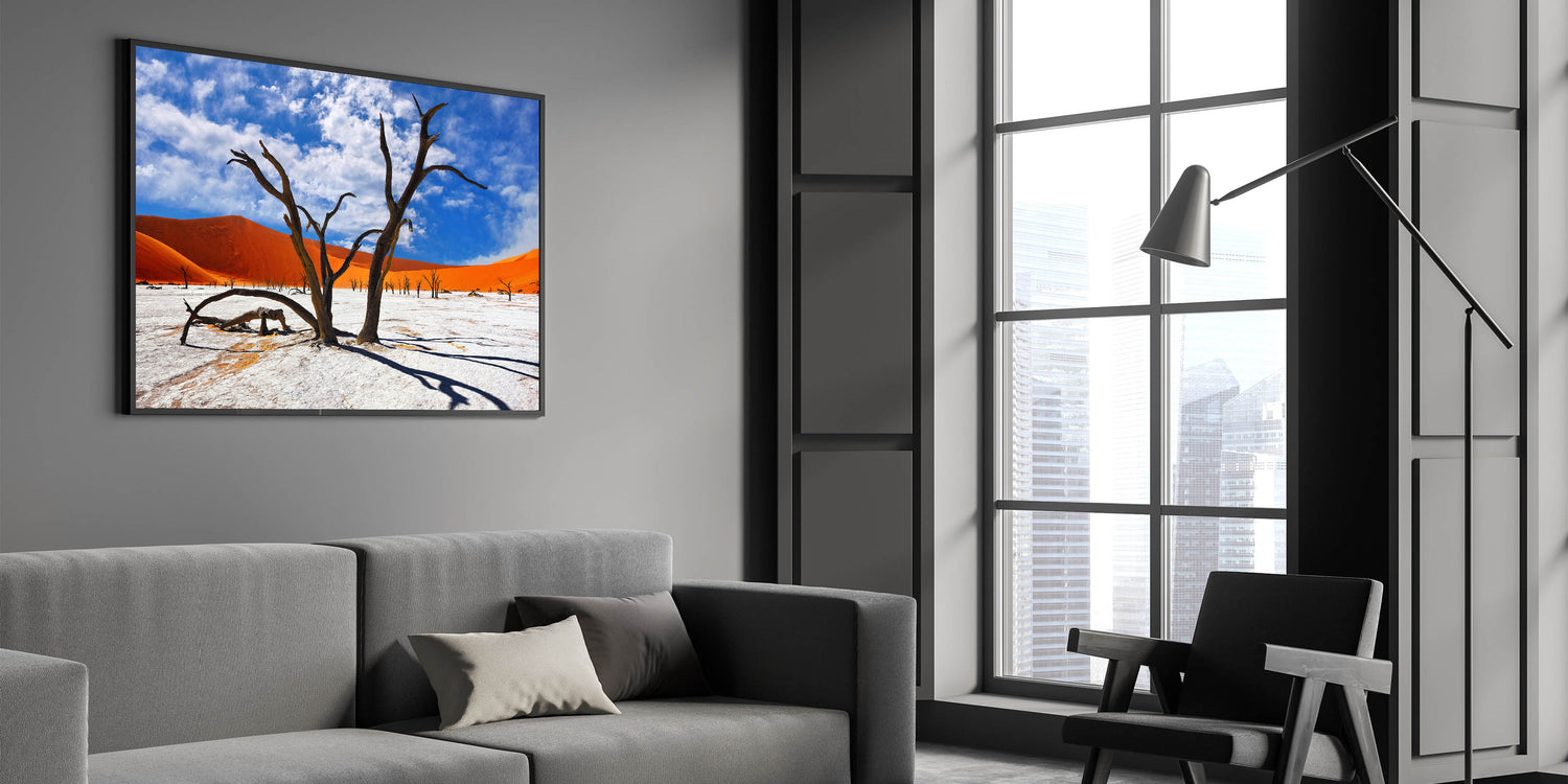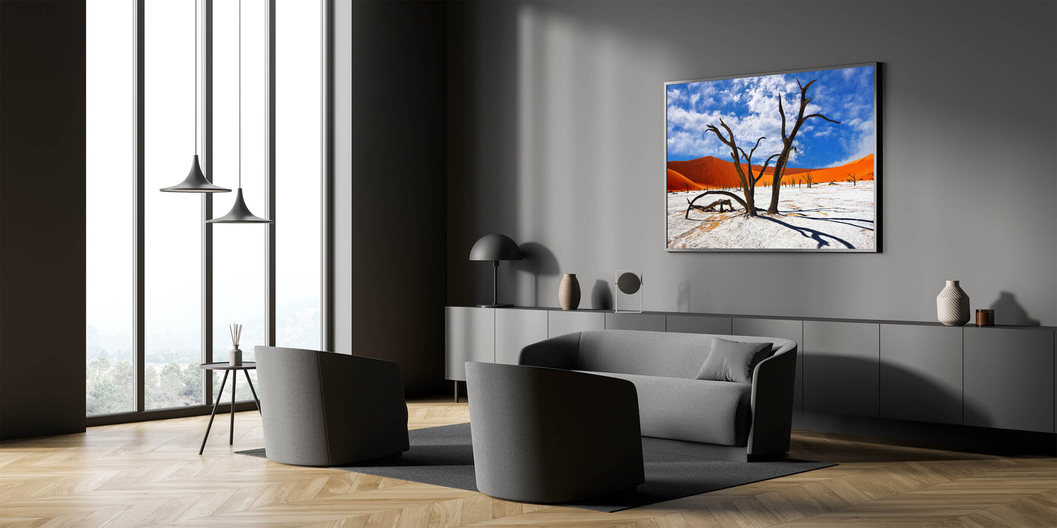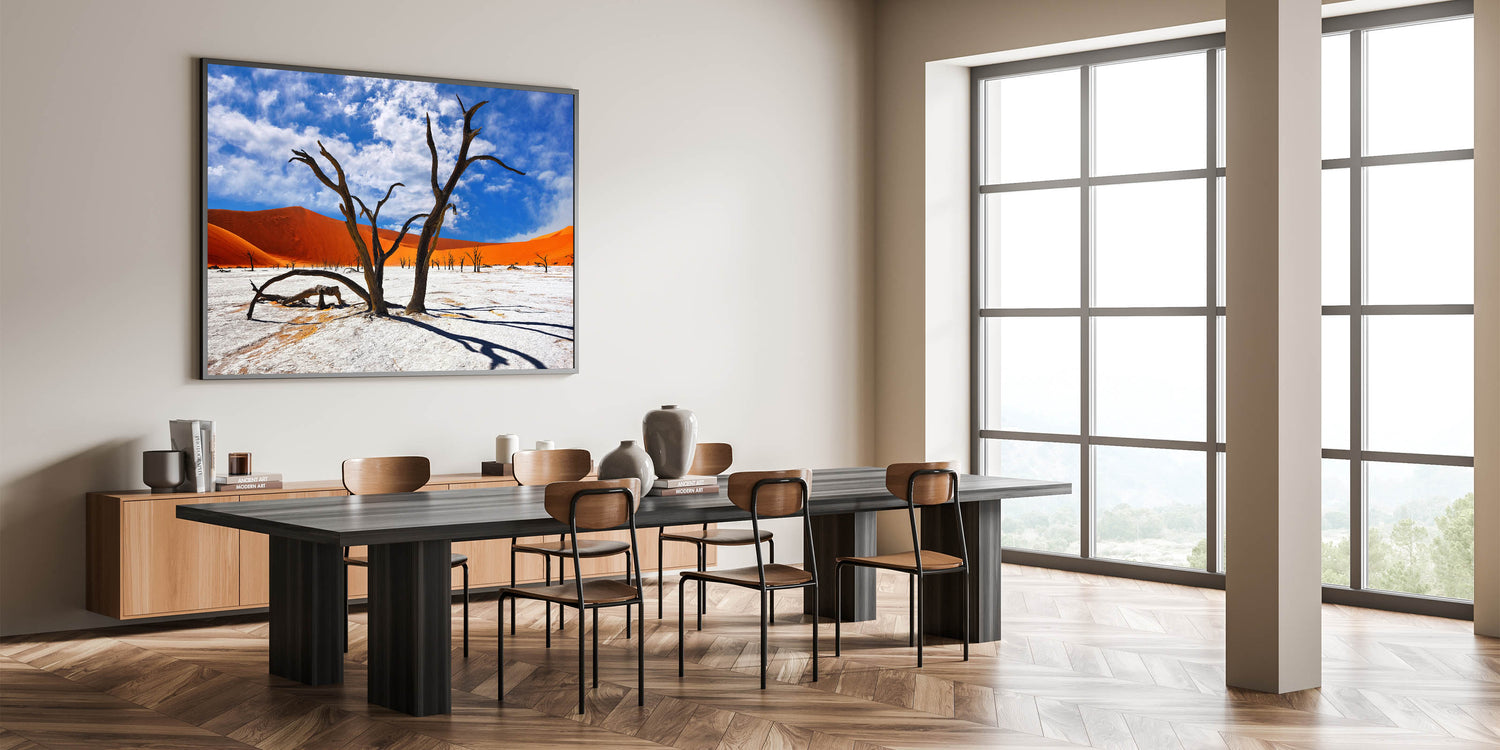 Experience the vibrant and surreal beauty of Namibia’s desert landscapes with this captivating wall art. Featuring the striking contrast of ancient, gnarled trees against the vivid orange dunes and a bright blue sky, this piece captures the raw and timeless beauty of Namibia’s most iconic scenery. Perfect for bringing a touch of Africa’s dramatic landscapes into your home or office, this artwork is a must-have for nature and art enthusiasts alike.