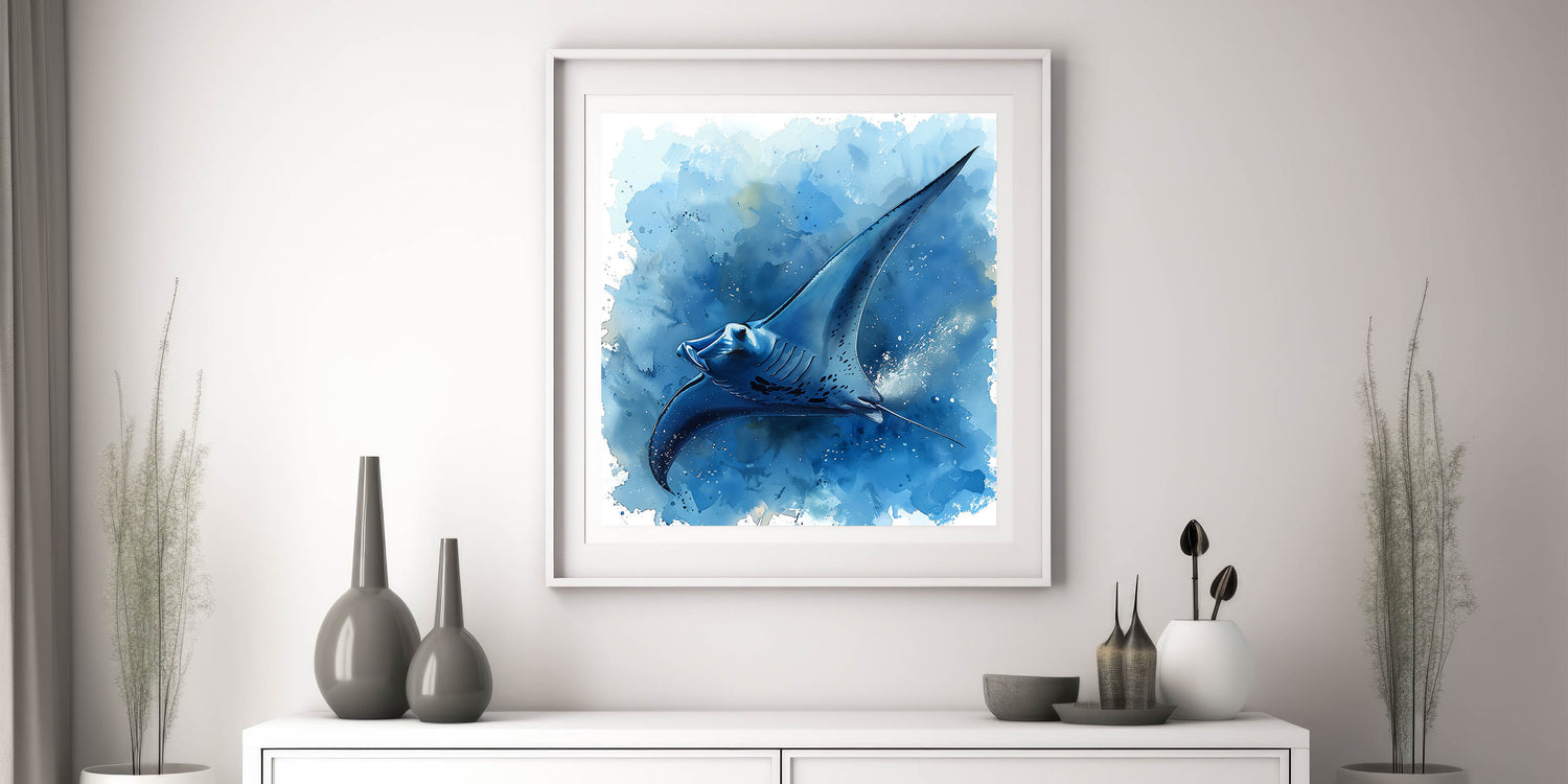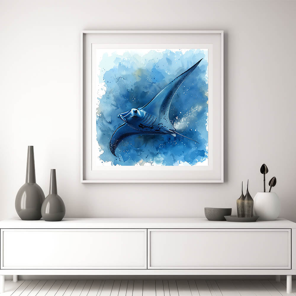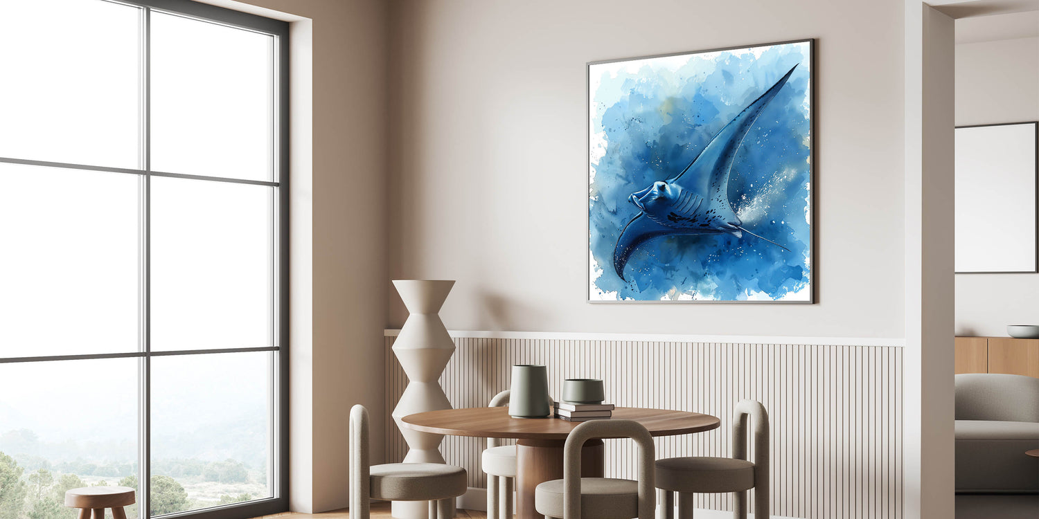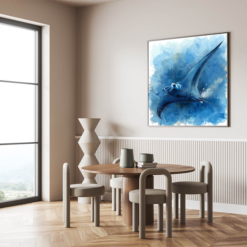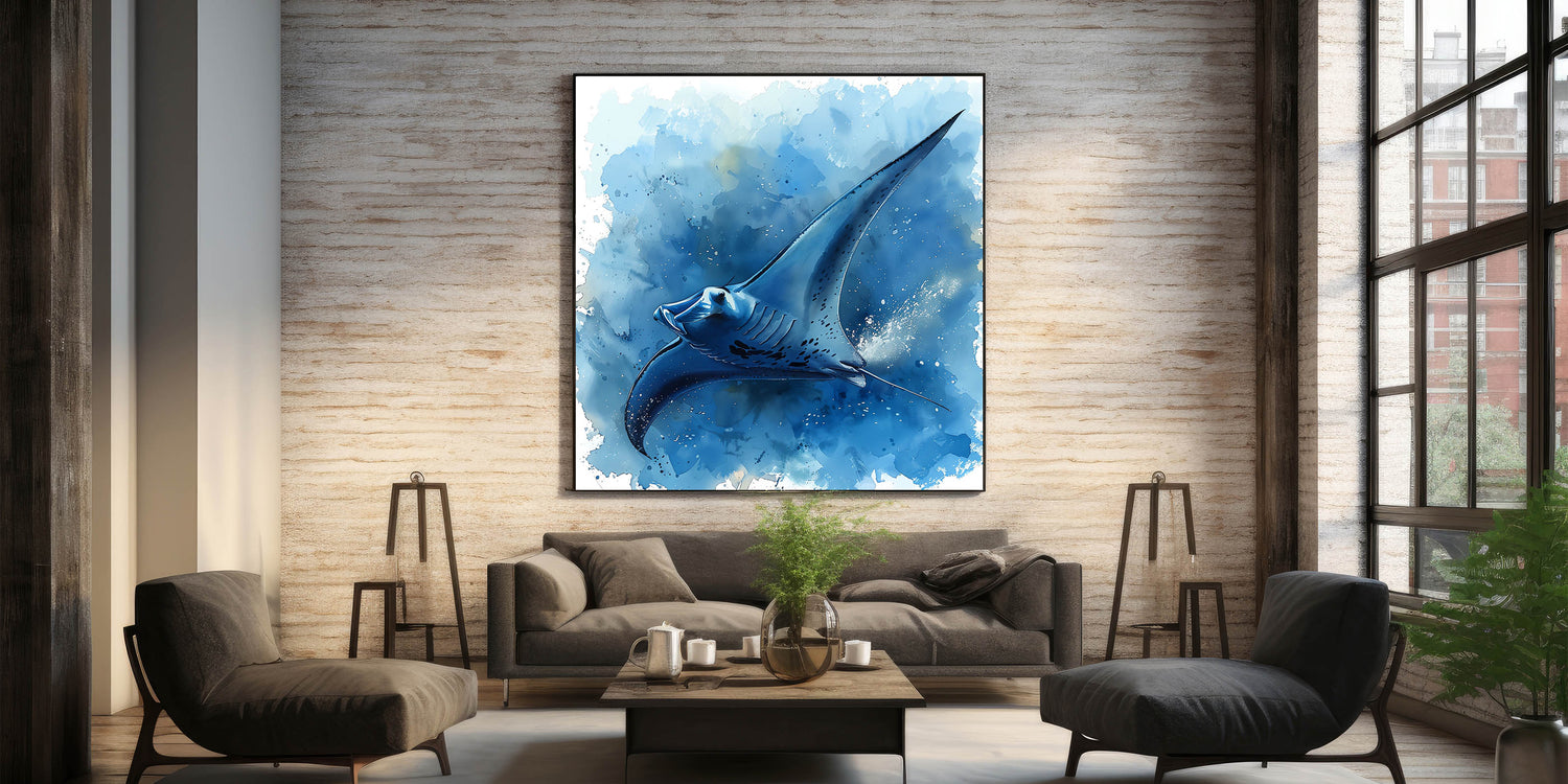 - Bold & Artistic: This artwork is available in various formats, including stretched canvas, framed canvas, and acrylic glass. The vivid blues and artistic brush strokes bring the ray to life, making it an eye-catching centerpiece in any decor.