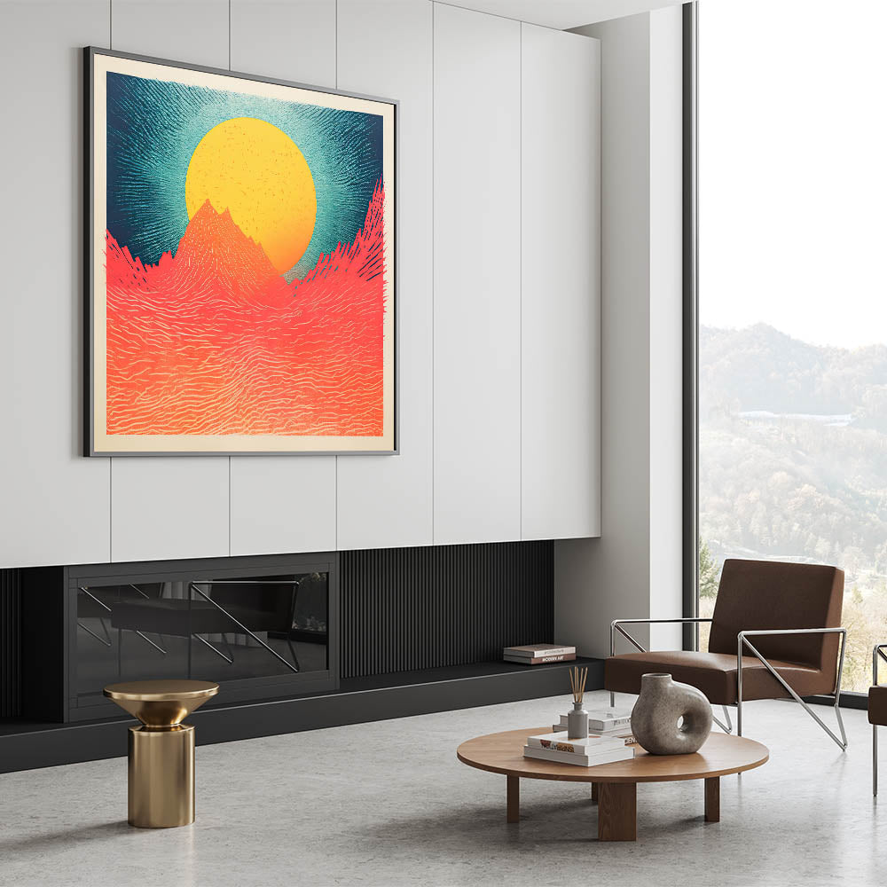 This piece is perfect for anyone looking to bring a touch of dramatic flair and color to their home or office. Its abstract portrayal of Tahitian landscapes offers a fresh take on traditional sunset art, making it an ideal conversation starter.