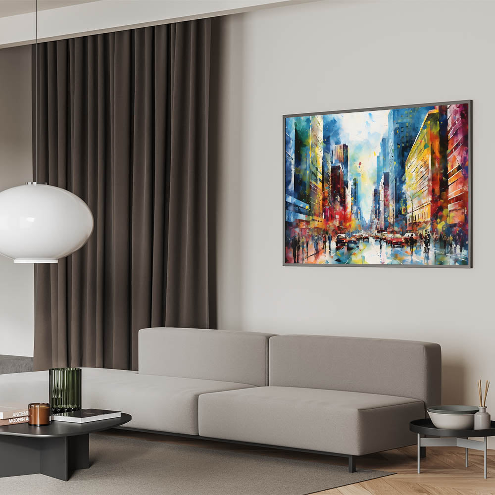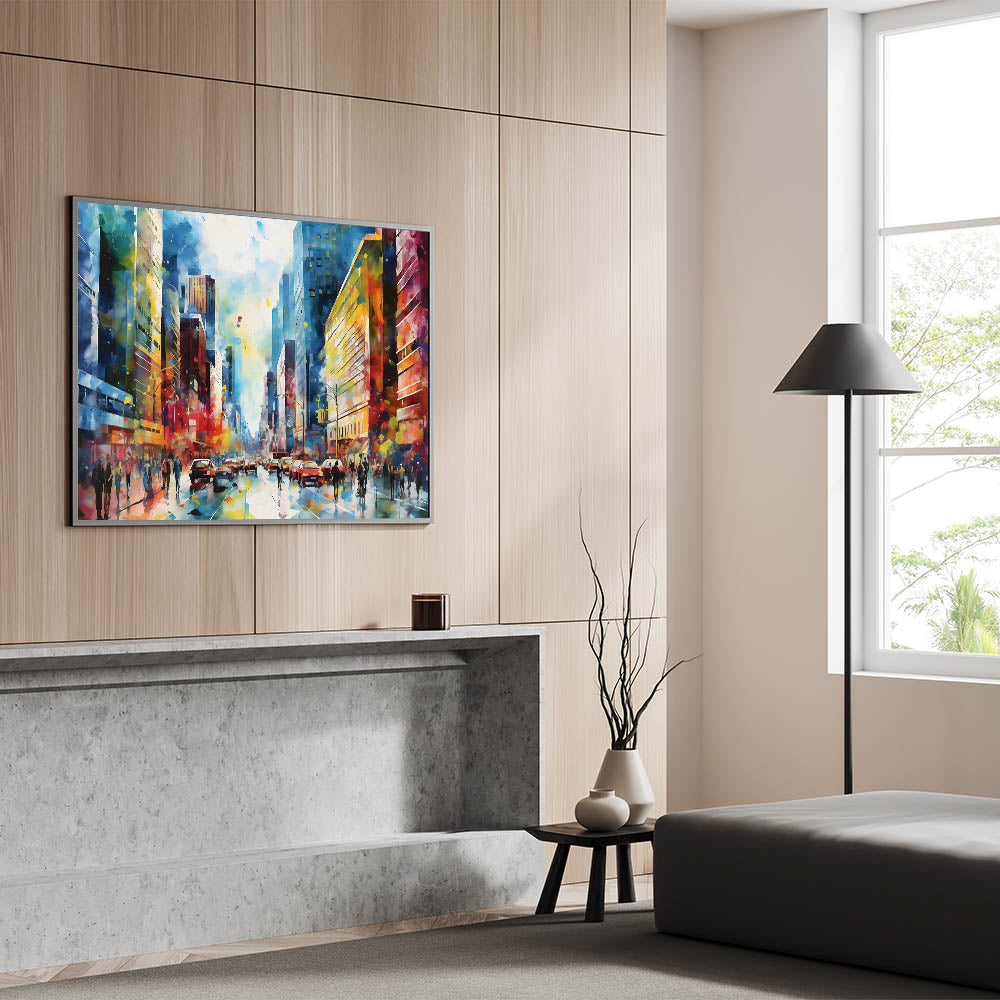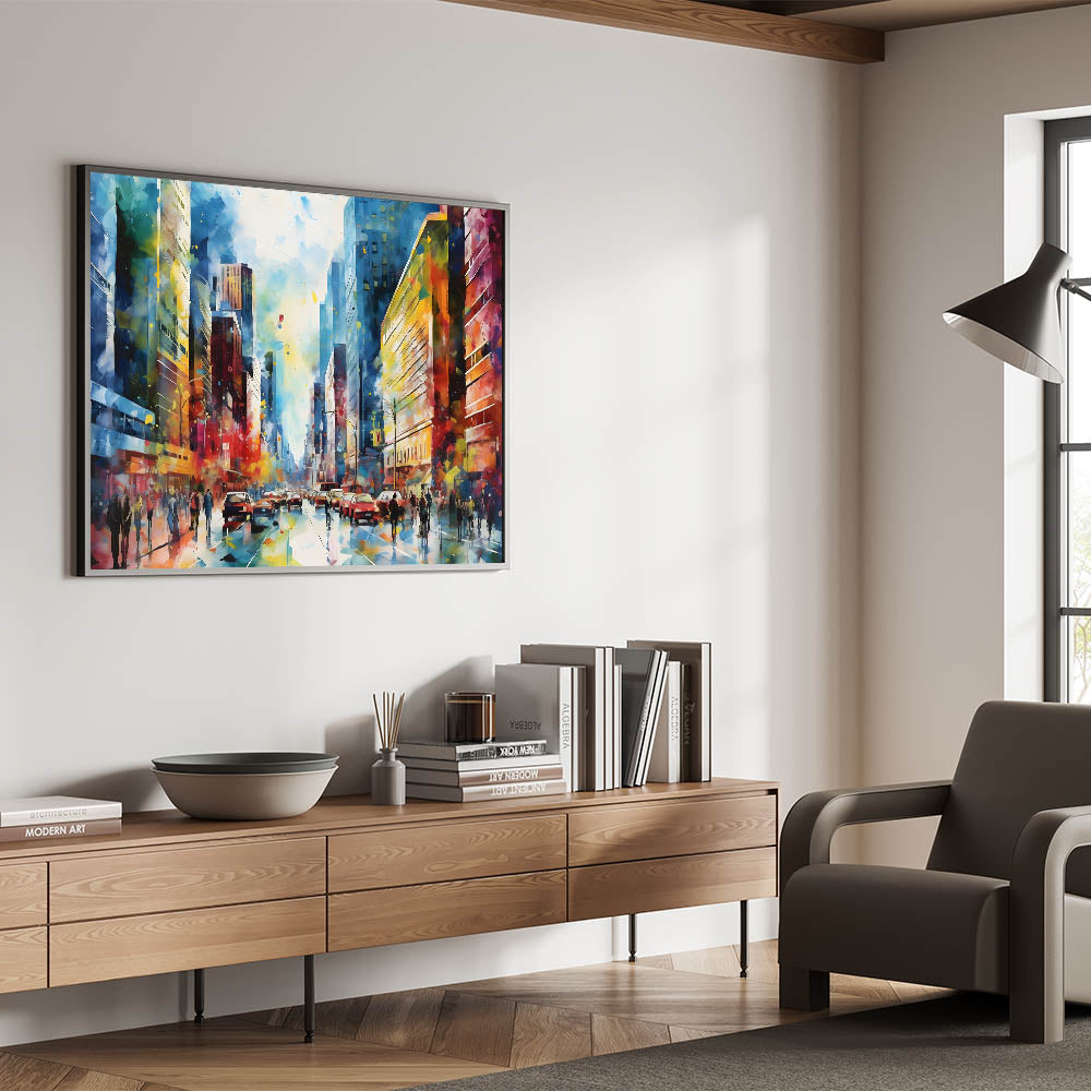- City Life Charm: The artwork captures the essence of city life with its bustling streets, towering buildings, and vibrant atmosphere, making it a captivating focal point in any setting.
