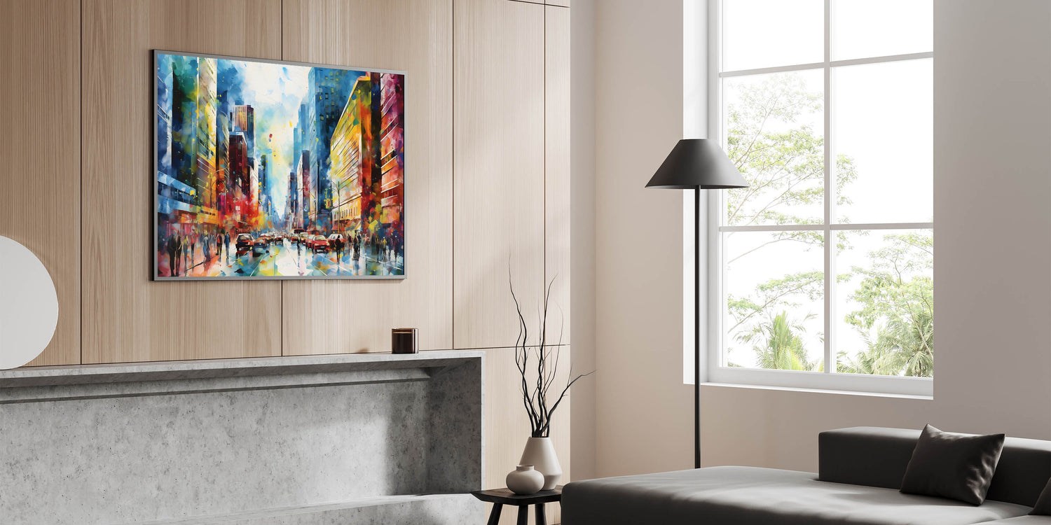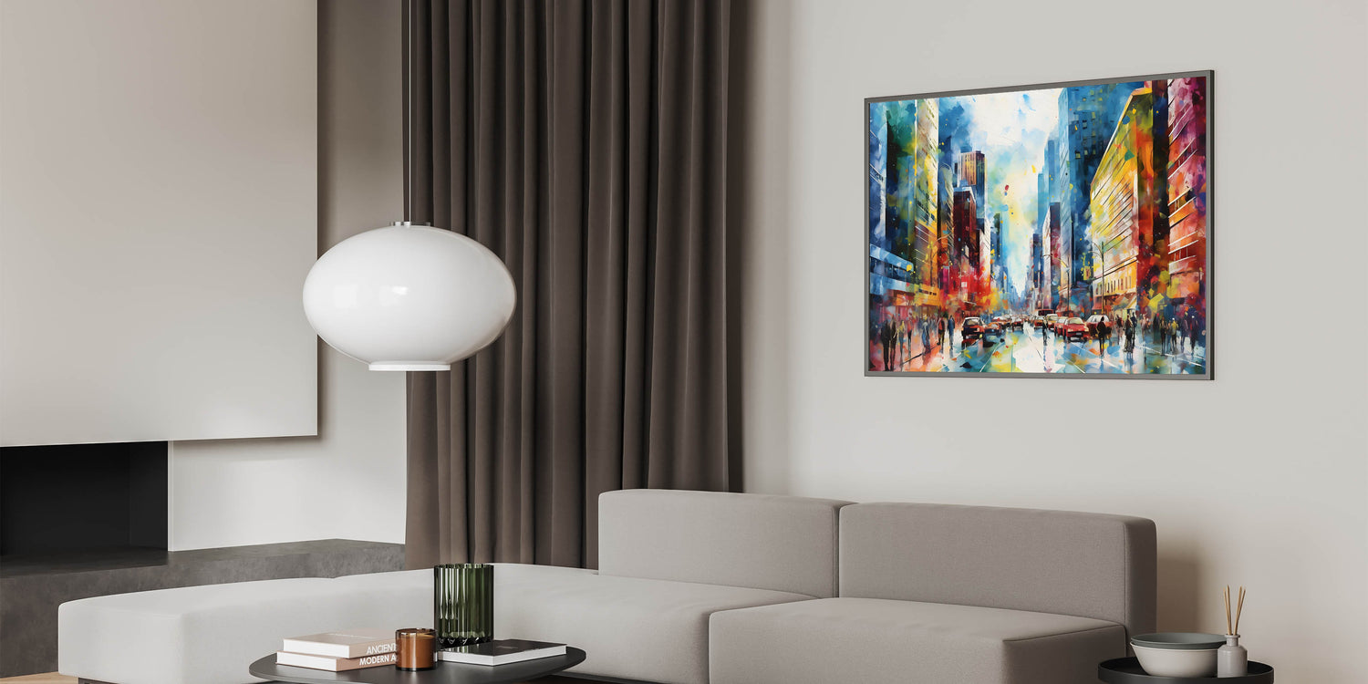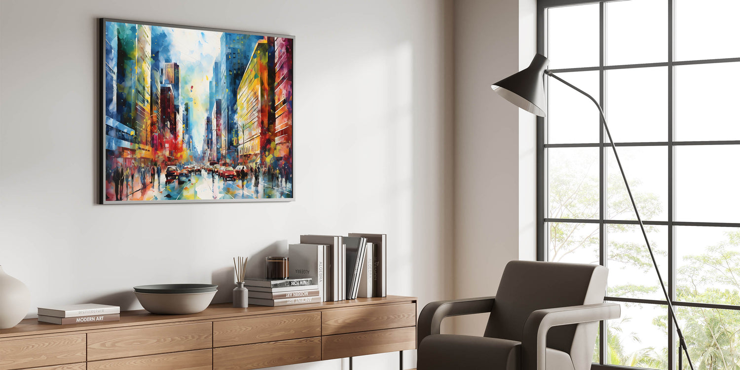 - City Life Charm: The artwork captures the essence of city life with its bustling streets, towering buildings, and vibrant atmosphere, making it a captivating focal point in any setting.