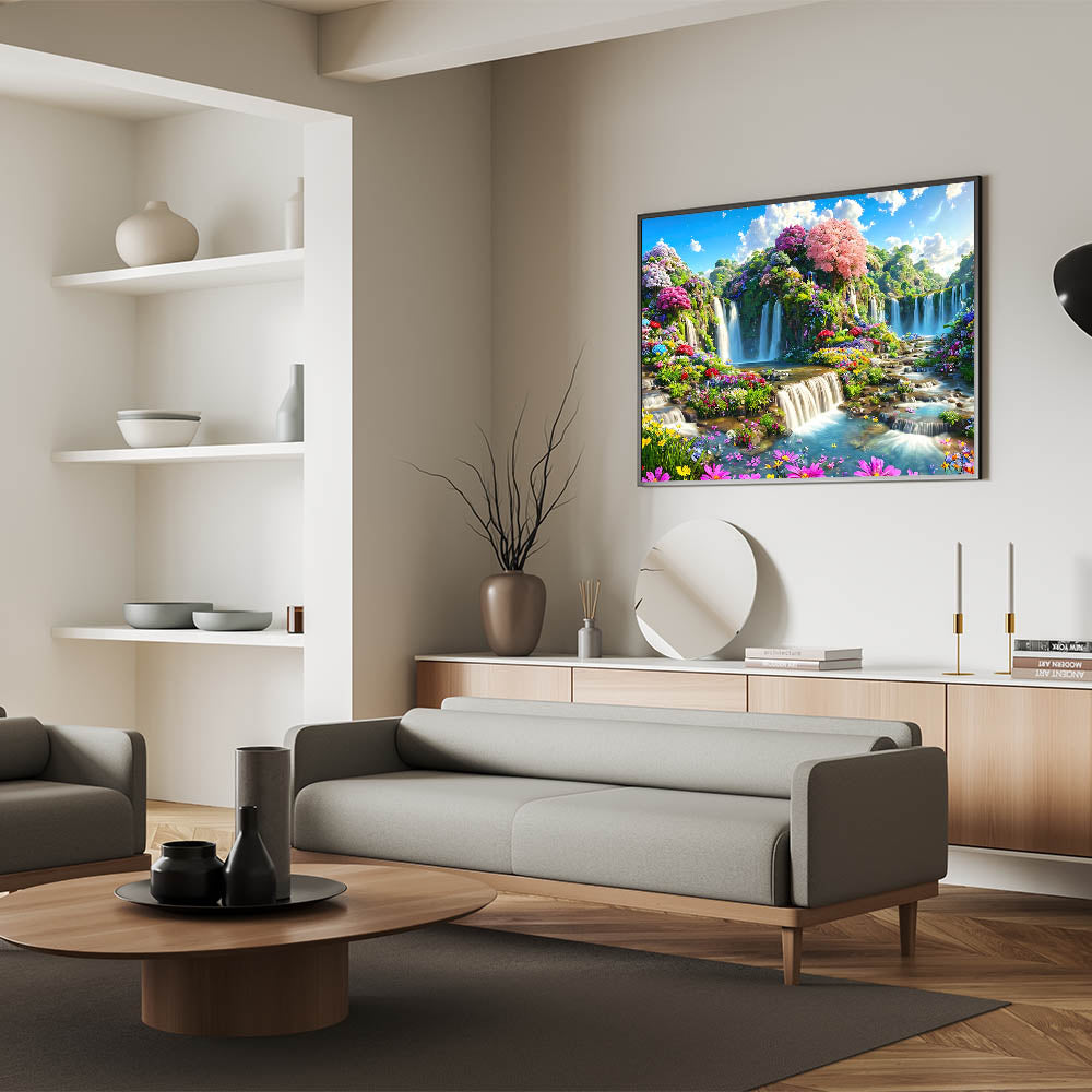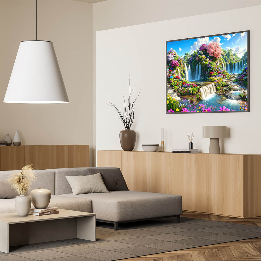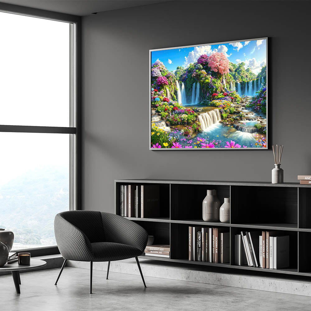 Immerse yourself in the vibrant colors and lush beauty of our Vibrant Waterfall Garden Wall Art. This breathtaking artwork captures a serene garden scene with cascading waterfalls surrounded by an explosion of colorful flowers. It's an ideal piece for those who wish to bring the rejuvenating essence of nature into their home.
