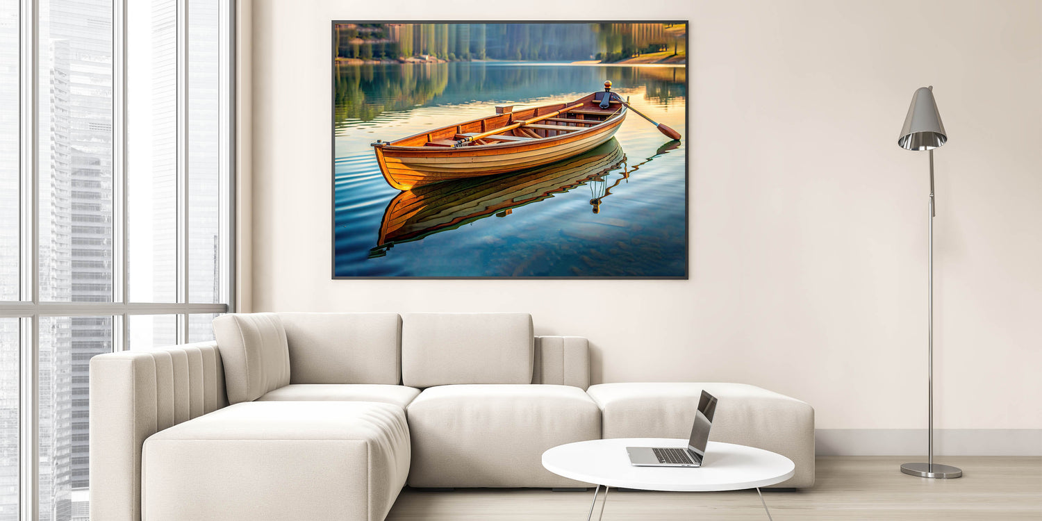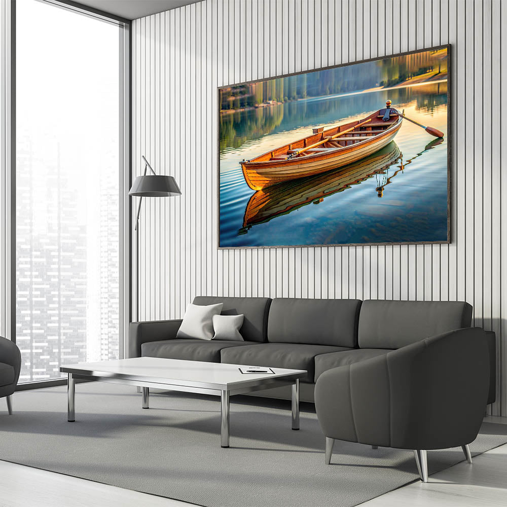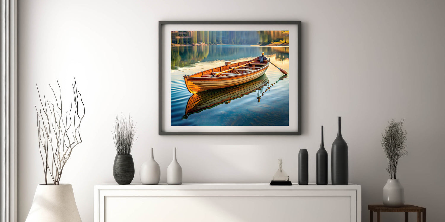 - Handcrafted boat art: Showcases the simplicity and beauty of a single rowboat on calm waters.