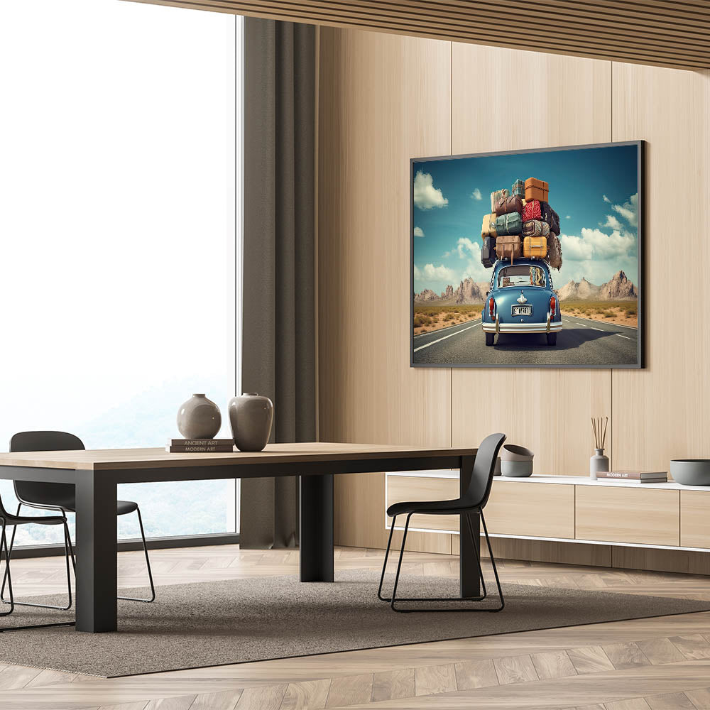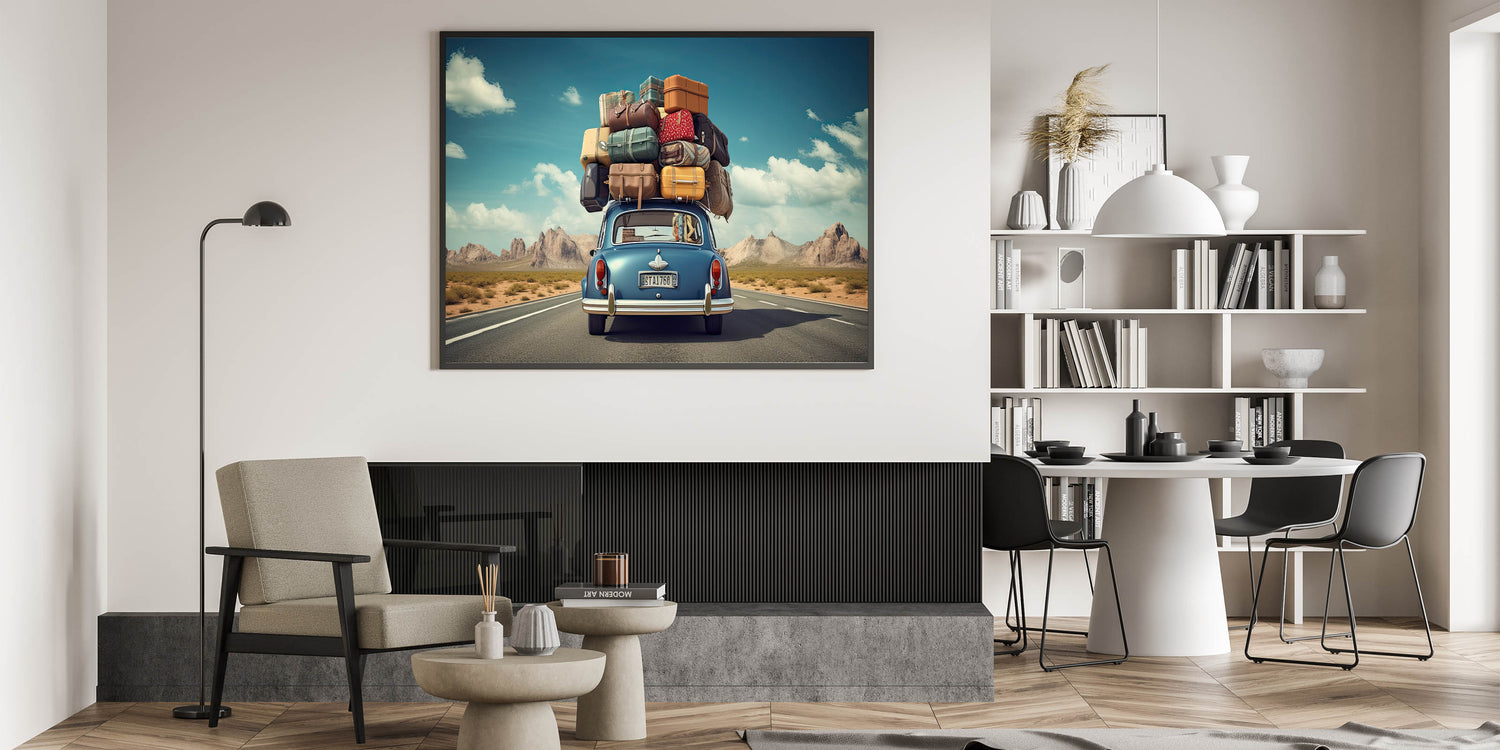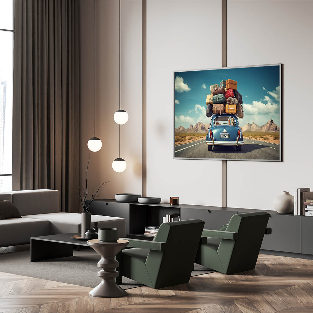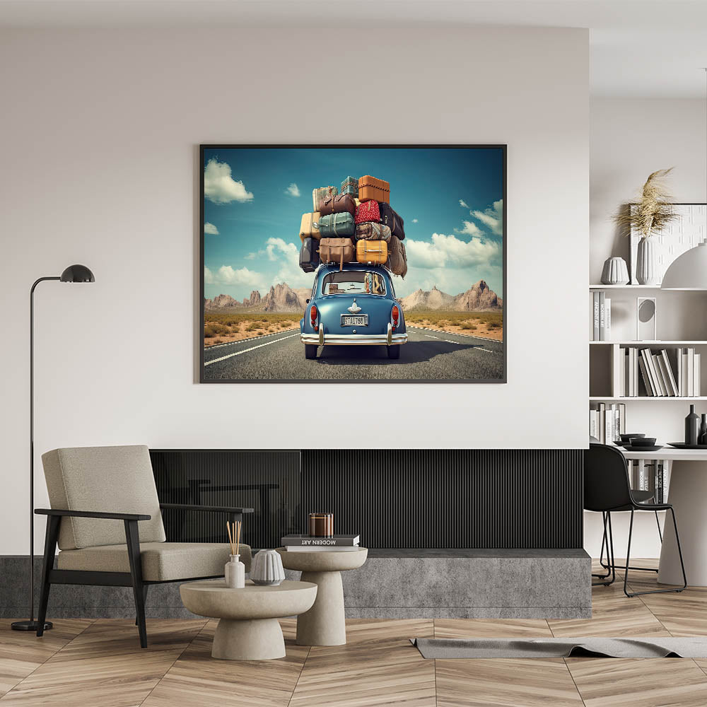 Embark on a nostalgic journey with this vibrant road trip wall art, capturing the spirit of adventure and the freedom of the open road. This piece features a classic vintage car loaded with an eclectic mix of colorful luggage, driving through a scenic desert landscape. The retro feel of the image, combined with the bright and cheerful colors, makes this artwork a perfect addition to any space that celebrates travel, exploration, and the joy of the journey.