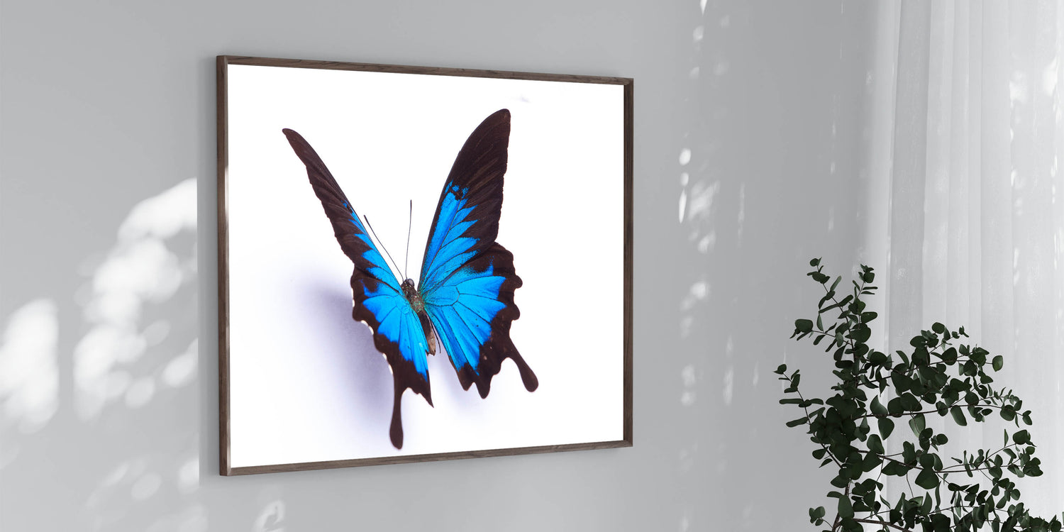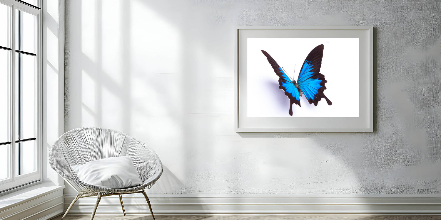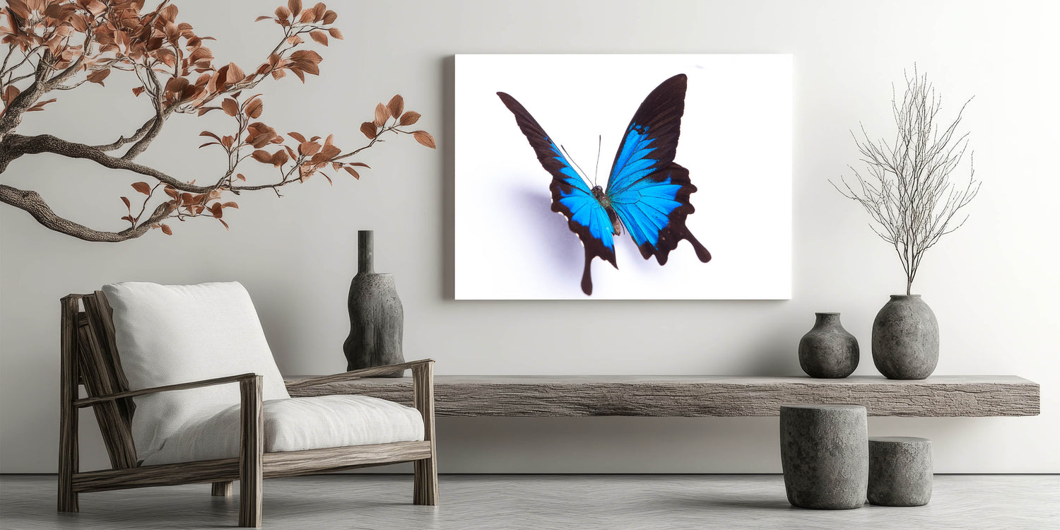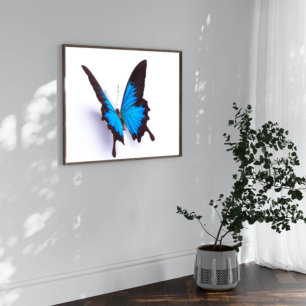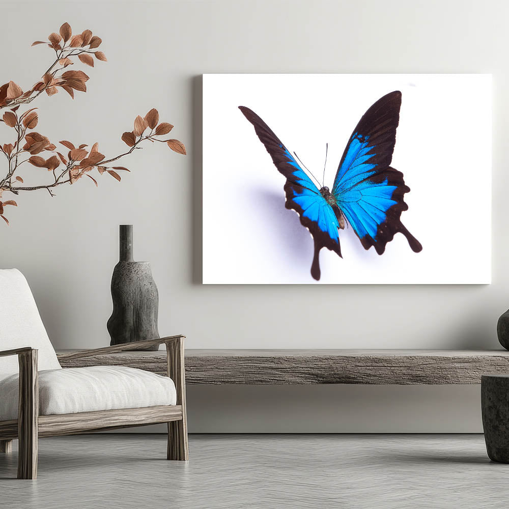 Transform your space with this beautiful butterfly artwork, which captures the essence of nature's brilliance. Its striking blue and black color palette makes it a standout piece in any setting.