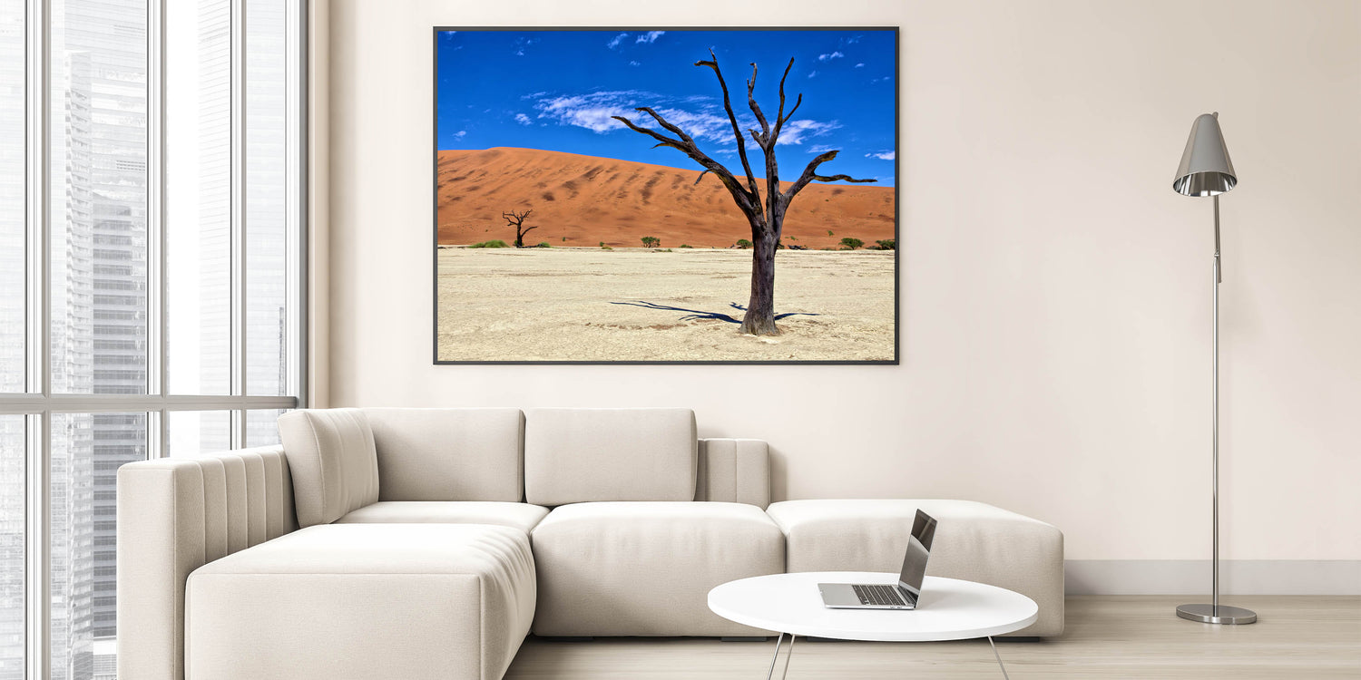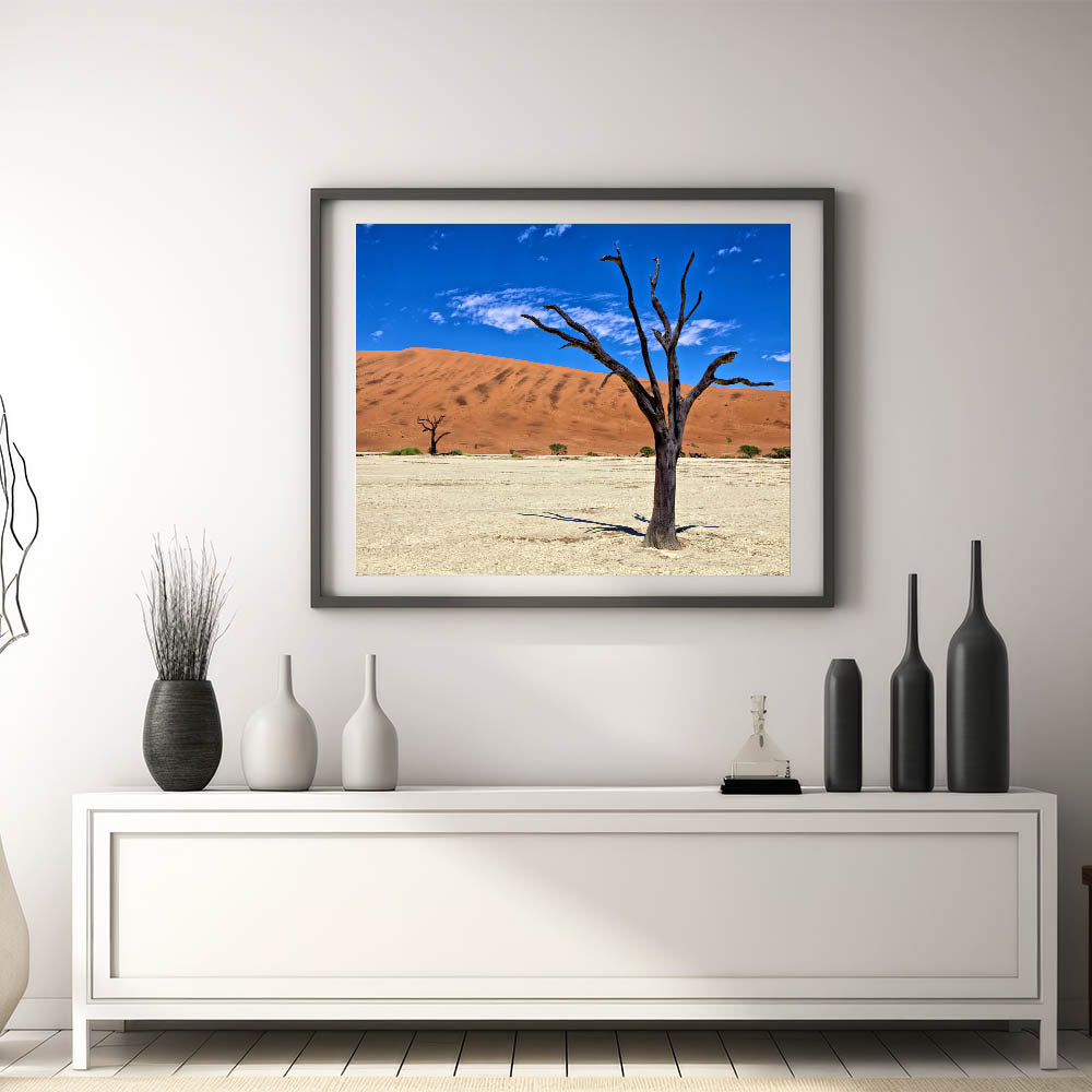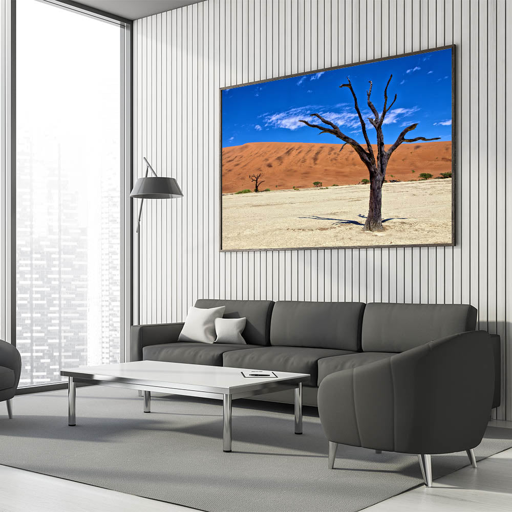 Experience the raw beauty of Namibia with this captivating wall art, featuring the striking contrast of a barren tree against the vibrant red dunes and deep blue sky. This Namibian landscape photography captures the essence of Africa’s vast and diverse desert scenery, perfect for adding a bold statement to your home or office decor.