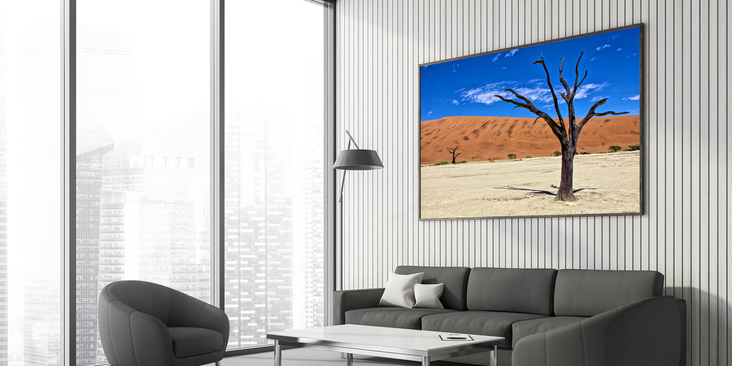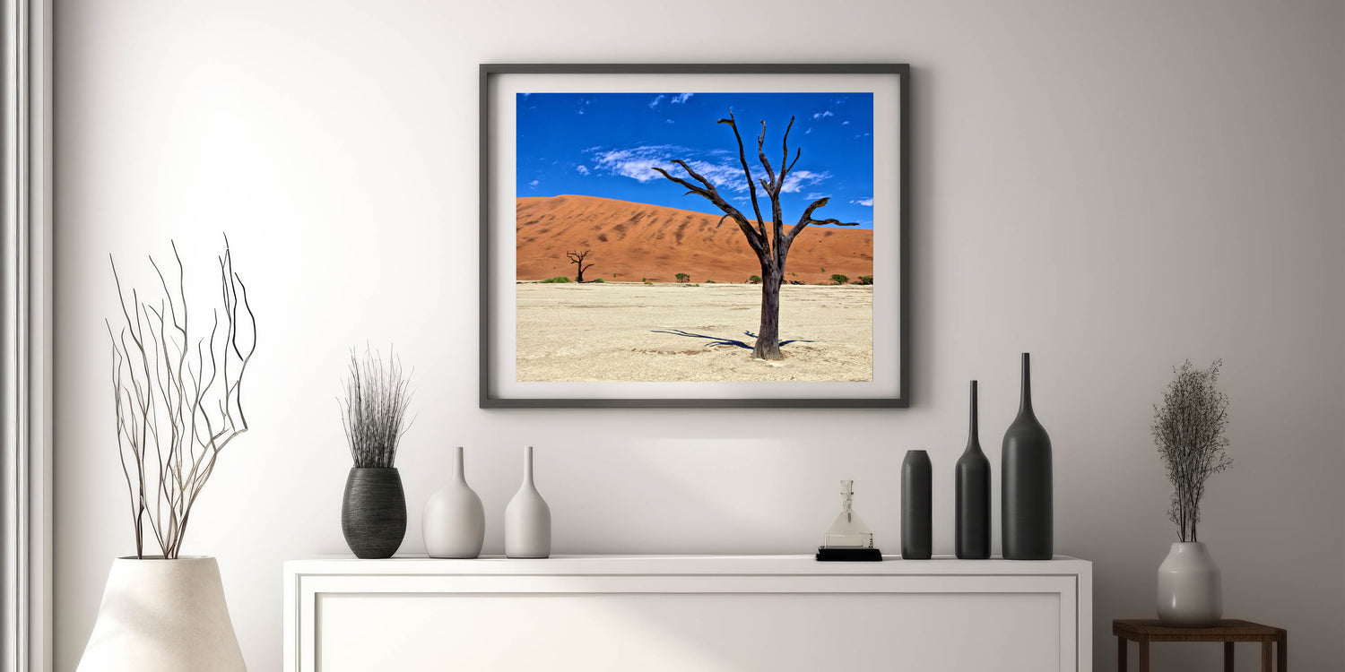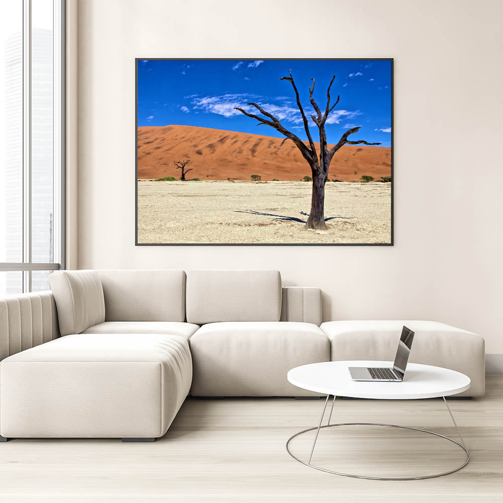 Experience the raw beauty of Namibia with this captivating wall art, featuring the striking contrast of a barren tree against the vibrant red dunes and deep blue sky. This Namibian landscape photography captures the essence of Africa’s vast and diverse desert scenery, perfect for adding a bold statement to your home or office decor.