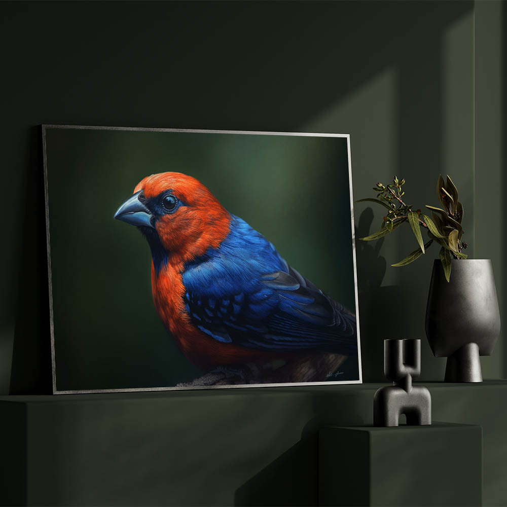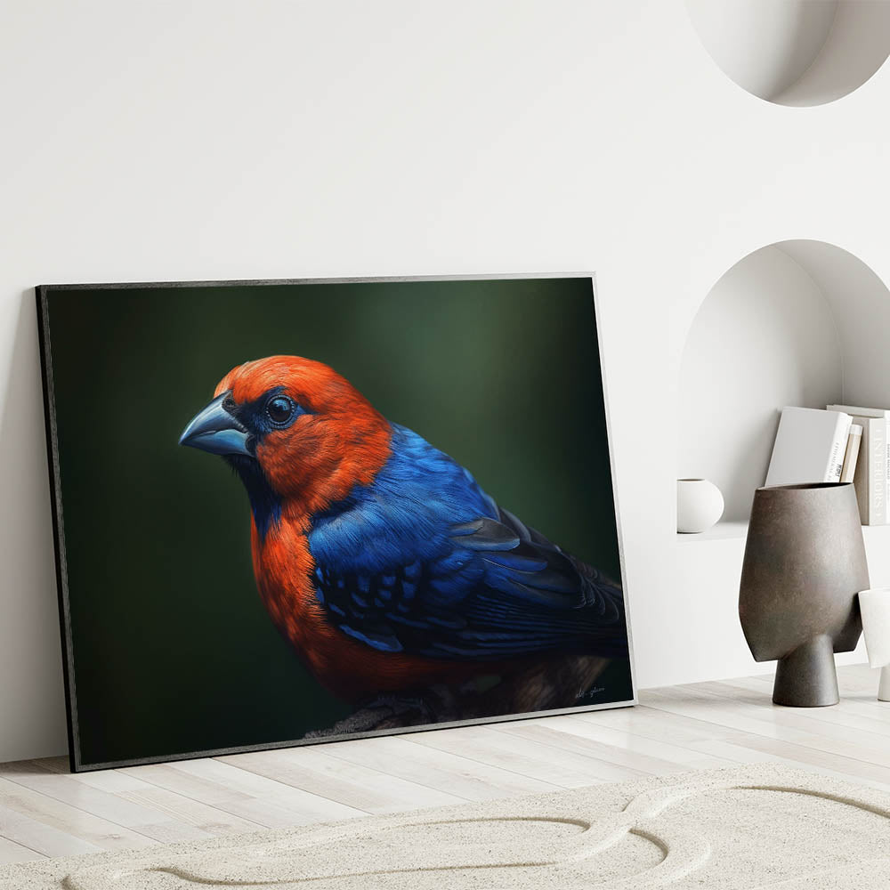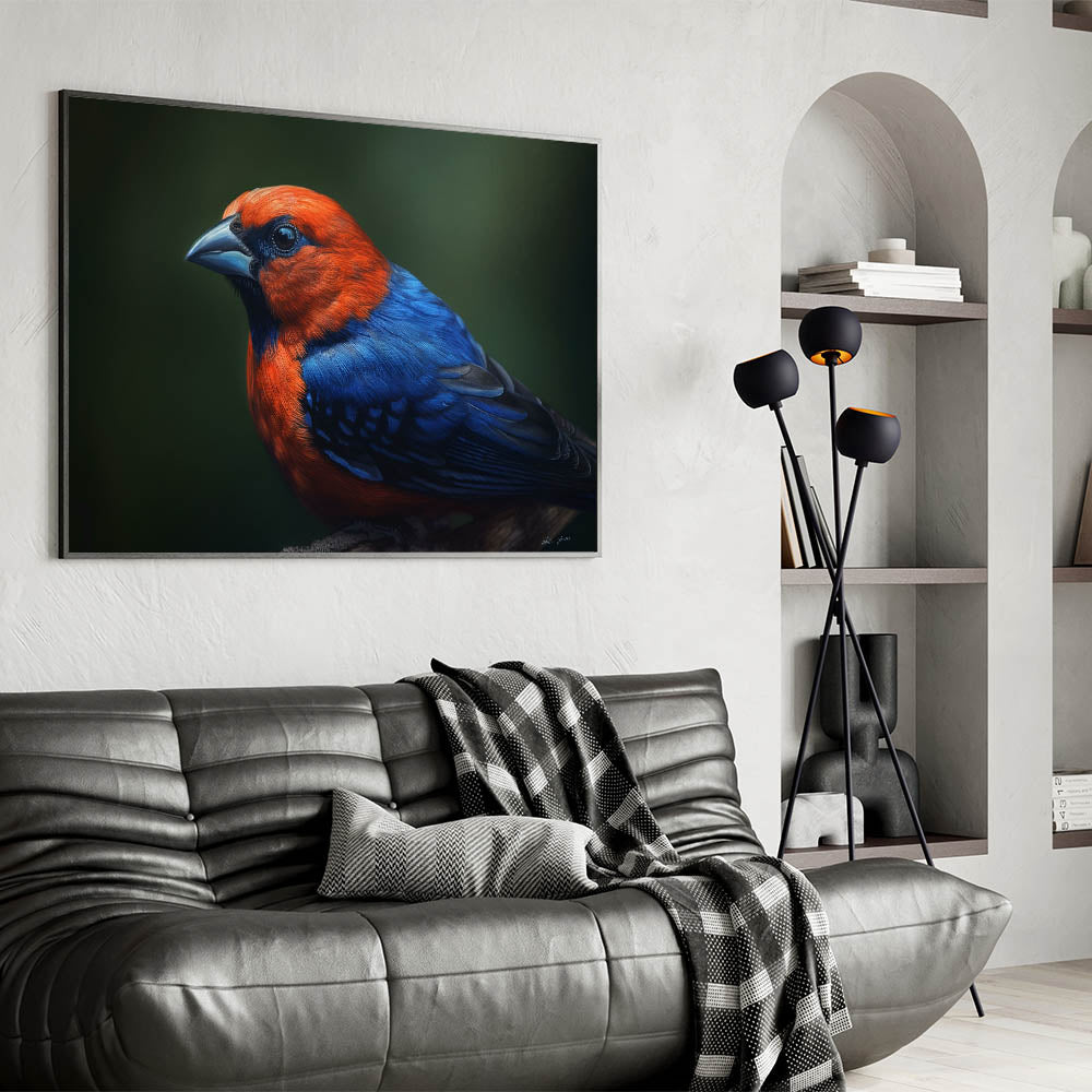 Infuse your space with the vivid colors of nature with this stunning Tropical Bird wall art, featuring a striking bird with bold red and blue plumage. The intense colors against a dark background create a powerful visual impact, making this artwork a perfect focal point in any room. Whether you're decorating a living room, bedroom, or office, this piece will add a touch of elegance and vibrancy to your decor.