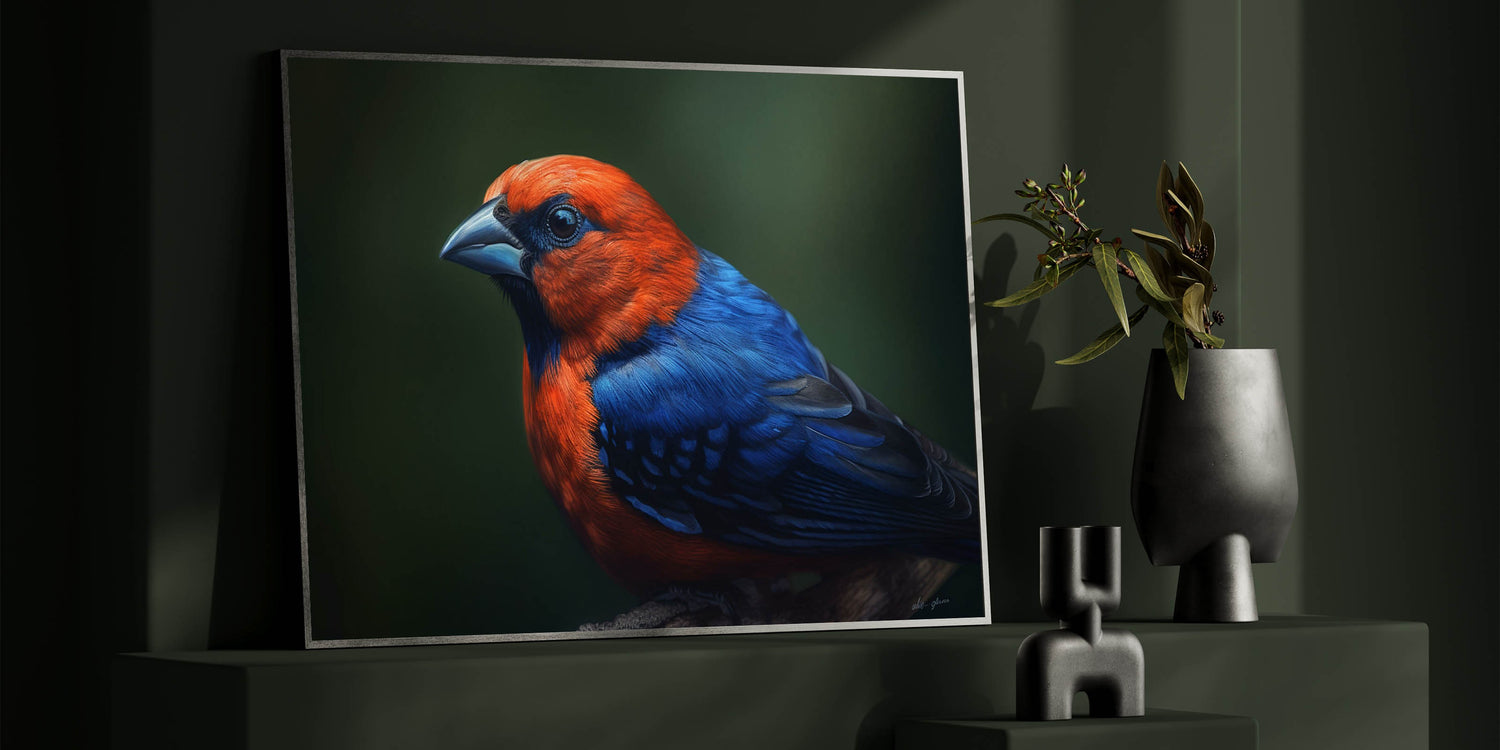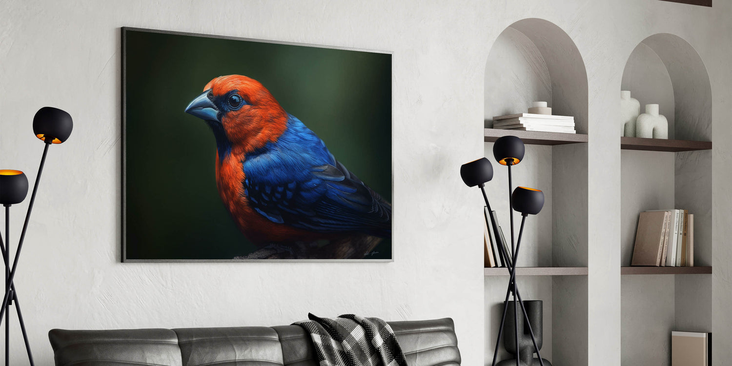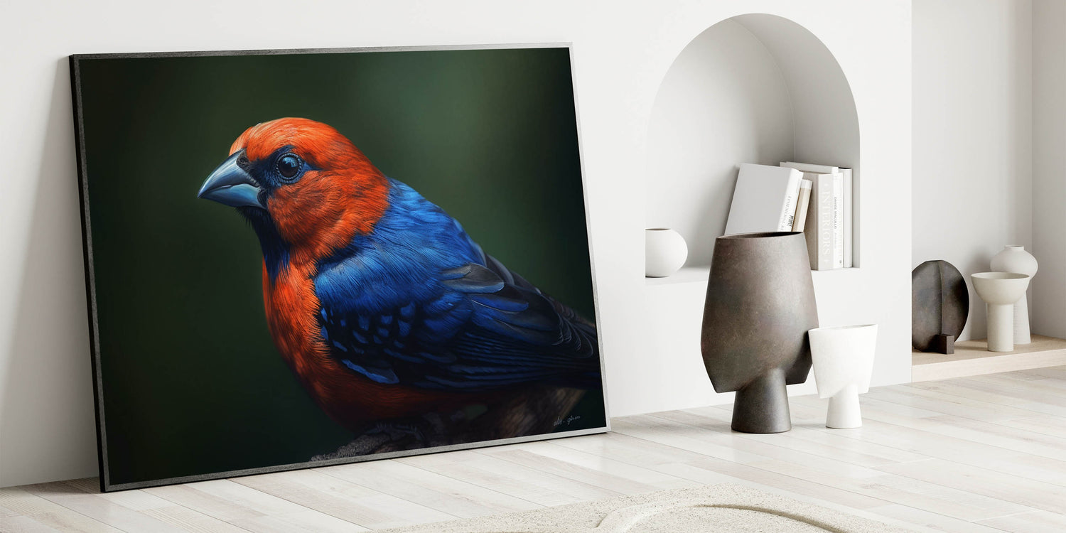 Infuse your space with the vivid colors of nature with this stunning Tropical Bird wall art, featuring a striking bird with bold red and blue plumage. The intense colors against a dark background create a powerful visual impact, making this artwork a perfect focal point in any room. Whether you're decorating a living room, bedroom, or office, this piece will add a touch of elegance and vibrancy to your decor.