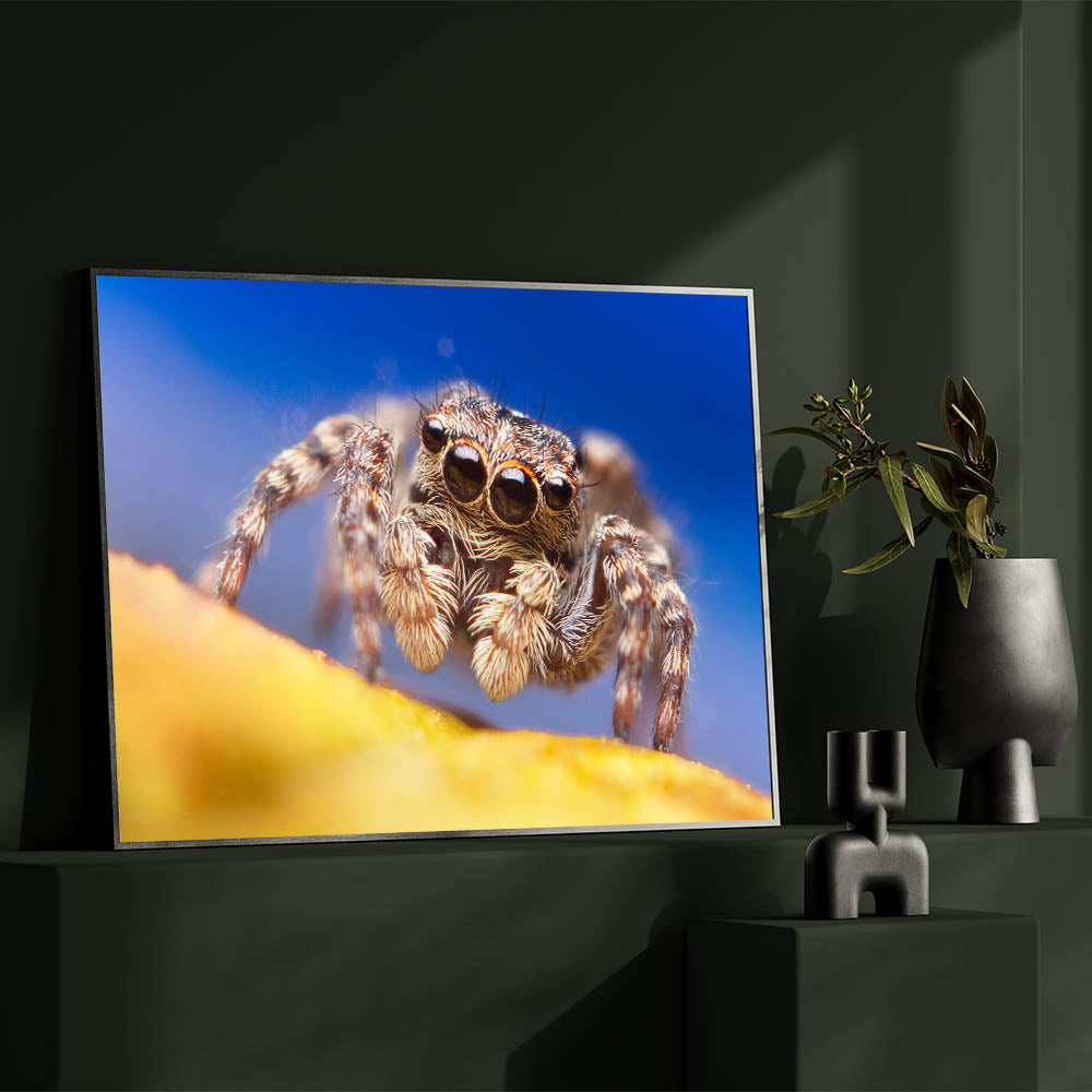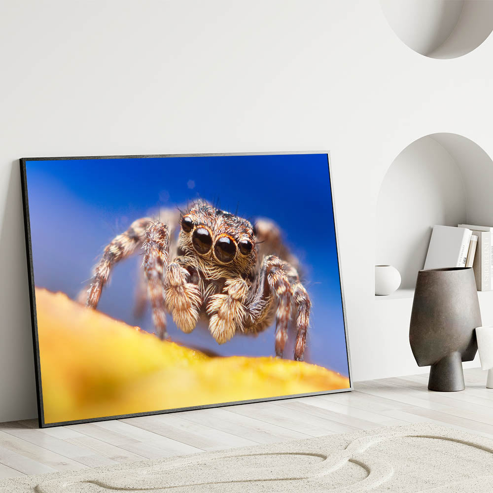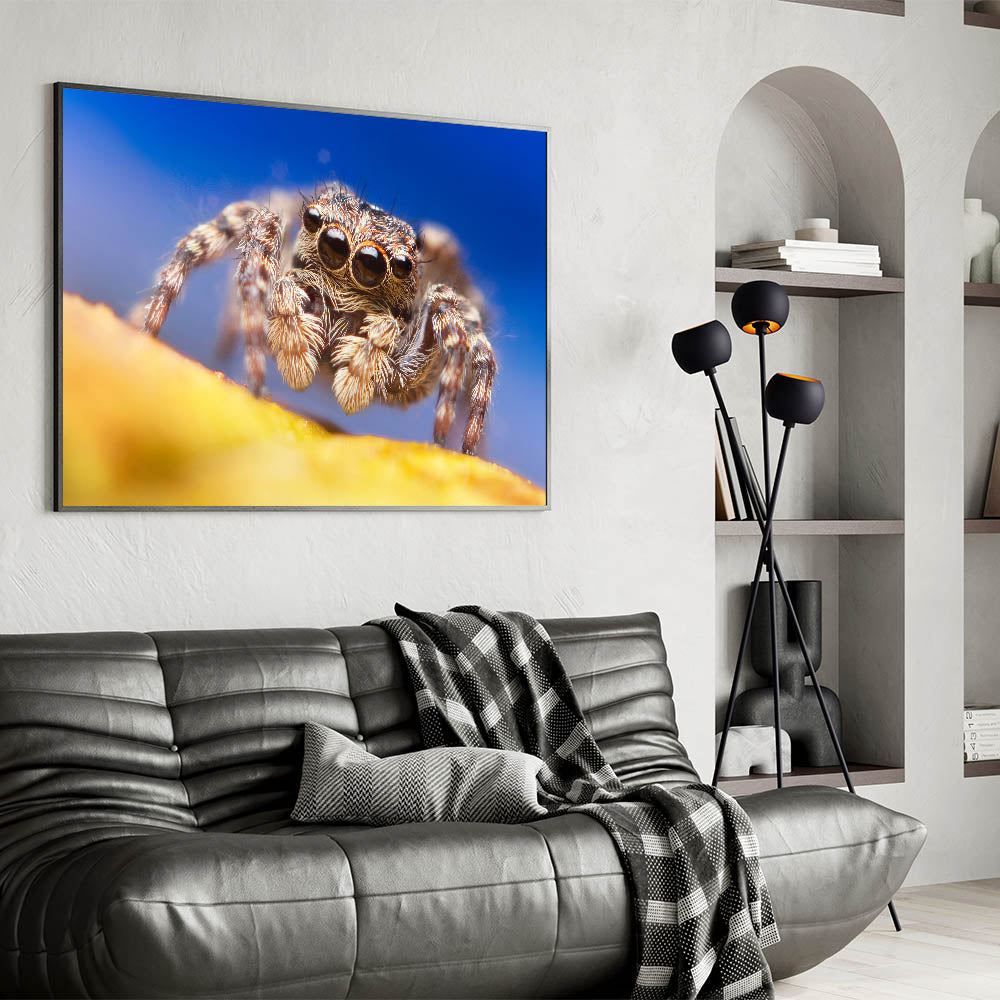 Immerse yourself in the vibrant world of arachnids with this stunning spider wall art. This piece is perfect for those who appreciate the beauty of nature's smallest creatures, capturing the spider in vivid detail against a bold blue background.