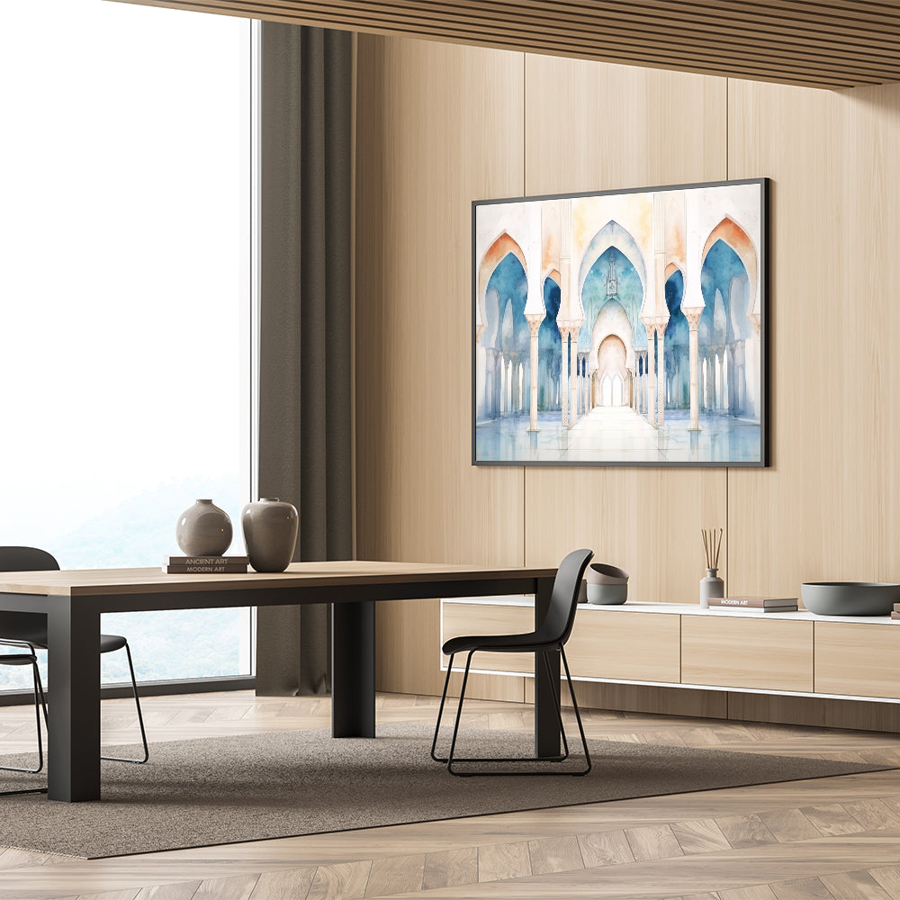 Bring tranquility and elegance into your space with this stunning watercolor wall art featuring a series of serene arches. The soft, flowing hues of blue and beige create a peaceful atmosphere, while the intricate details of the arches add a touch of architectural beauty. This piece is perfect for those who appreciate the blend of art and architecture and wish to add a calming and sophisticated element to their decor.