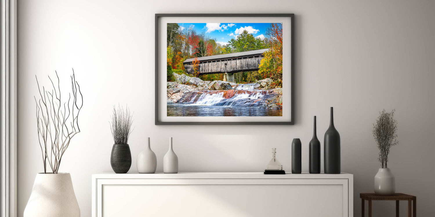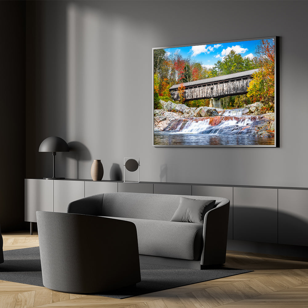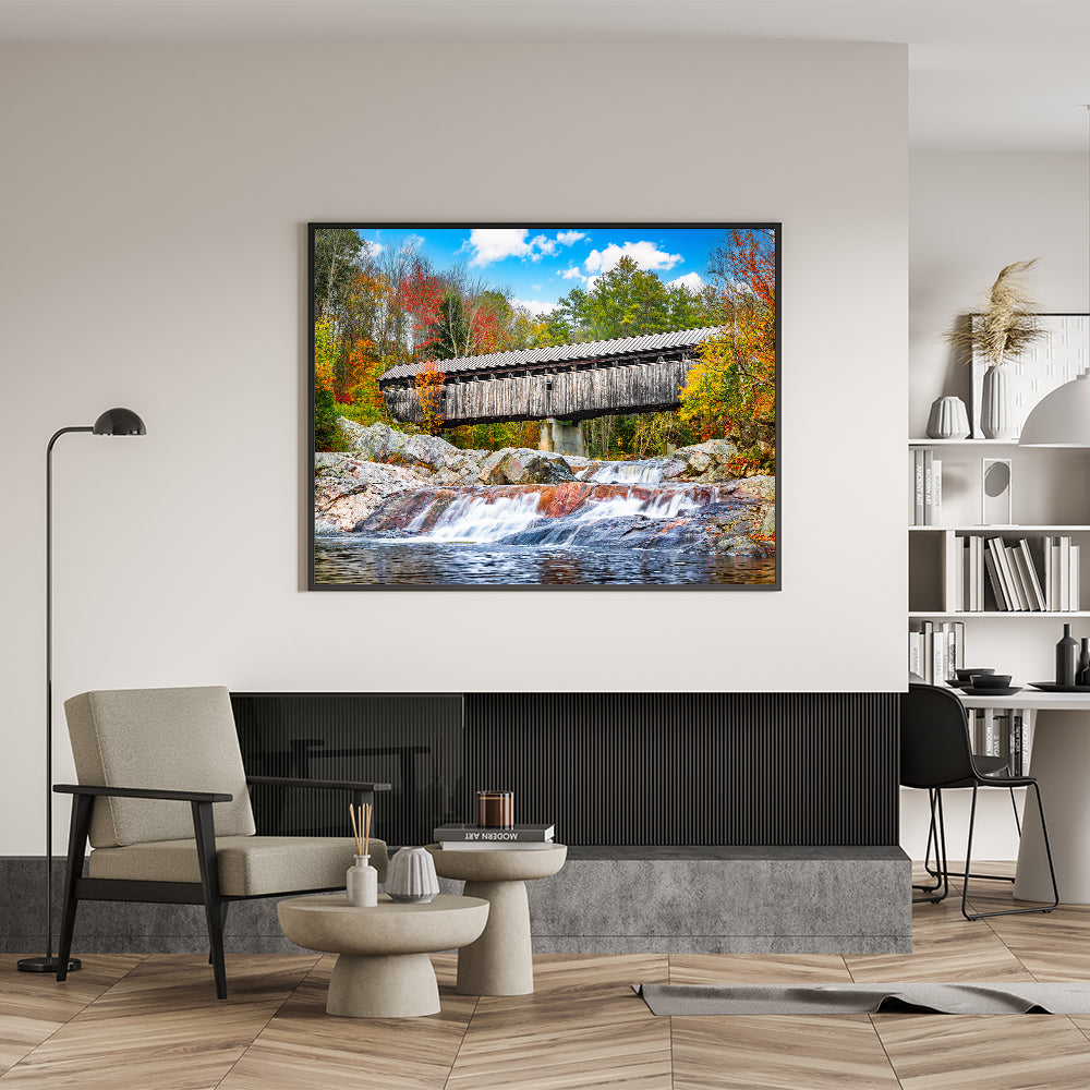 Waterfall Covered Bridge Wall Art – Scenic Landscape Canvas & Prints