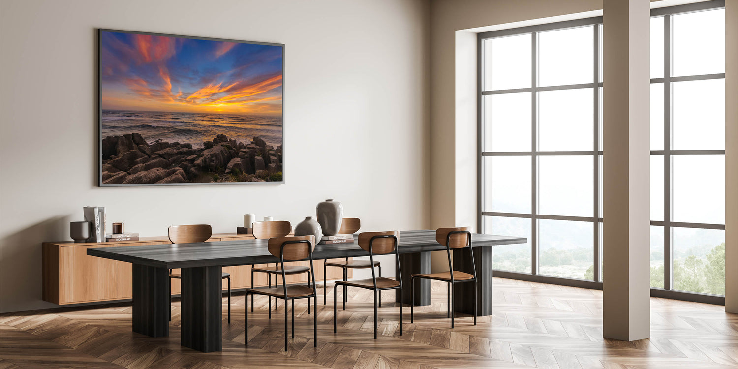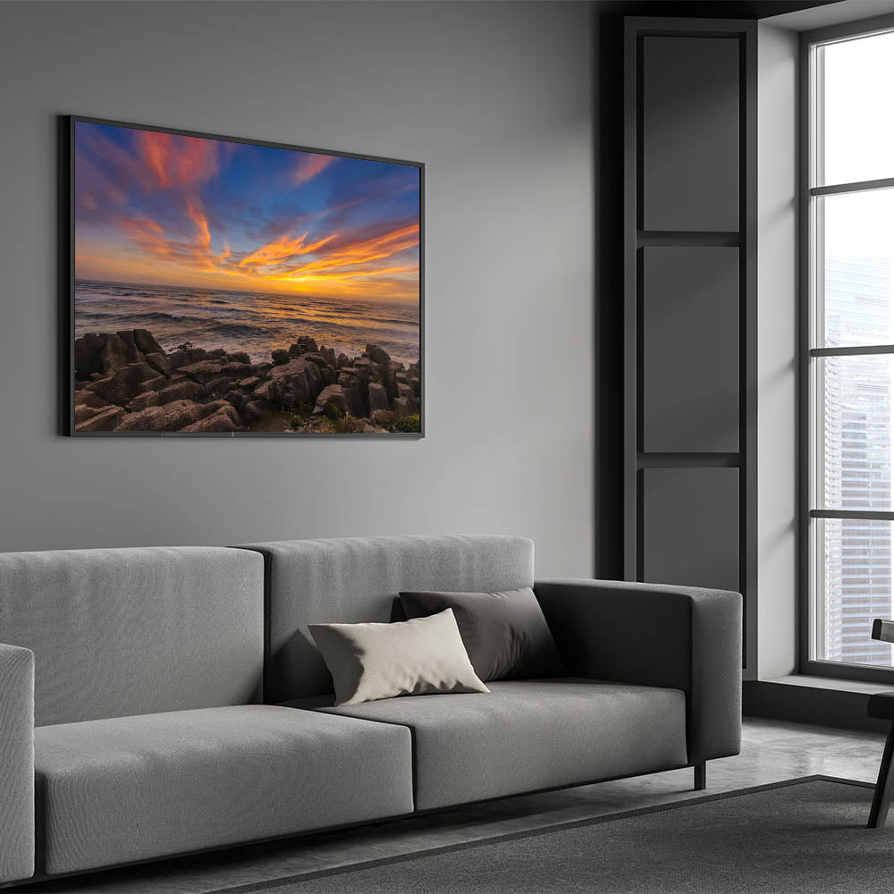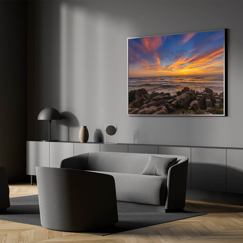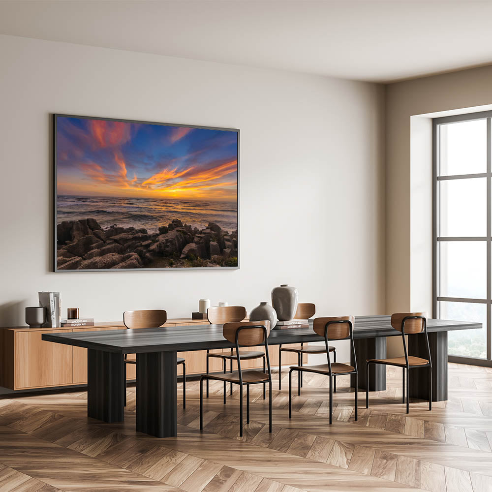 Capture the magic of a West Coast sunset with this vibrant West Coast New Zealand Wall Art. This stunning piece features a fiery sky meeting the calm ocean, where the rugged coastal rocks add texture and depth to the scene. Perfect for nature lovers and coastal enthusiasts, this scenic wall art will bring a touch of New Zealand’s natural beauty into your home or office.
