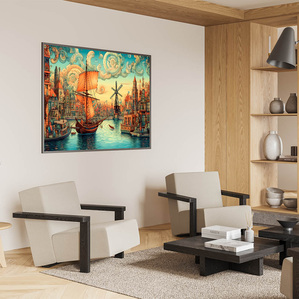 Step into a world of imagination with this Whimsical Harbor Town & Windmill canvas art. This vibrant and detailed artwork brings to life a fantastical harbor town, complete with charming houses, sailing ships, and a towering windmill. The swirling clouds and exaggerated architectural details create a dreamlike atmosphere, making this piece a perfect choice for those who appreciate art with a playful and imaginative twist.