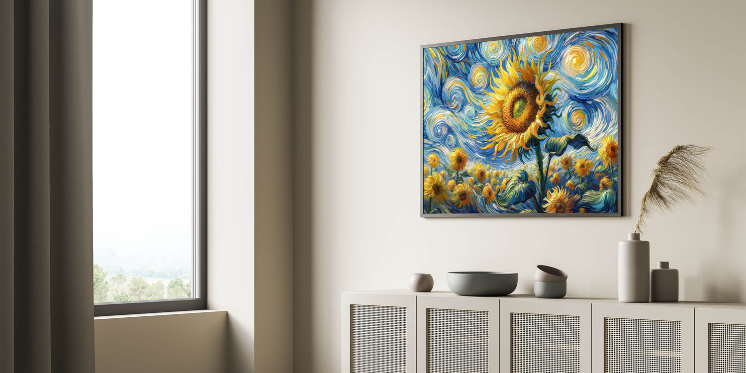 - Artistic sunflower artwork with vivid colors and swirling textures that capture attention