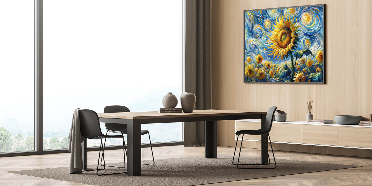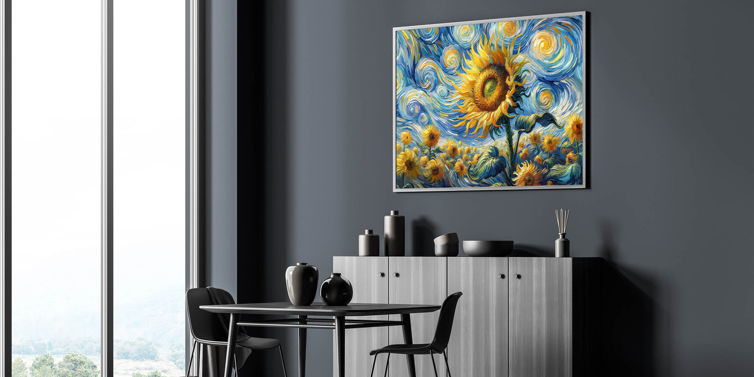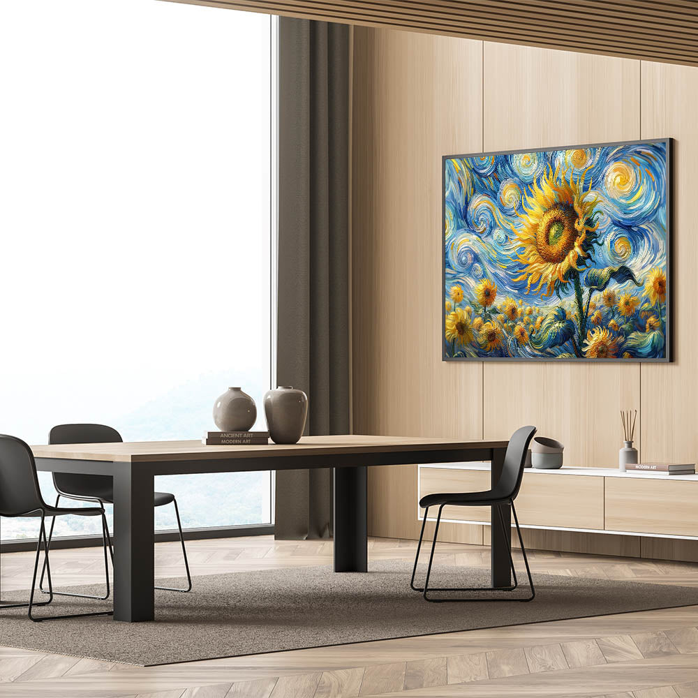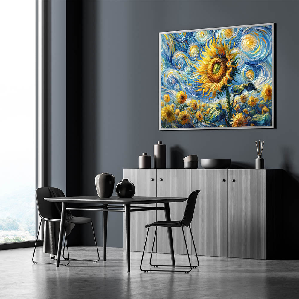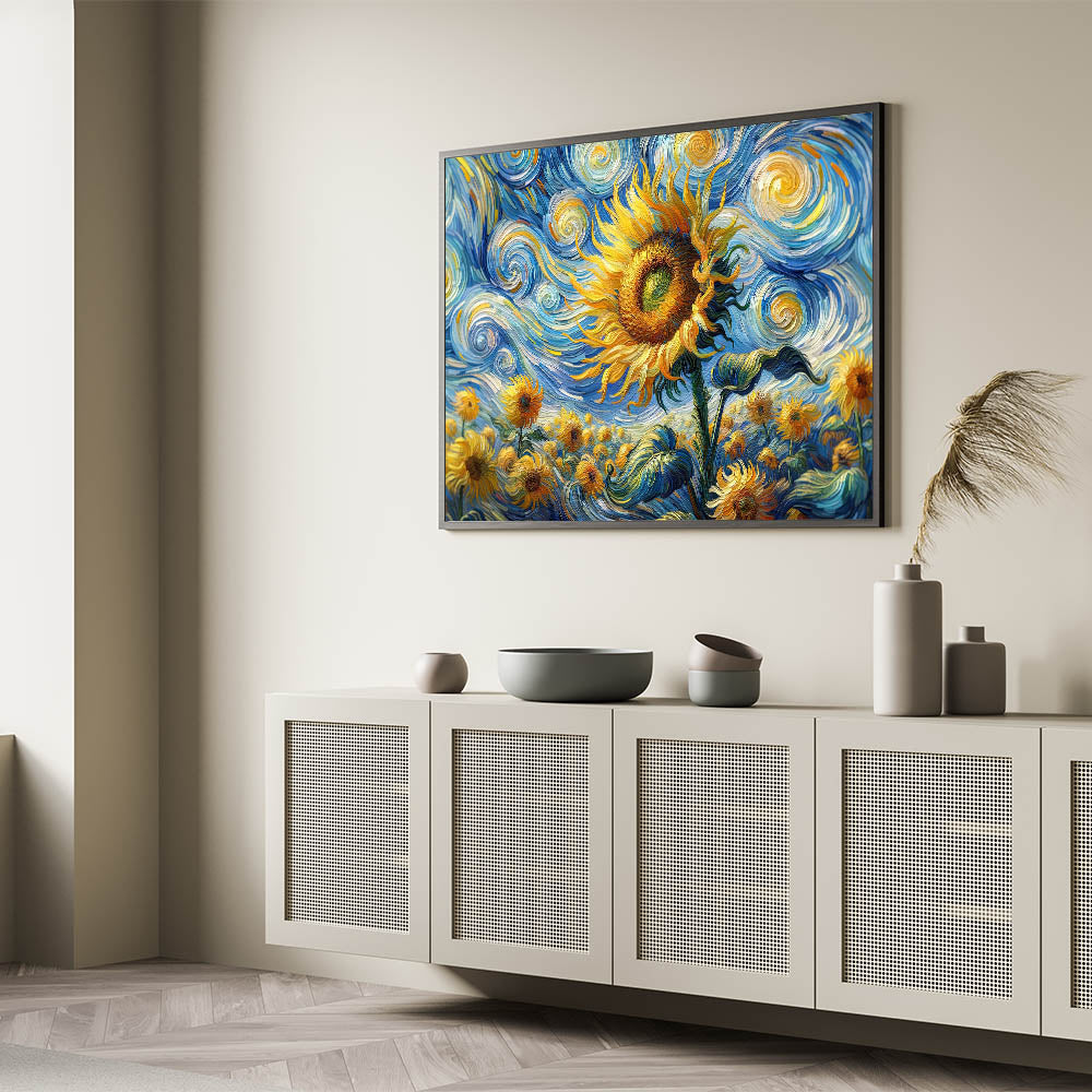 Transform your space with this enchanting sunflower wall art. Featuring swirling brushstrokes and a vibrant palette of blues, yellows, and greens, this piece brings the sunflower to life in an imaginative and playful way. The dynamic, swirling sky adds a sense of movement and whimsy, making it a perfect statement piece for any room. This sunflower canvas print is ideal for those who love bold and artistic designs that radiate positive energy.