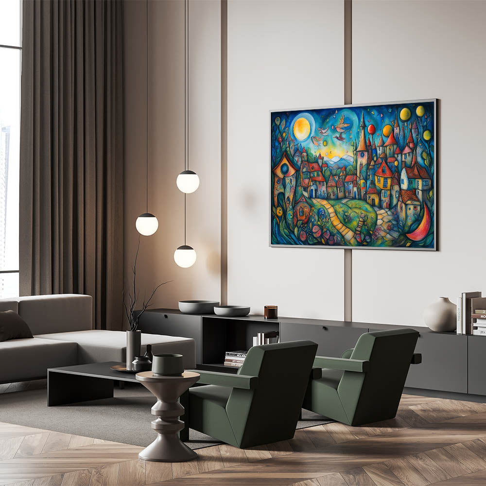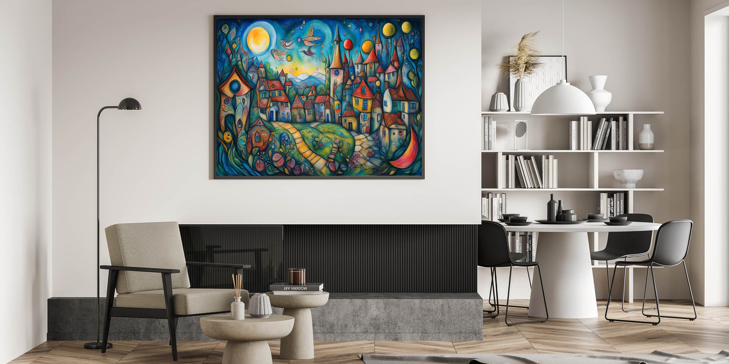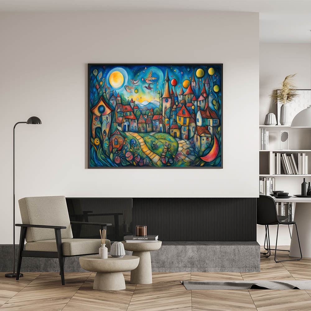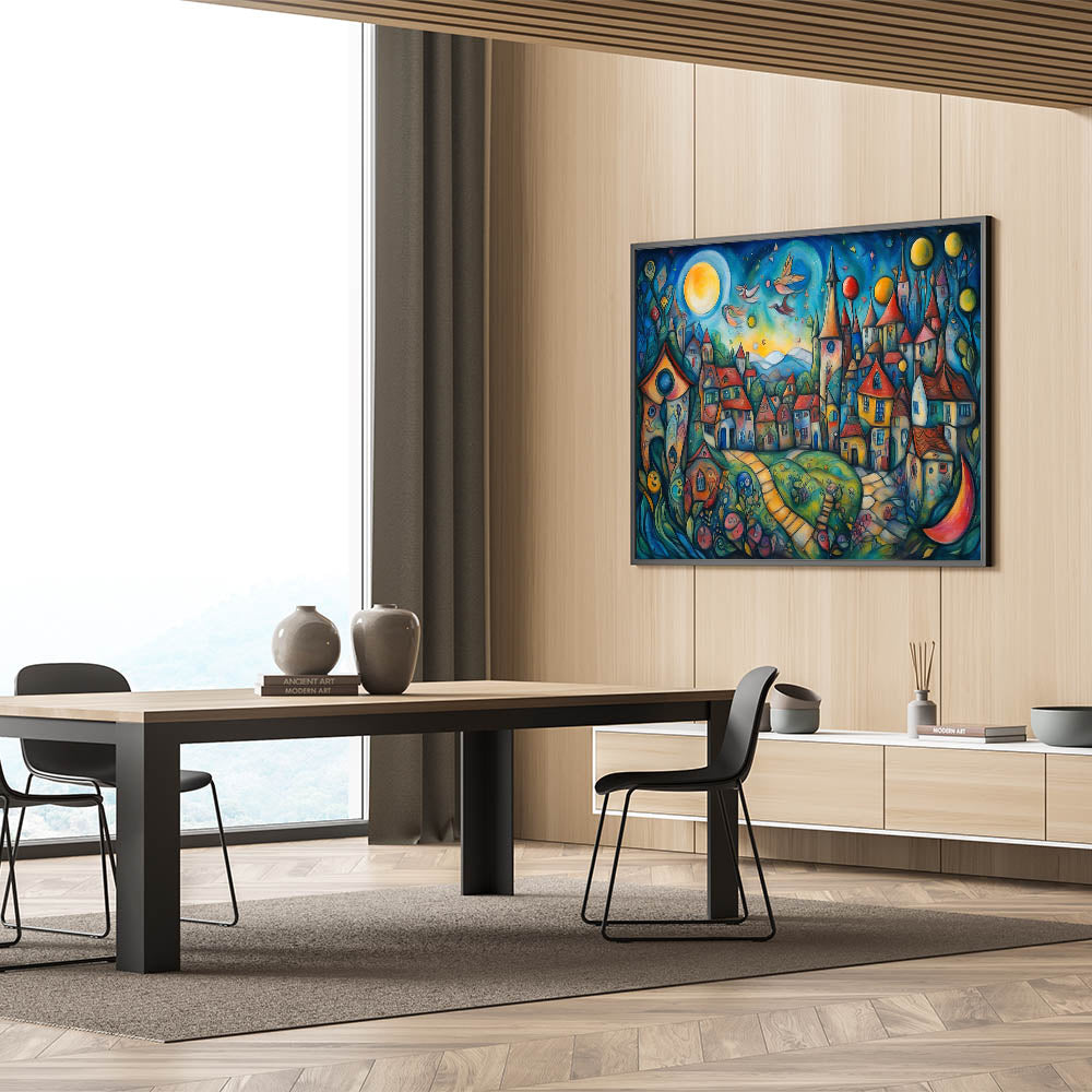 Step into a world of imagination with this vibrant village landscape painting that exudes whimsy and charm. The artwork depicts a fantastical village filled with colorful, abstract houses under a brilliant moonlit sky. Birds soar through the air, and playful shapes dance across the scene, creating a dreamlike atmosphere. The bold use of color and fluid lines make this piece a captivating addition to any space that craves a touch of creativity and wonder.