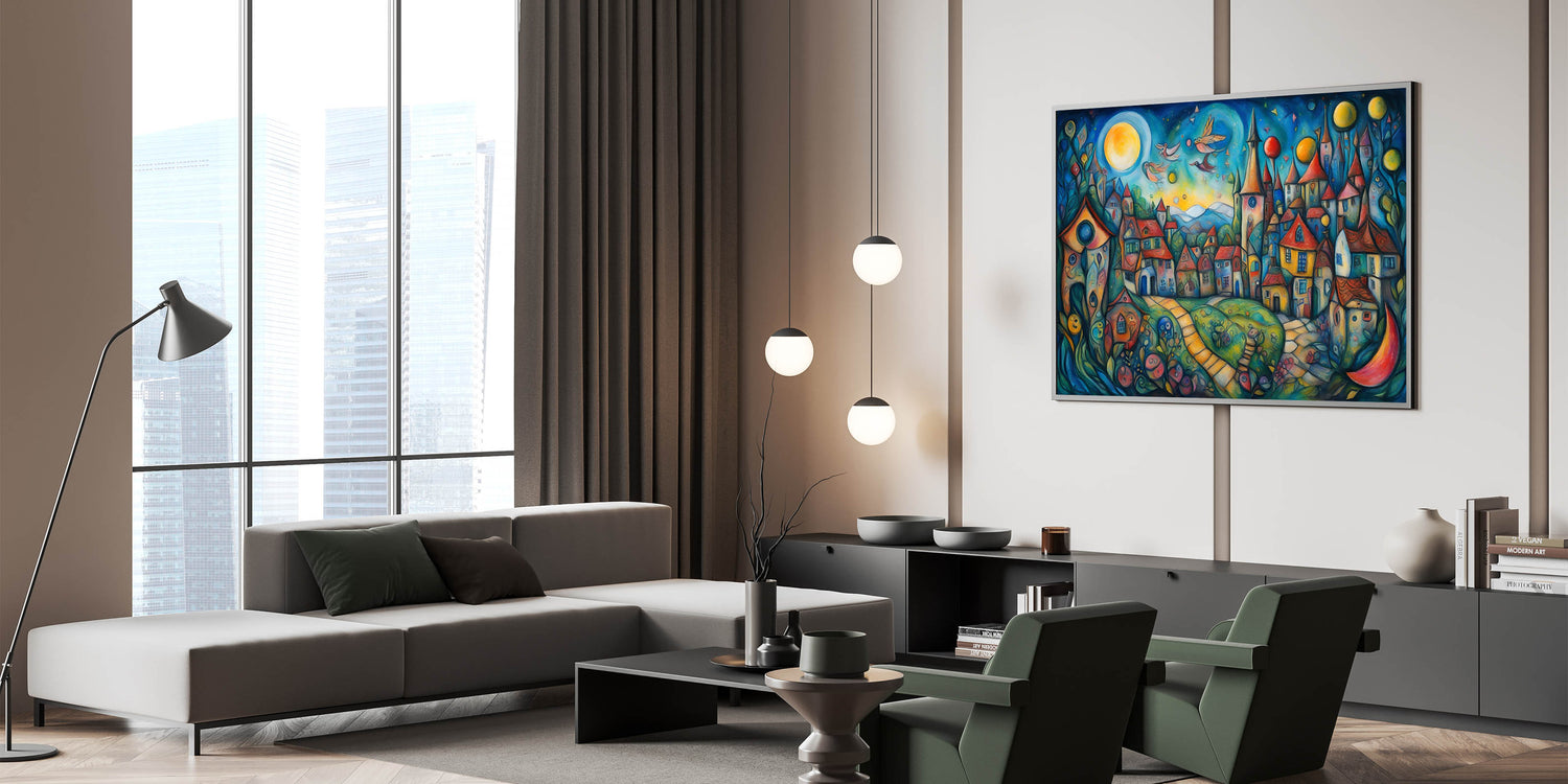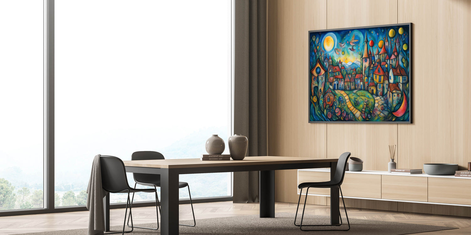 This village scene wall decor is ideal for those who love to infuse their space with artistic flair and imagination. Whether placed in a child’s room, a creative workspace, or a living area, this idyllic village canvas print will inspire joy and wonder.