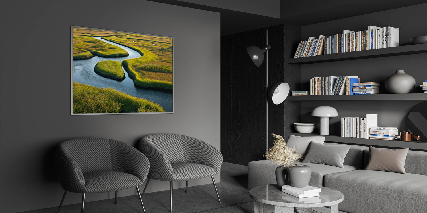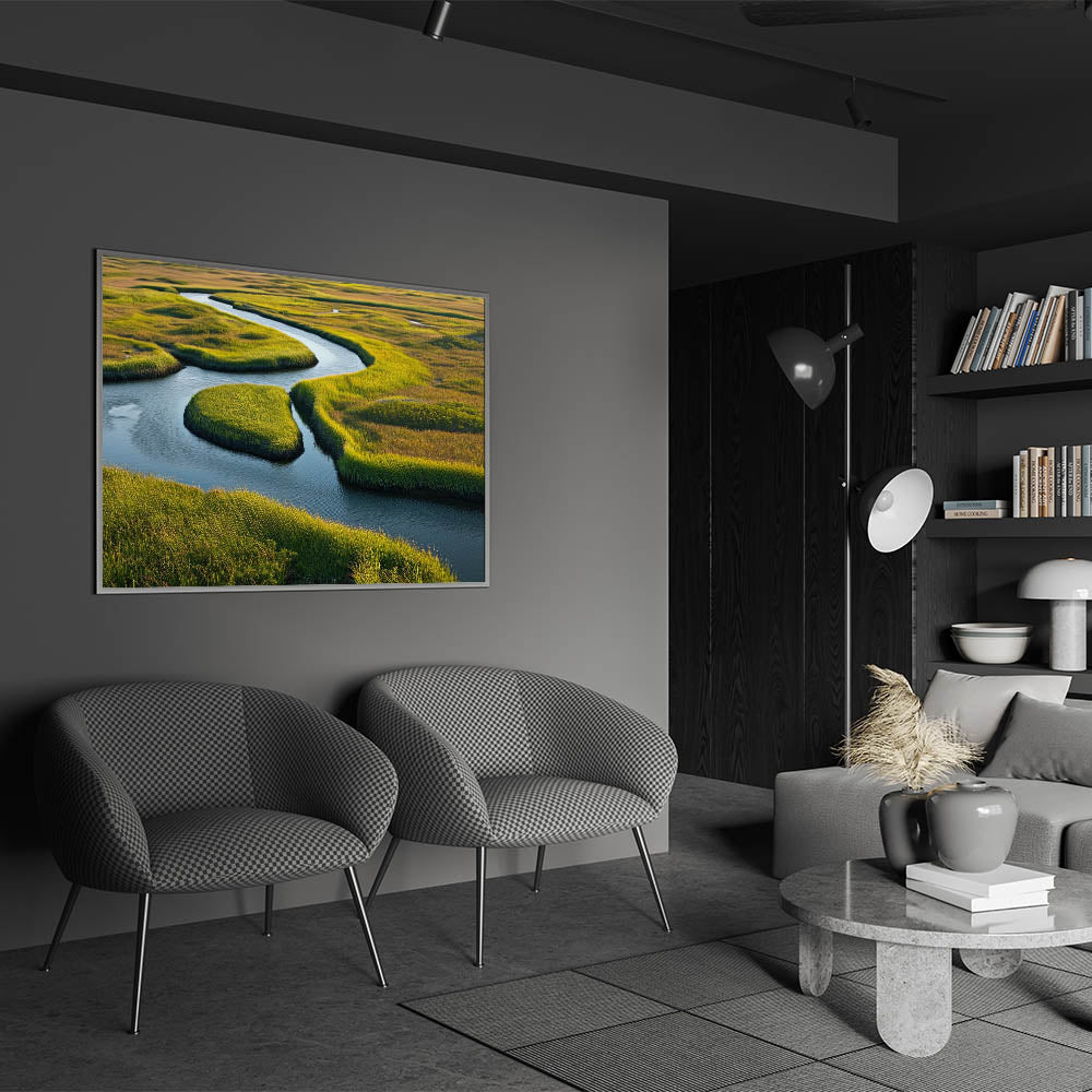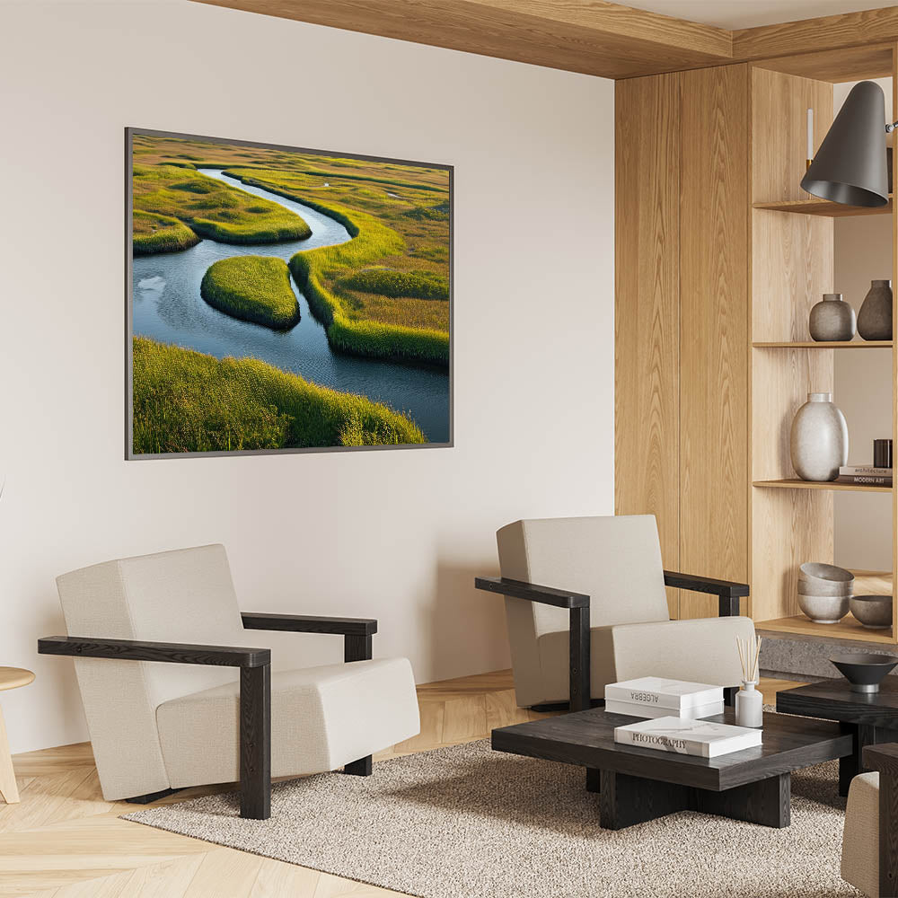 Transform your space with this beautiful depiction of a winding river through marshland, where the interplay of light, color, and natural elements creates a soothing and refreshing ambiance. Perfect for nature lovers and those looking to add a peaceful, nature-inspired element to their decor. Explore our collection of marsh and swamp wall art to find the perfect piece for your home.