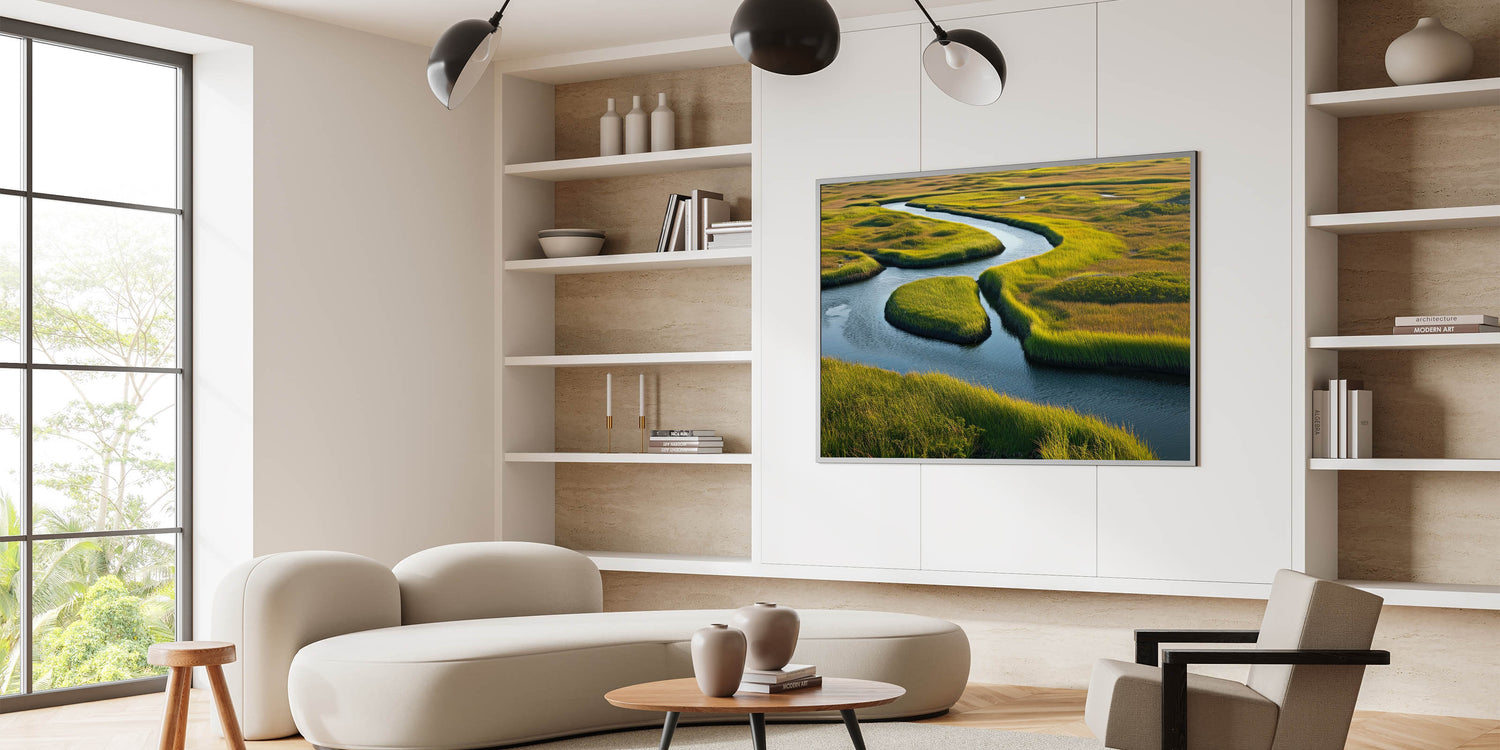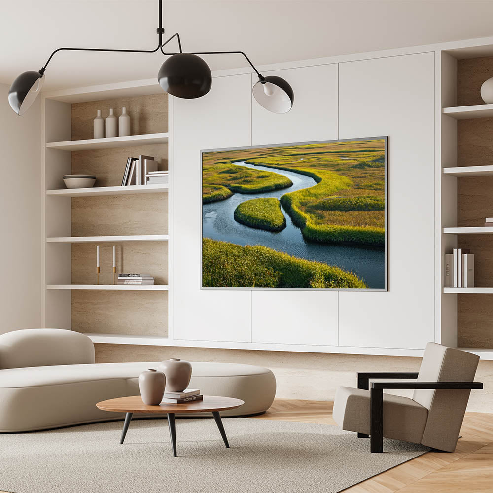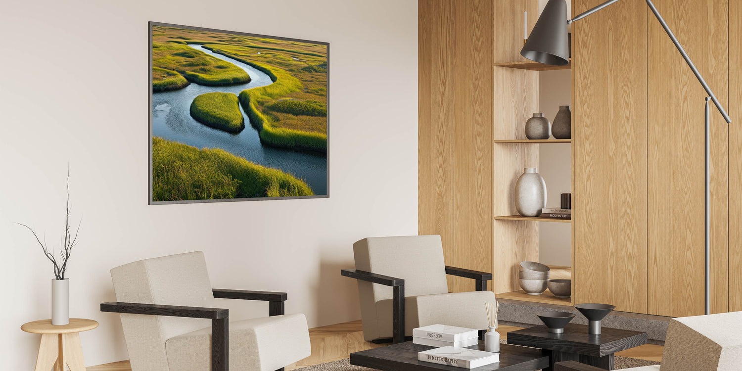 Transform your space with this beautiful depiction of a winding river through marshland, where the interplay of light, color, and natural elements creates a soothing and refreshing ambiance. Perfect for nature lovers and those looking to add a peaceful, nature-inspired element to their decor. Explore our collection of marsh and swamp wall art to find the perfect piece for your home.