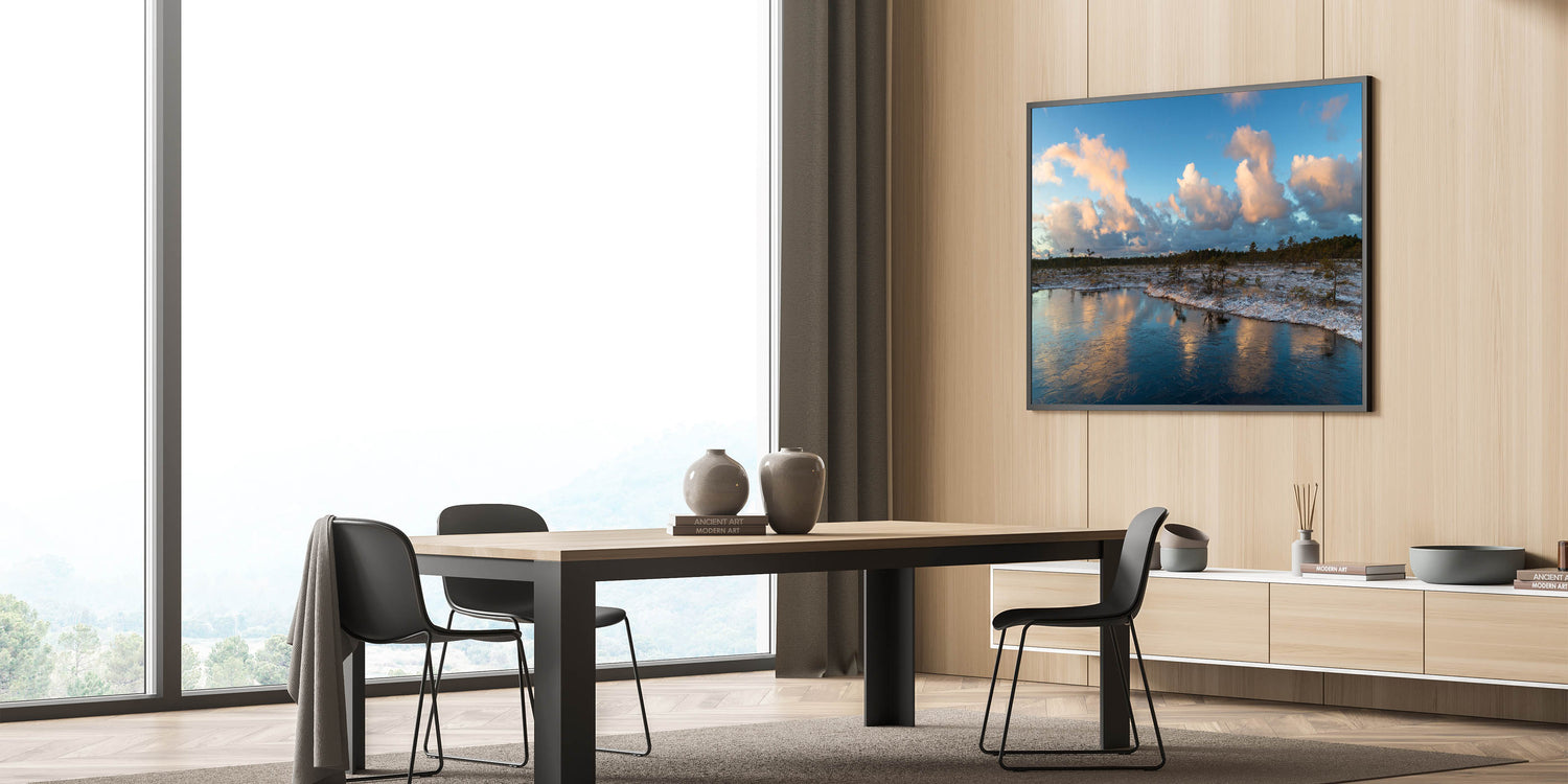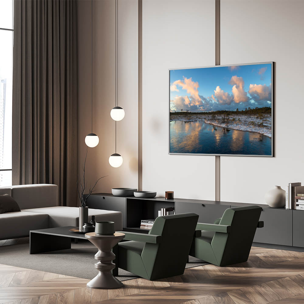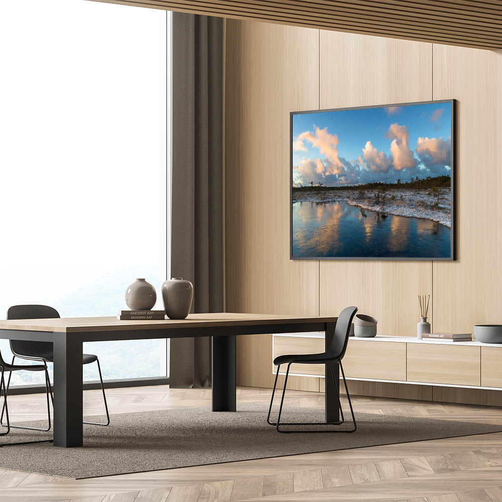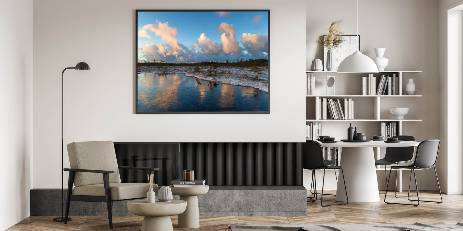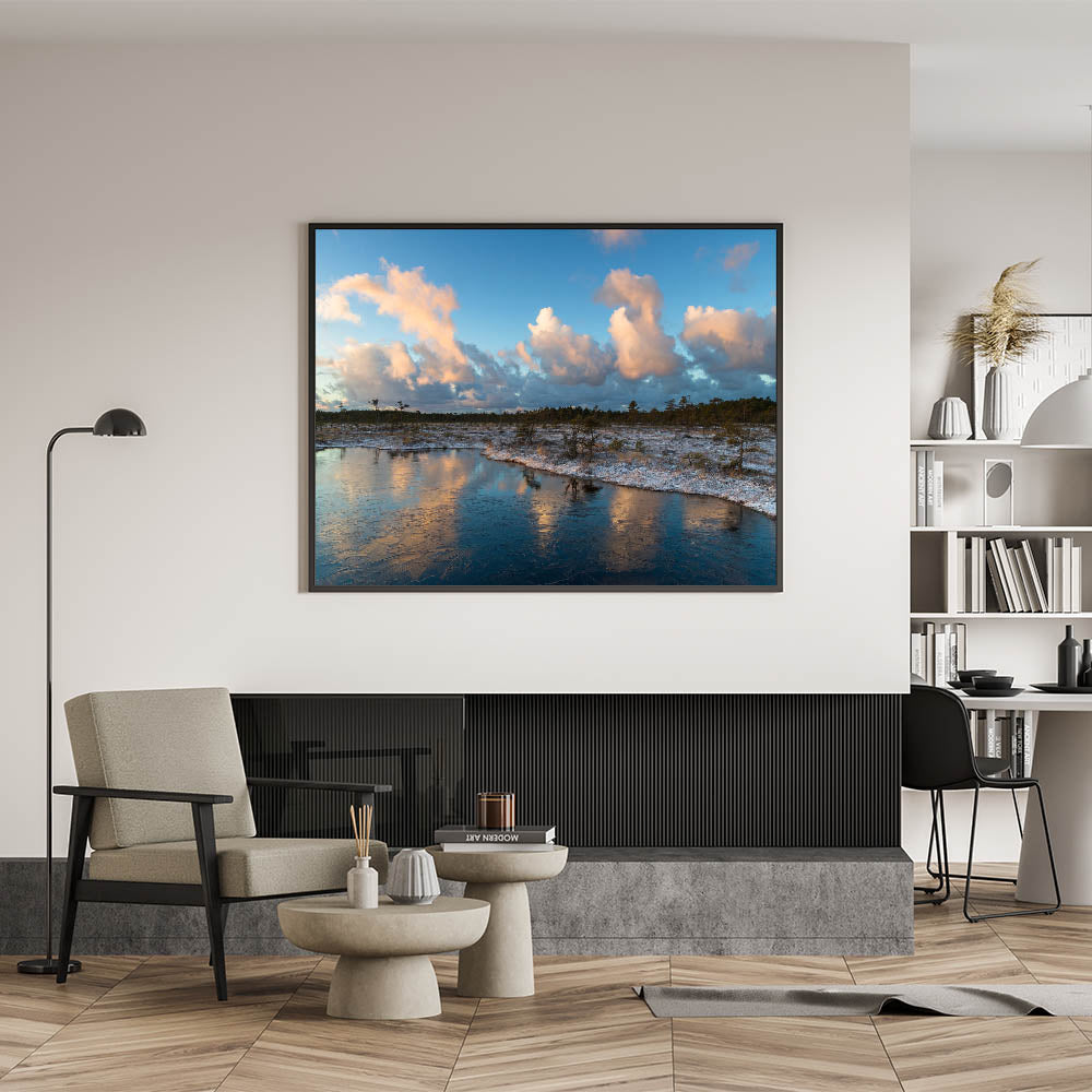 This winter marshland wall art is an exquisite piece that captures the essence of a frosty morning, offering a sense of calm and tranquility to any room.