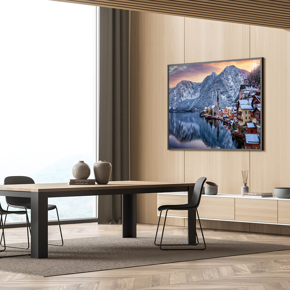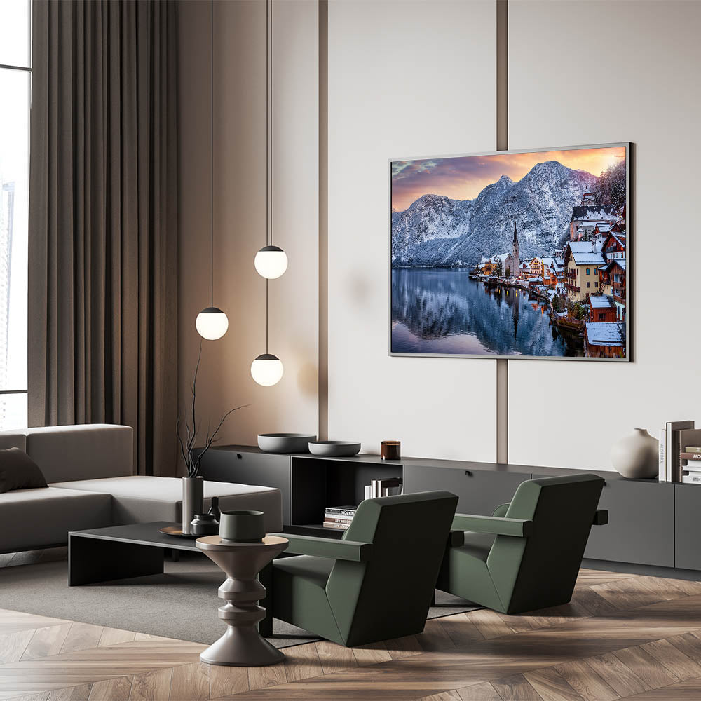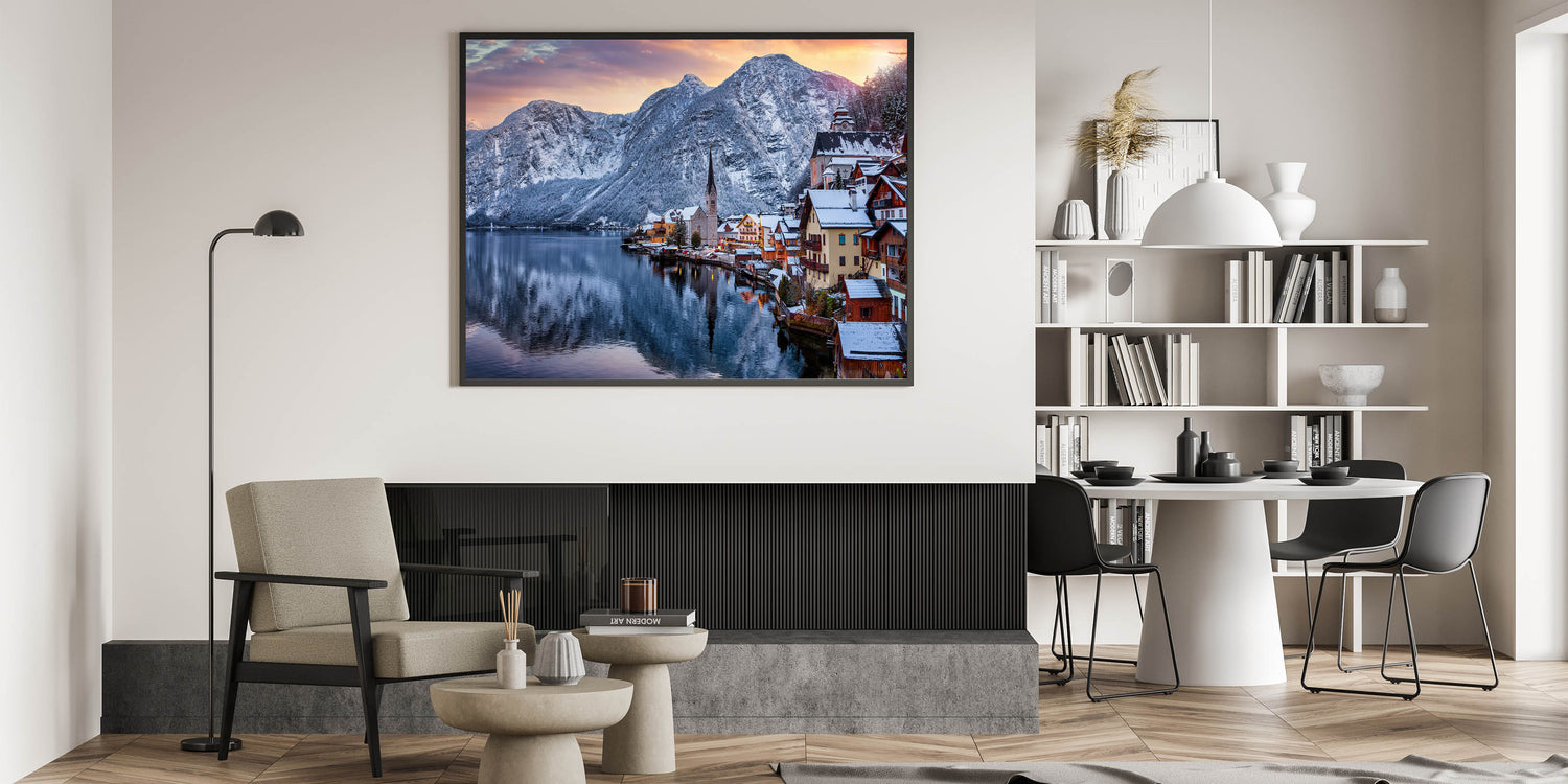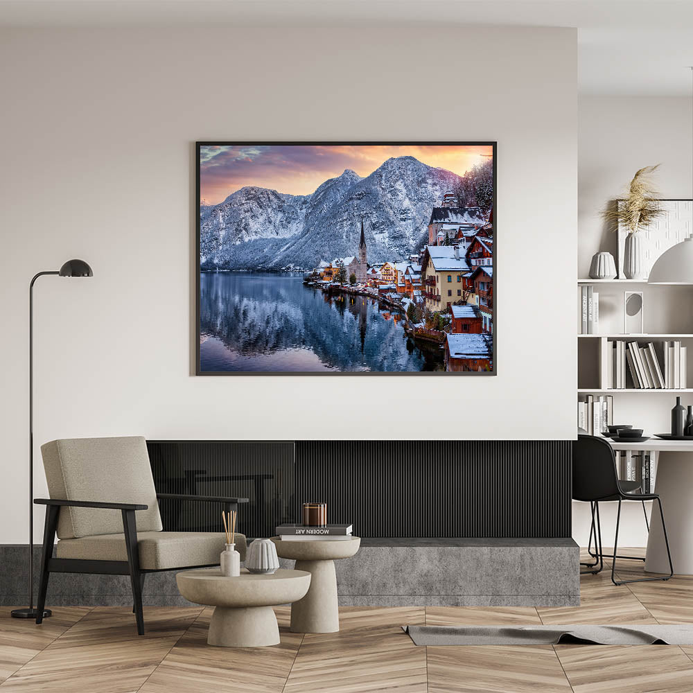 Step into the serene beauty of a winter village nestled by a tranquil lake, surrounded by majestic snow-covered mountains, with this captivating Village landscape painting. The reflection of the quaint village in the calm waters, combined with the warm glow of the sunset, creates a peaceful and idyllic scene that will bring a sense of calm to any space. This Village scene wall decor is perfect for those who appreciate the quiet elegance of winter landscapes and the charm of traditional mountain villages.