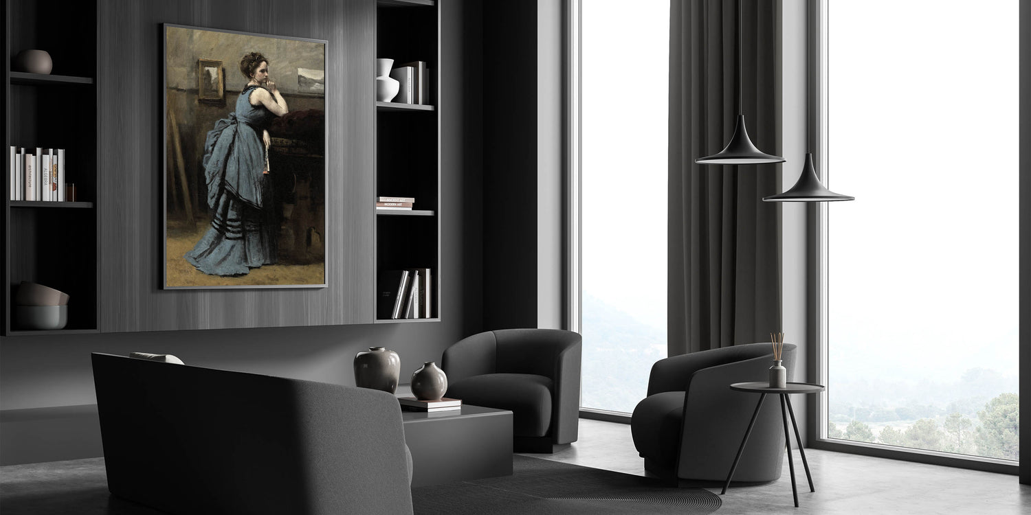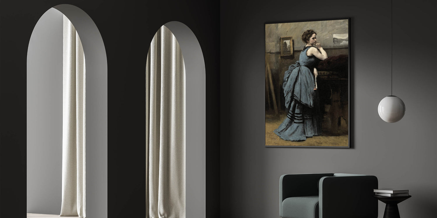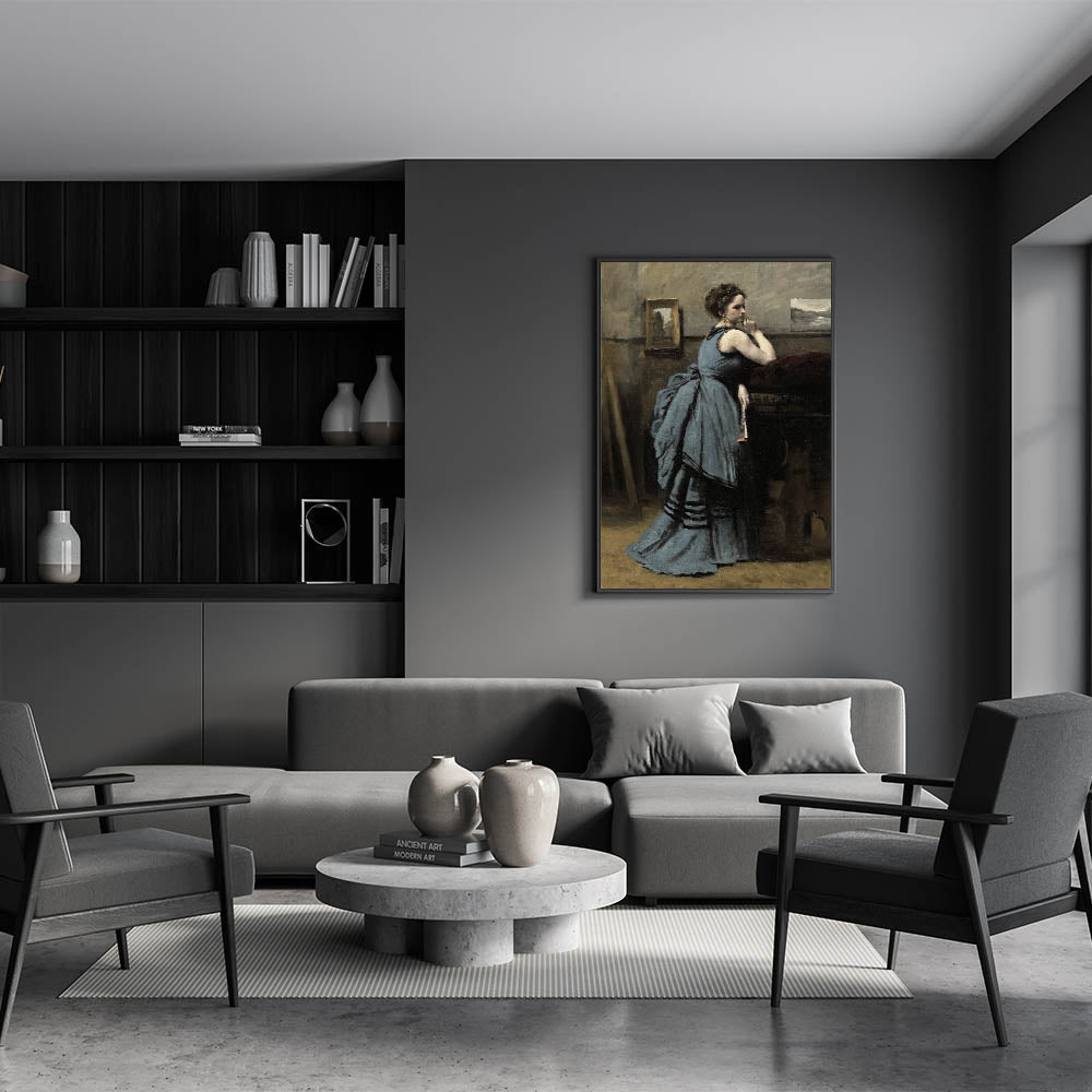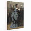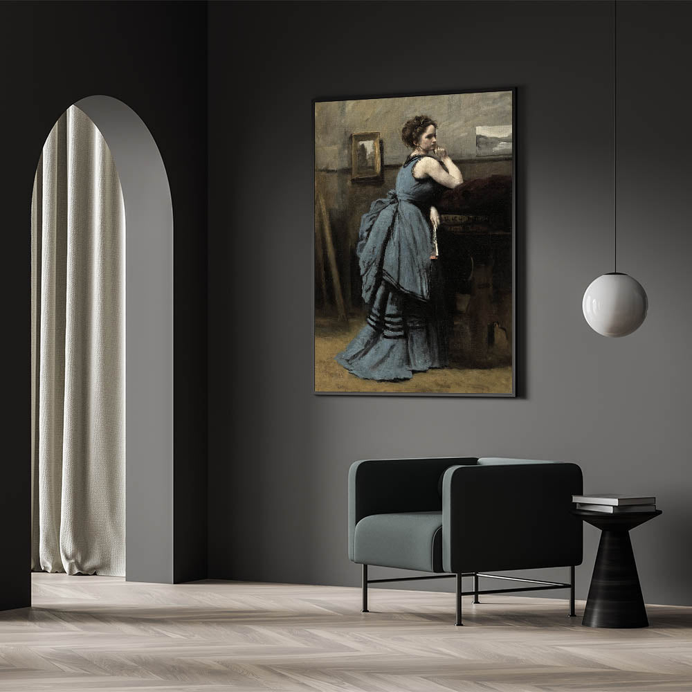 Woman in Blue Victorian Dress – Dark Academia Wall Art, Thoughtful Elegance