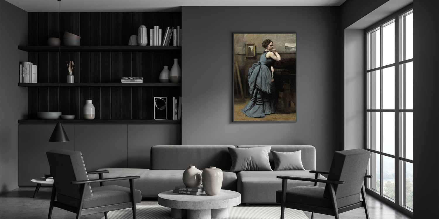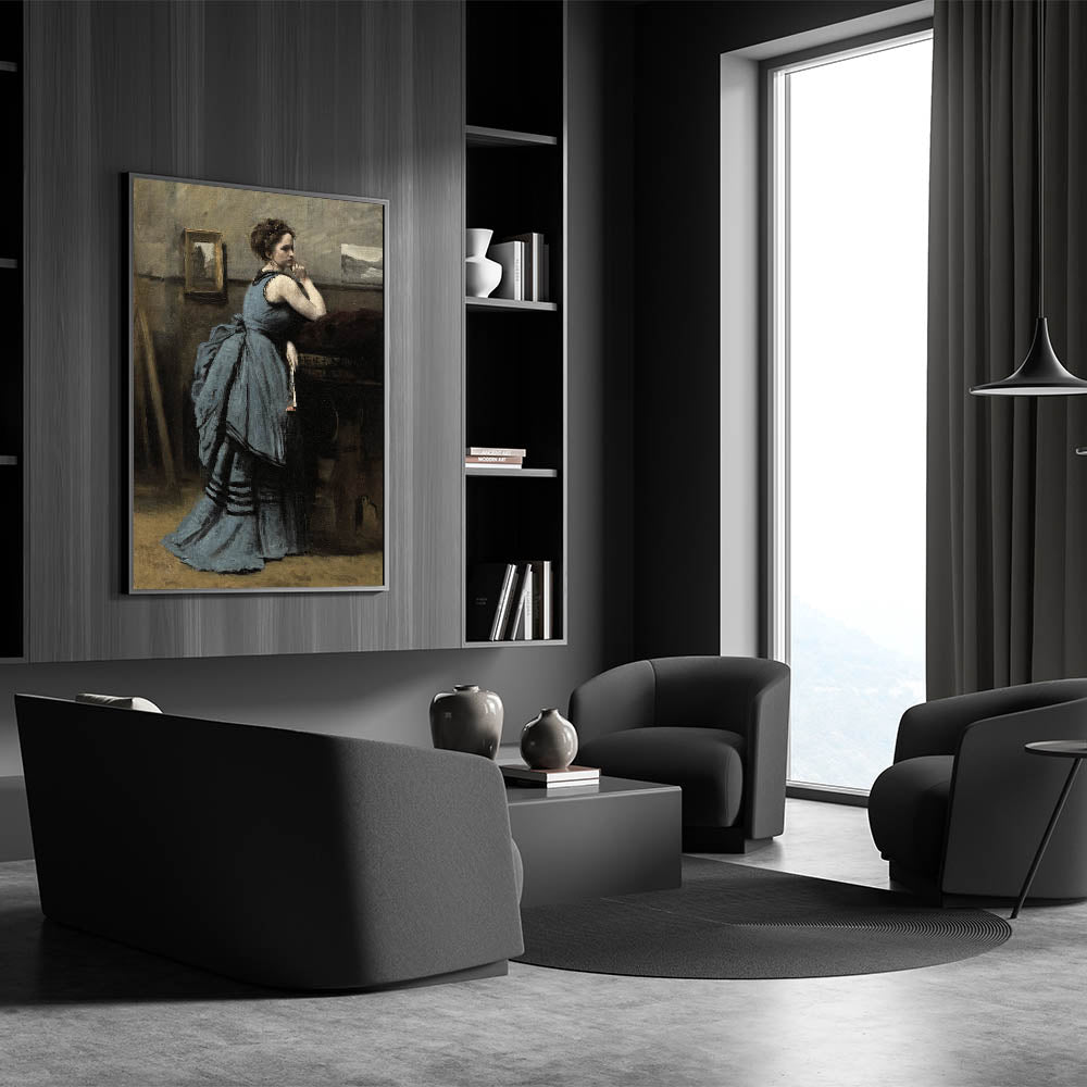 This captivating Dark Academia Wall Art features a woman in a beautifully detailed blue Victorian-style dress, leaning thoughtfully on a table. The muted tones and introspective mood of this piece create a sense of quiet reflection and elegance, making it ideal for spaces that embrace Moody Aesthetic Decor. The intricate folds of her dress, paired with the soft, shadowed background, evoke the historical charm of Vintage Gothic Prints.