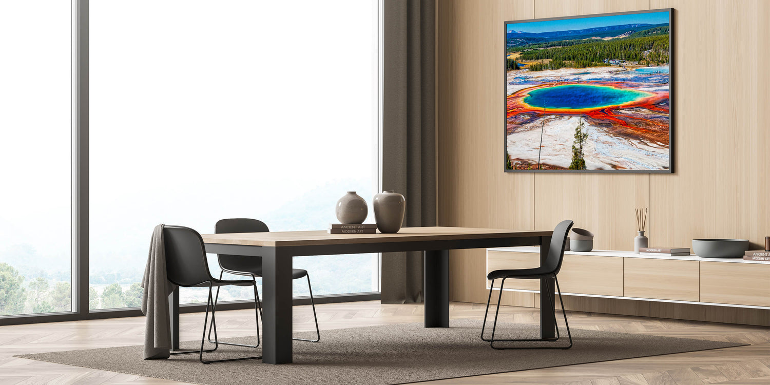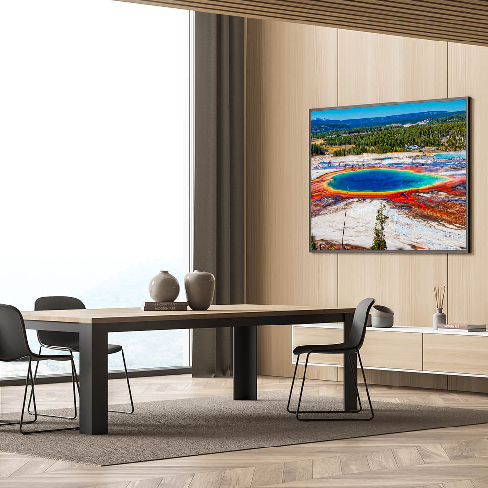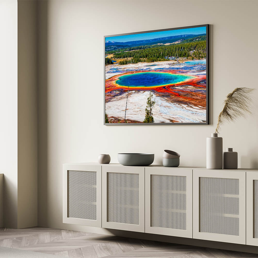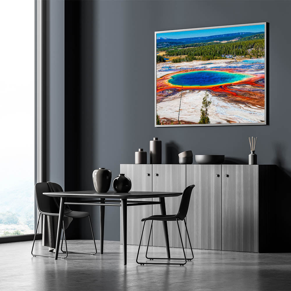 This Yellowstone scenic art perfectly captures the stunning hues of the Grand Prismatic Spring, making it a vibrant and eye-catching addition to any home, office, or gallery wall.