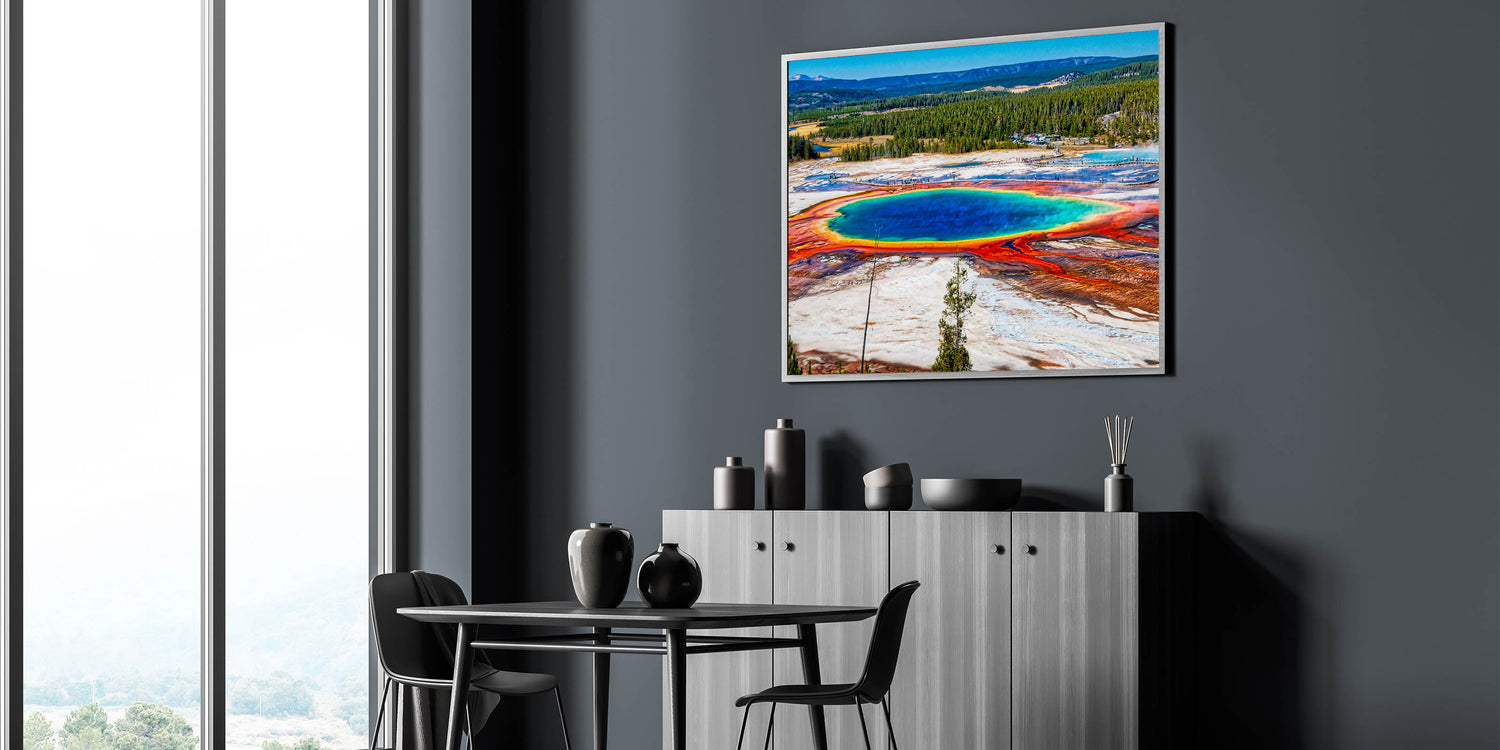 Experience the extraordinary beauty of Yellowstone National Park with this stunning Yellowstone National Park wall art, showcasing the iconic Grand Prismatic Spring. The bold, vibrant colors of the spring, from deep blues to fiery oranges and reds, create a mesmerizing view that will bring the awe of Yellowstone into your home. Available as Yellowstone canvas prints, framed art, and more, this piece is perfect for anyone looking to add a striking focal point to their living space.