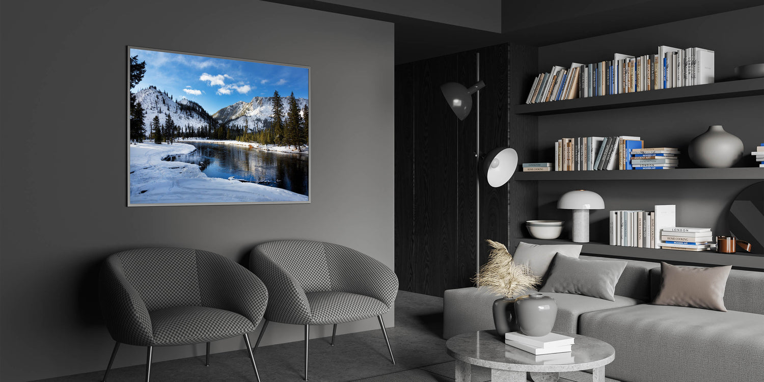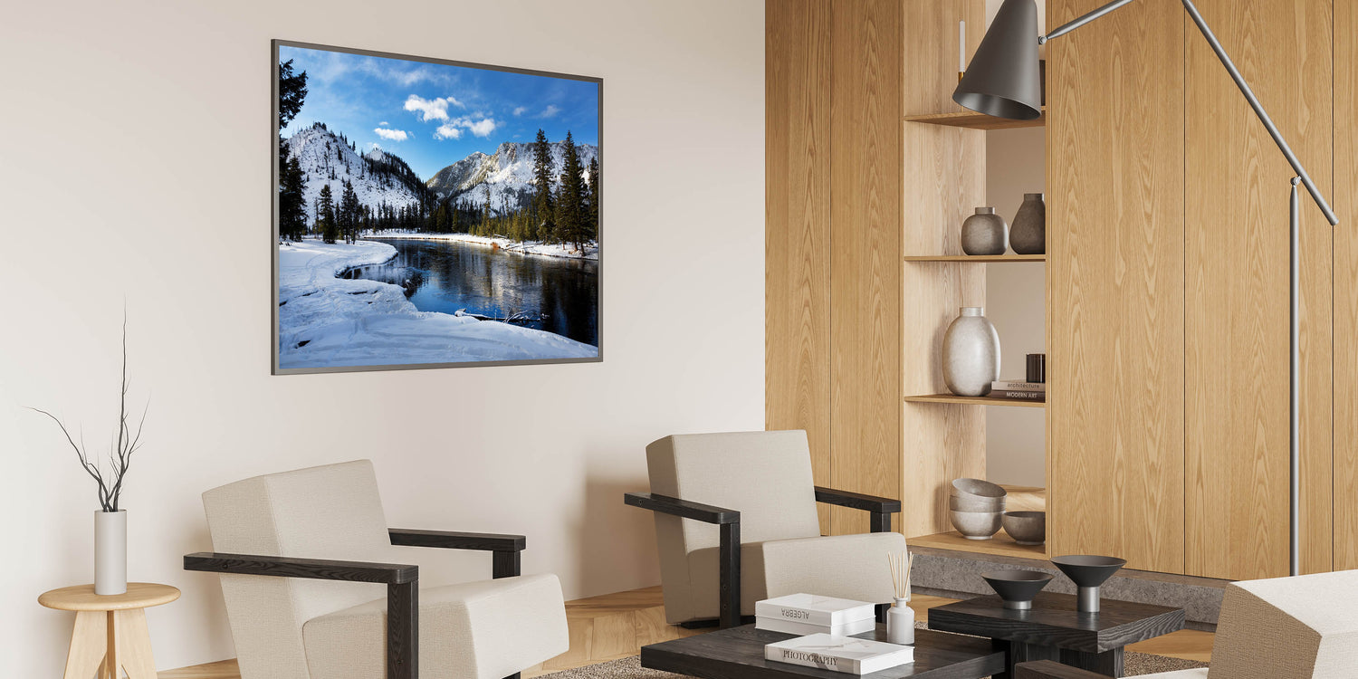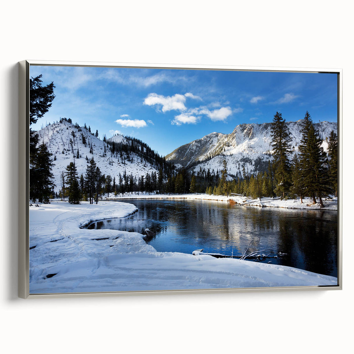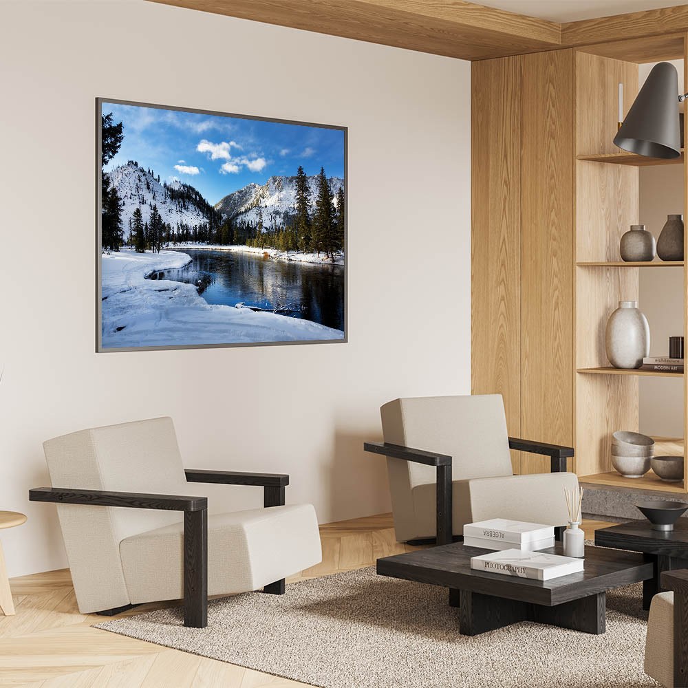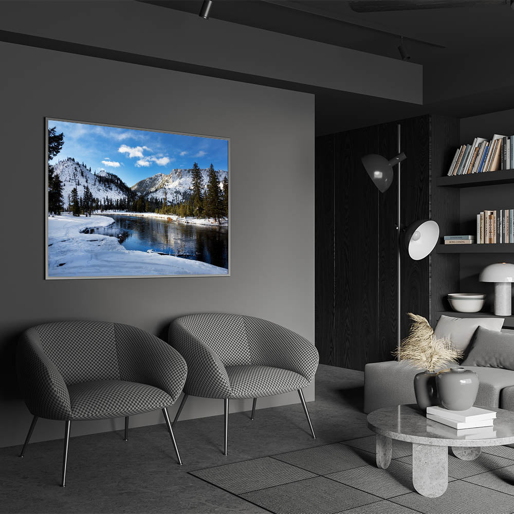Experience the peaceful beauty of winter in Yellowstone National Park with this Yellowstone National Park wall art. Featuring a snow-covered landscape and a tranquil river surrounded by majestic mountains, this Yellowstone poster print captures the serene essence of the park in the winter months. The calm reflection of the mountains on the still water adds a perfect balance to this picturesque scene, making it an ideal piece for those seeking nature-inspired wall decor.