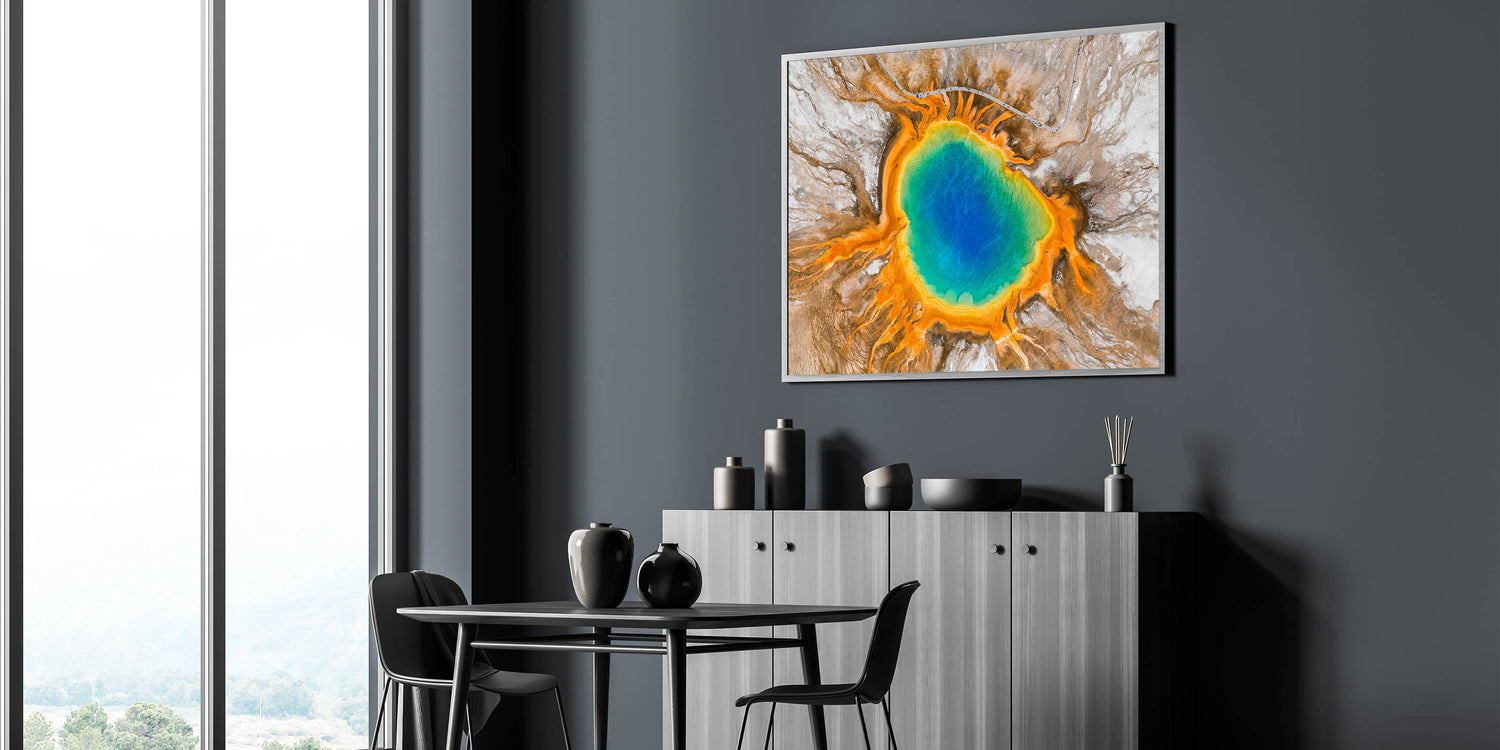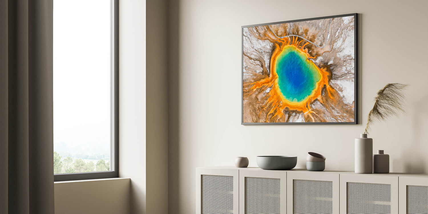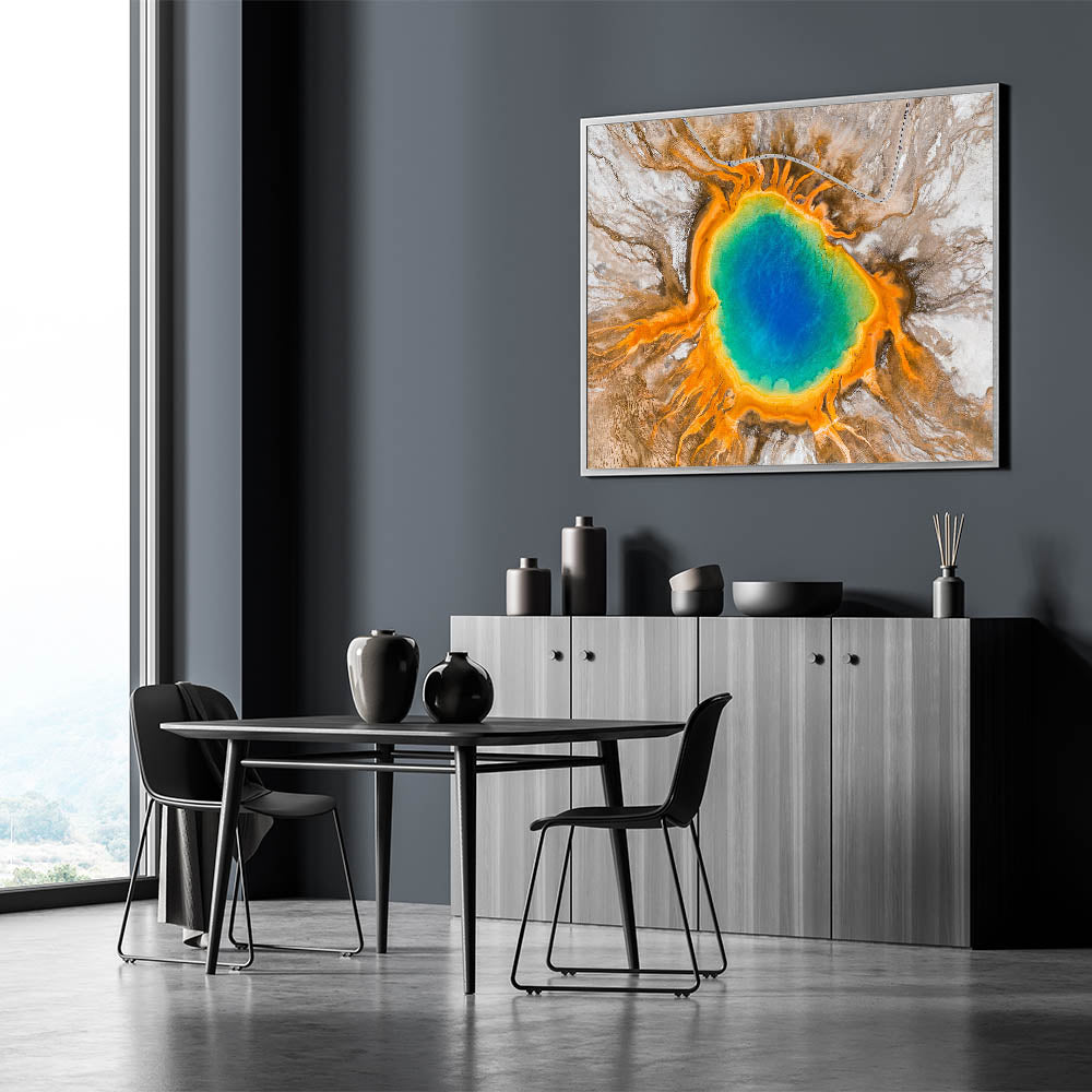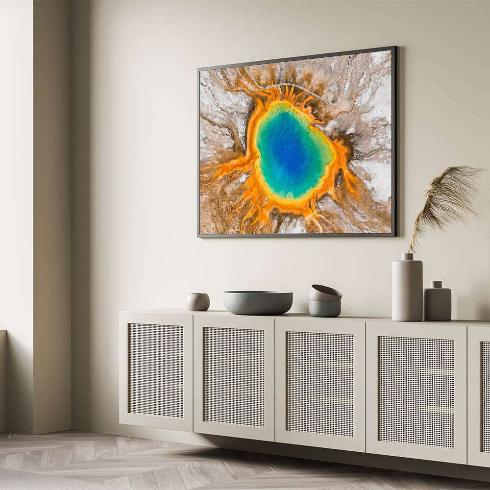 Experience the vibrant colors and natural beauty of Yellowstone National Park with this breathtaking Yellowstone National Park wall art. Featuring an aerial view of the iconic Grand Prismatic Spring, this stunning piece showcases the vibrant orange, turquoise, and blue hues of the park's most famous geothermal feature. Available in multiple formats, from Yellowstone canvas prints to framed art, this piece is perfect for adding a dynamic and colorful touch to your decor.
