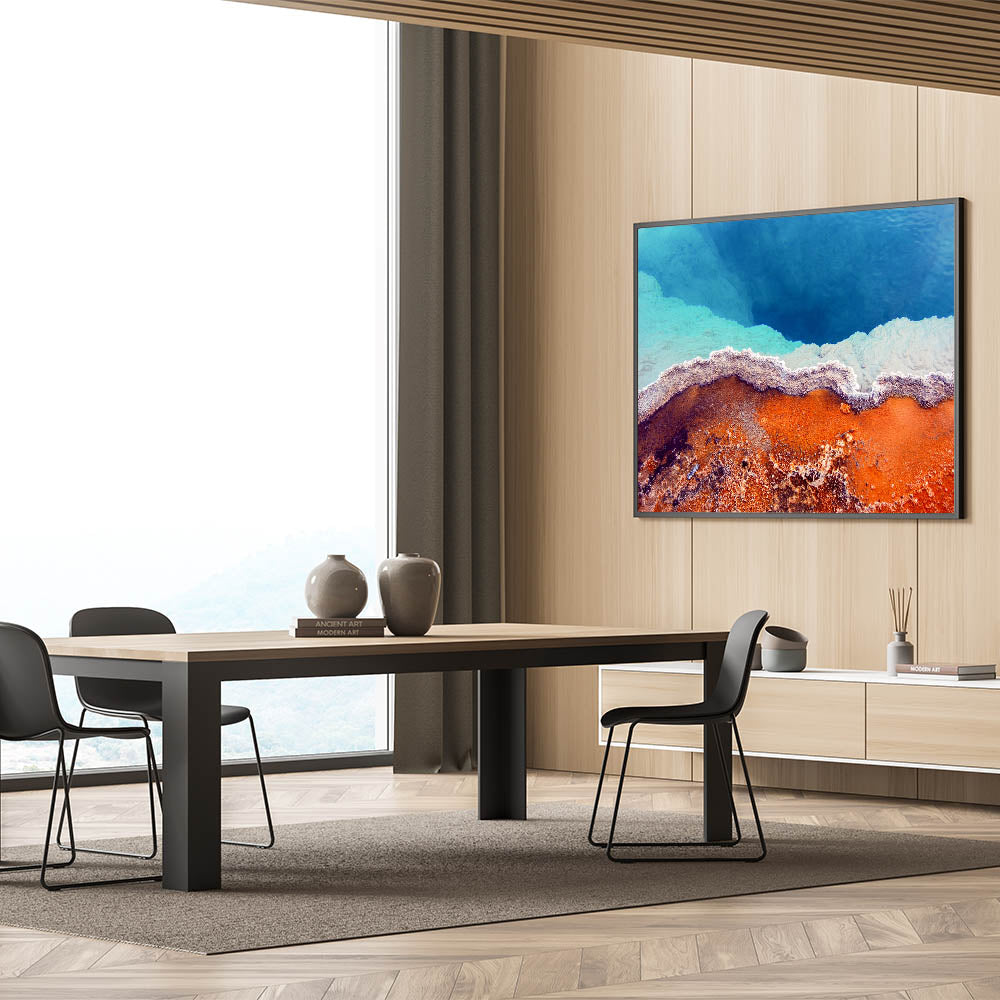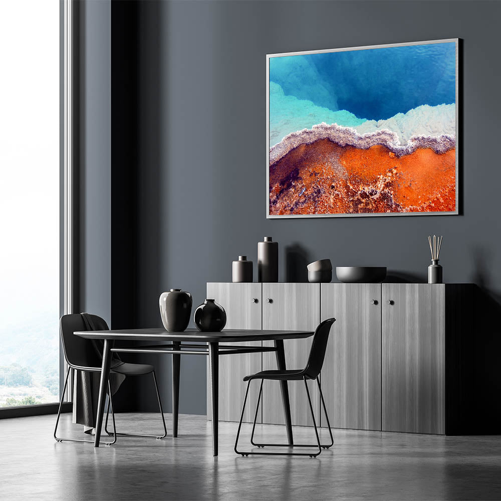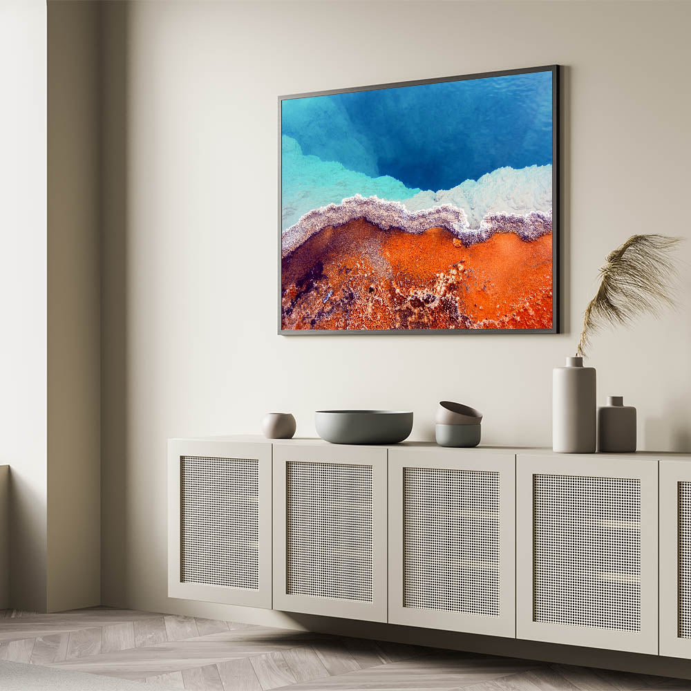 This stunning piece of Yellowstone National Park wall art captures the striking contrast of colors and textures in one of Yellowstone's geothermal springs. The rich orange, deep blue, and intricate white mineral deposits create an abstract yet natural composition that makes this Yellowstone photography perfect for modern and nature-inspired decor. Available in Yellowstone canvas prints, framed art, and more, this vibrant piece will add a bold touch to any room.